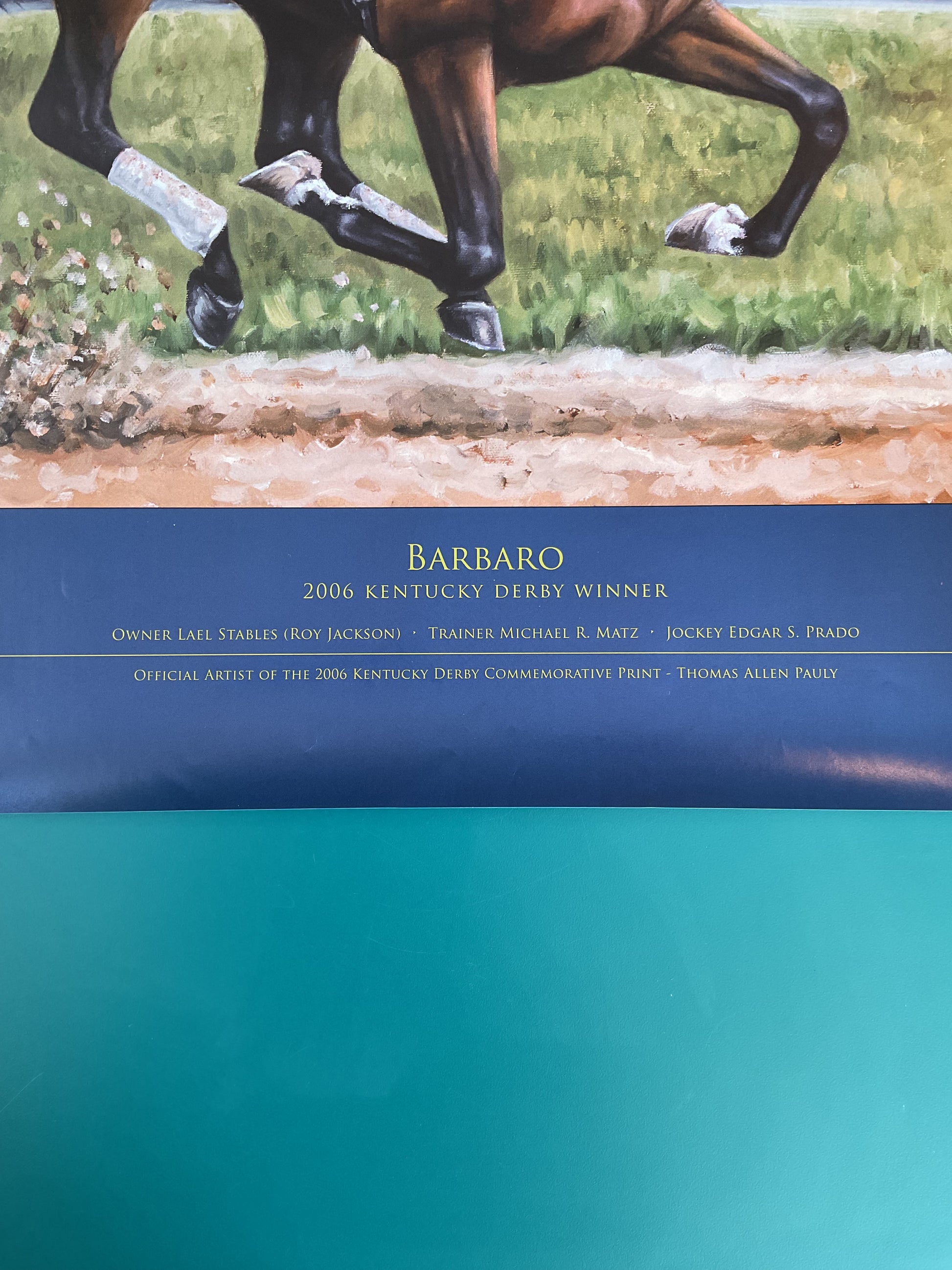 This poster depicts the winner of the 2006 Kentucky Derby Barbaro. It was created by artist Tom Allen Pauly and is hand signed by Tom in the lower right hand corner. It measures 26” tall by 24” wide.