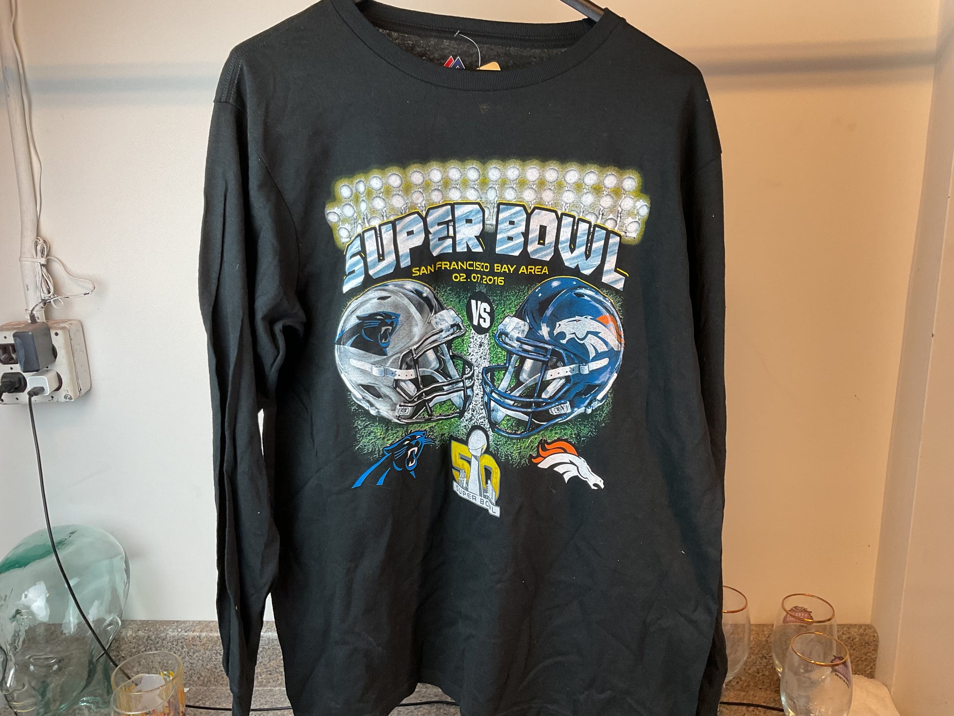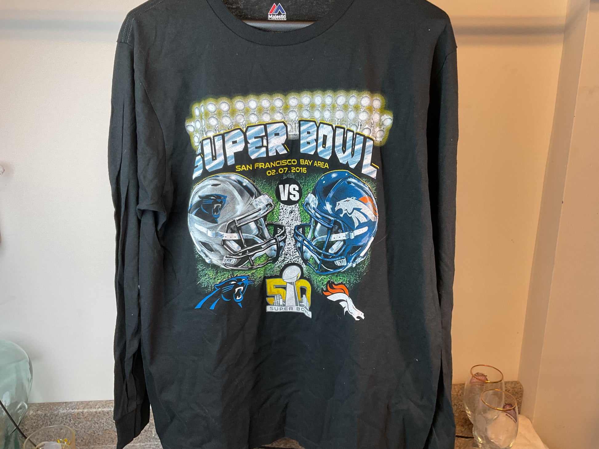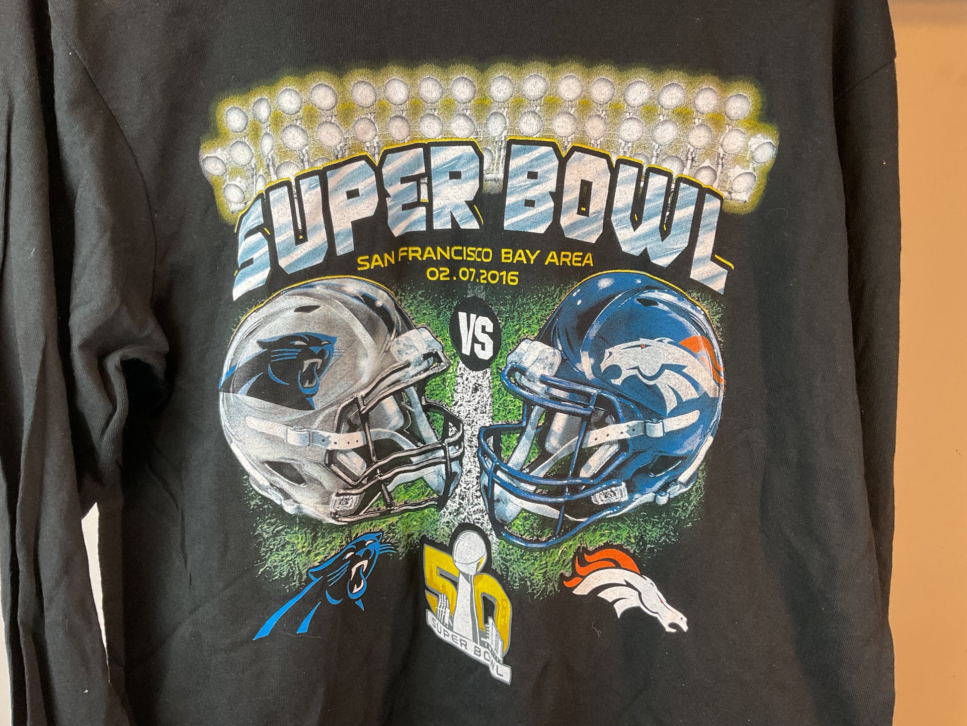 This shirt is from Super Bowl 50. The game was played in San Francisco between the Broncos and Panthers in 2016. The Broncos came out on top marking Peyton Manning's last Super Bowl Win and final game of his career. Shirt001