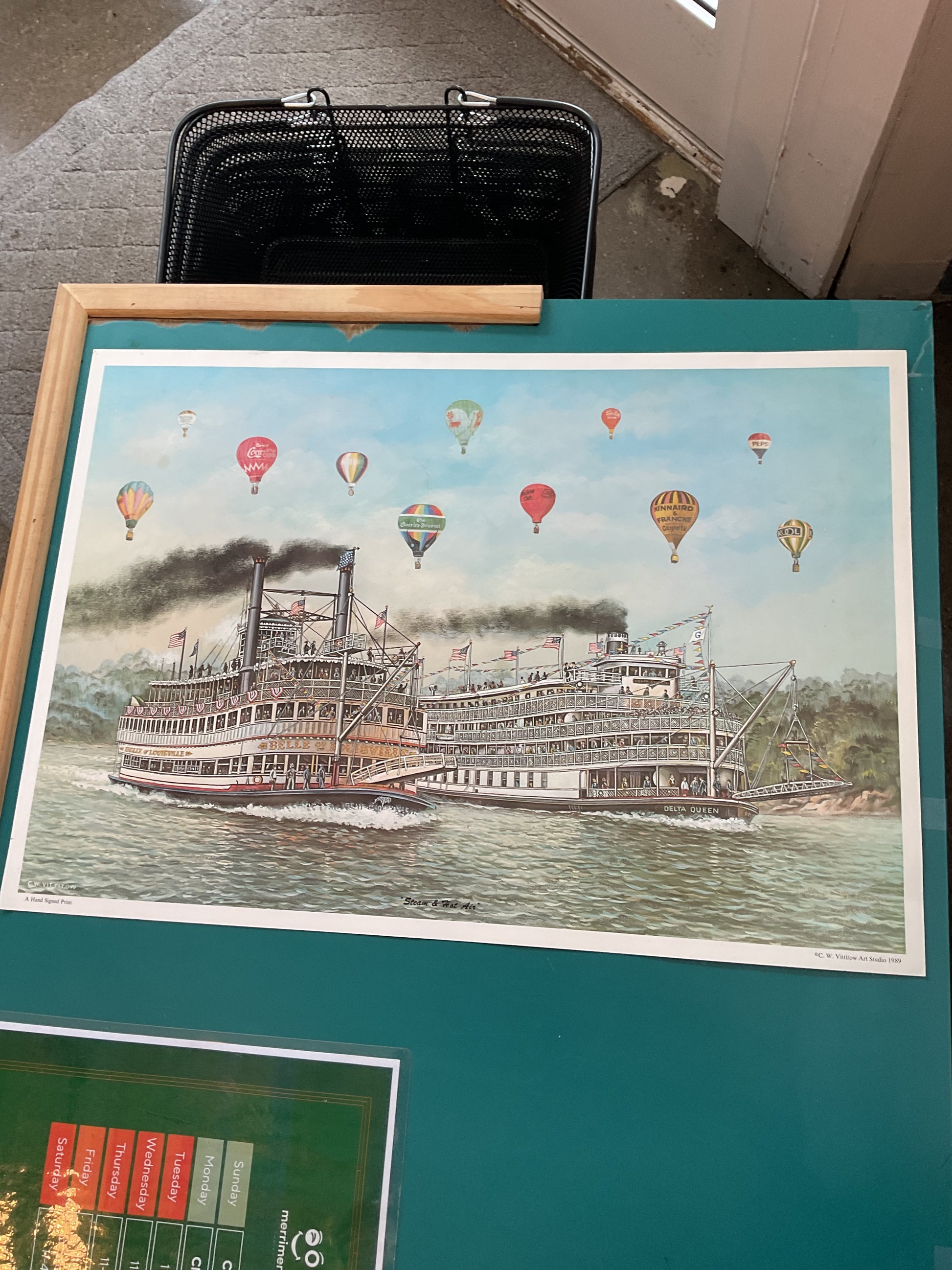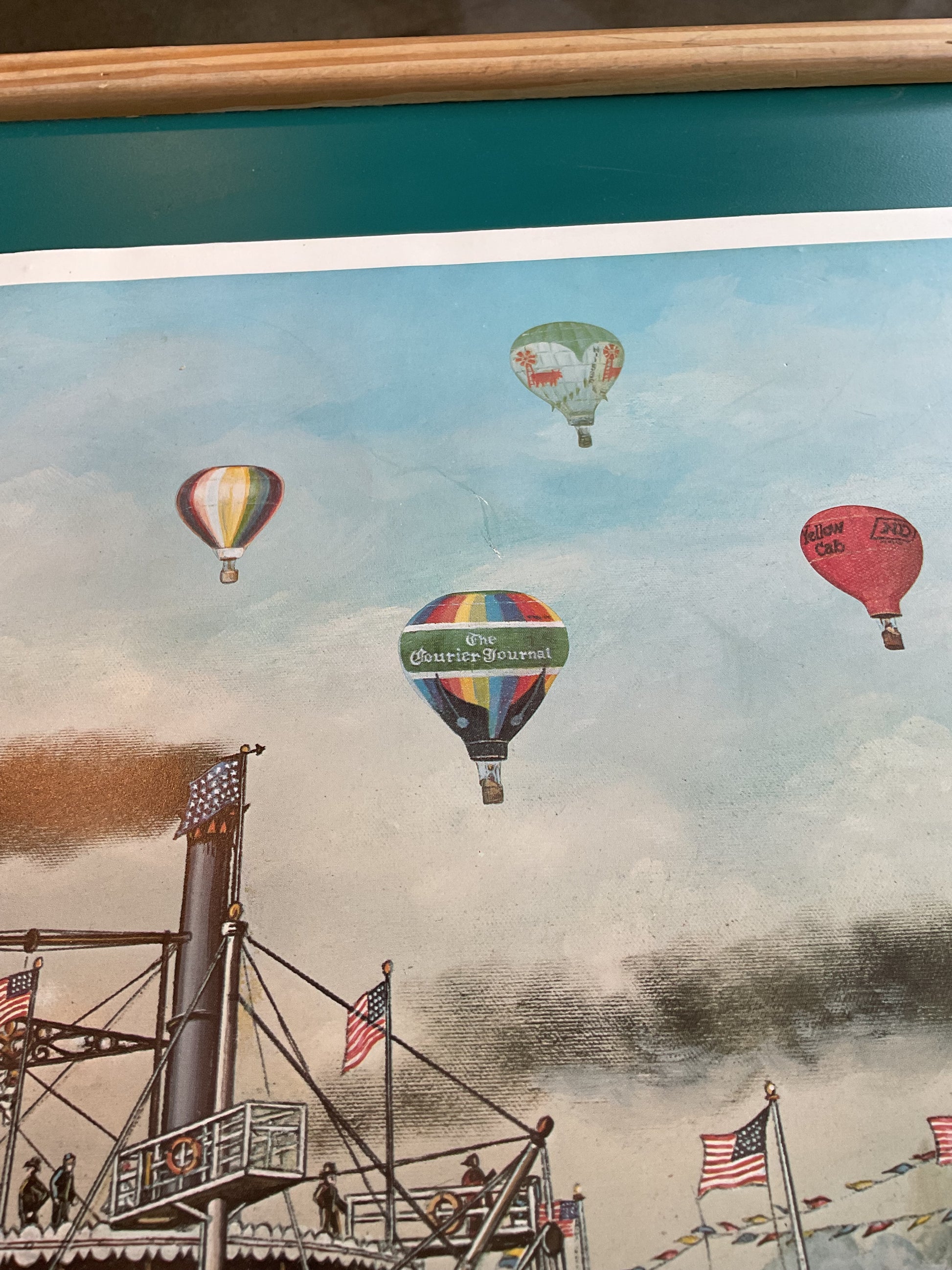 This piece by CW Vittitow is a print that depicts the hot air balloon race and Steam Boat race that takes place in Louisville Kentucky leading up. To the Kentucky Derby. CW Vittitow was a local Kentucky artist who was able to capture beautiful scenes with his use of vibrant color. This print measures 23” wide by 16” tall. It does have a scratch on the face that can be seen running down when caught in the light. It says it is a hand signed print but there is no hand signature.