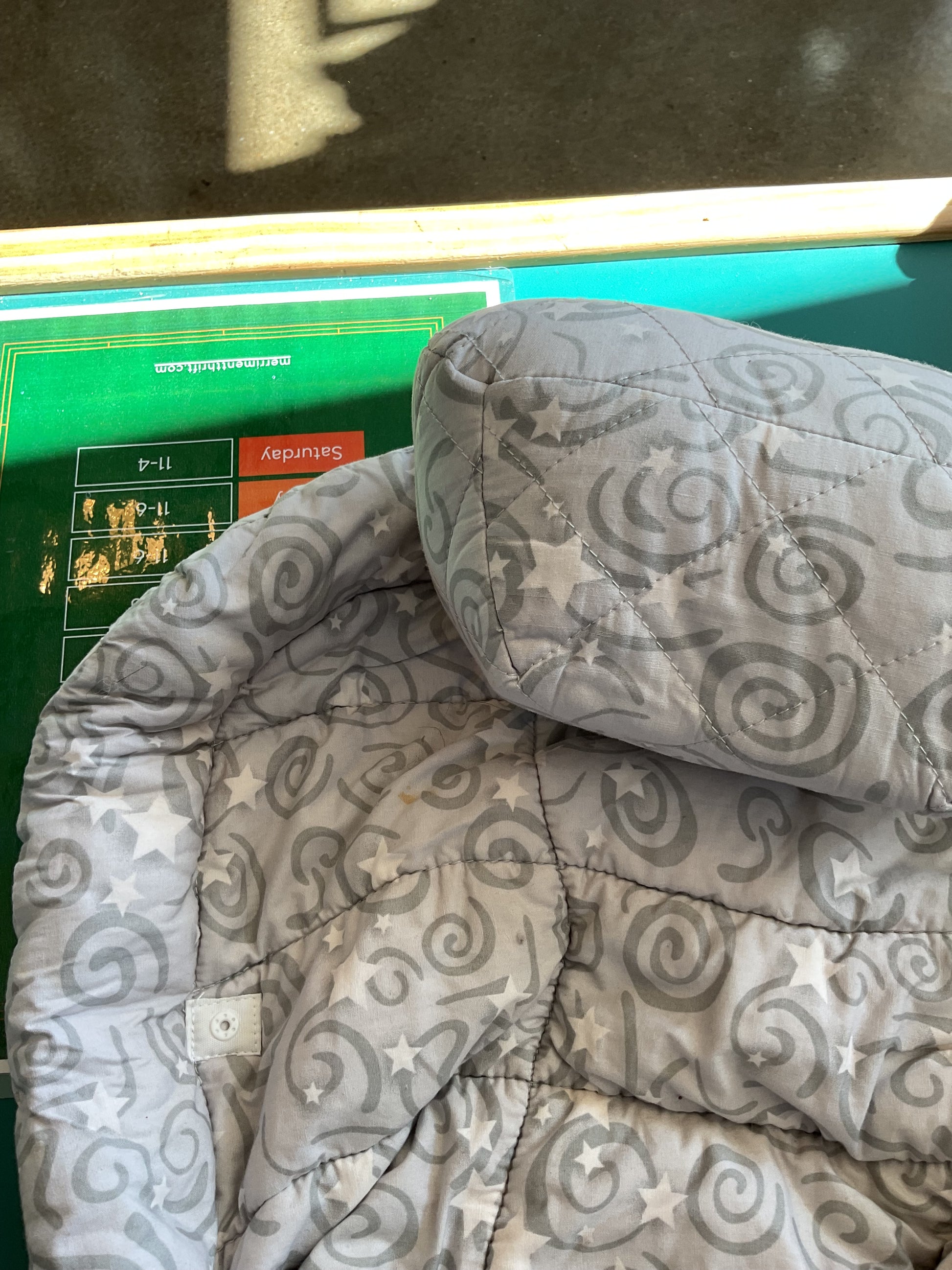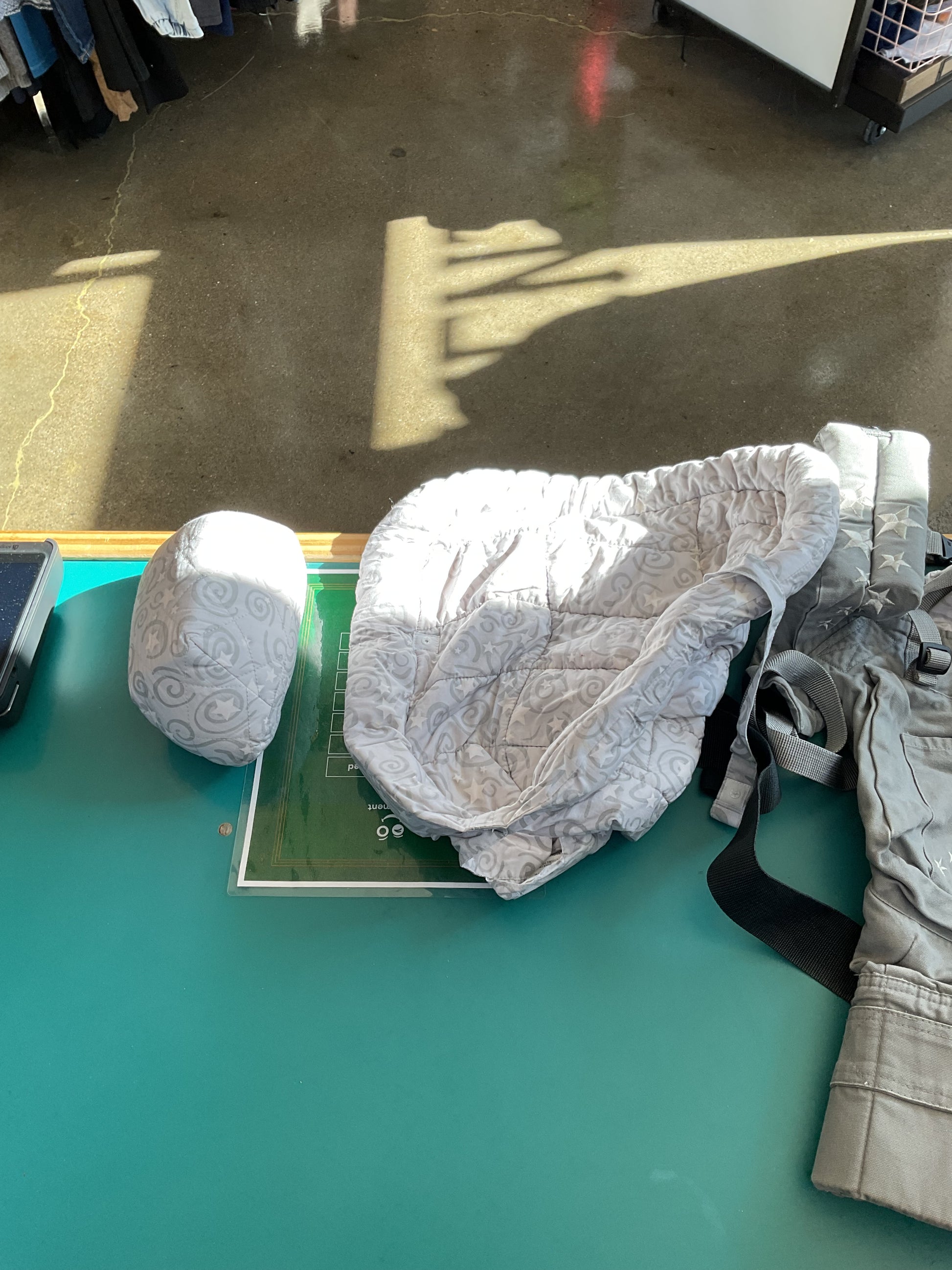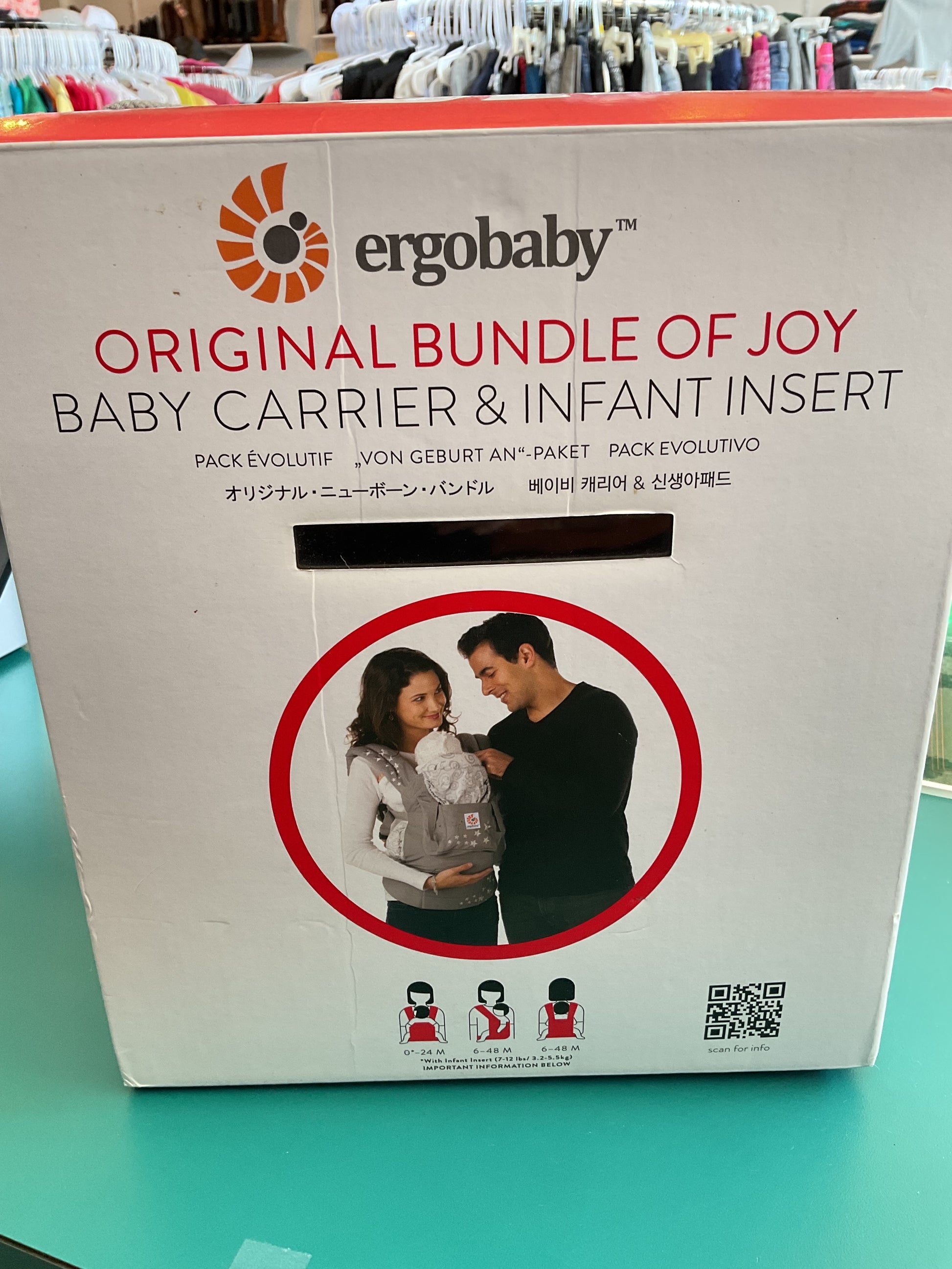 This Ergobaby Original Bundle of Joy Baby Carrier & Infant Insert comes with original box and instructions. With multiple ways to carry your little one, this adaptable carrier is sure to help you both stay comfortable. There are two little stains on infant insert (pictured). The carrier is grey with white stars accenting.