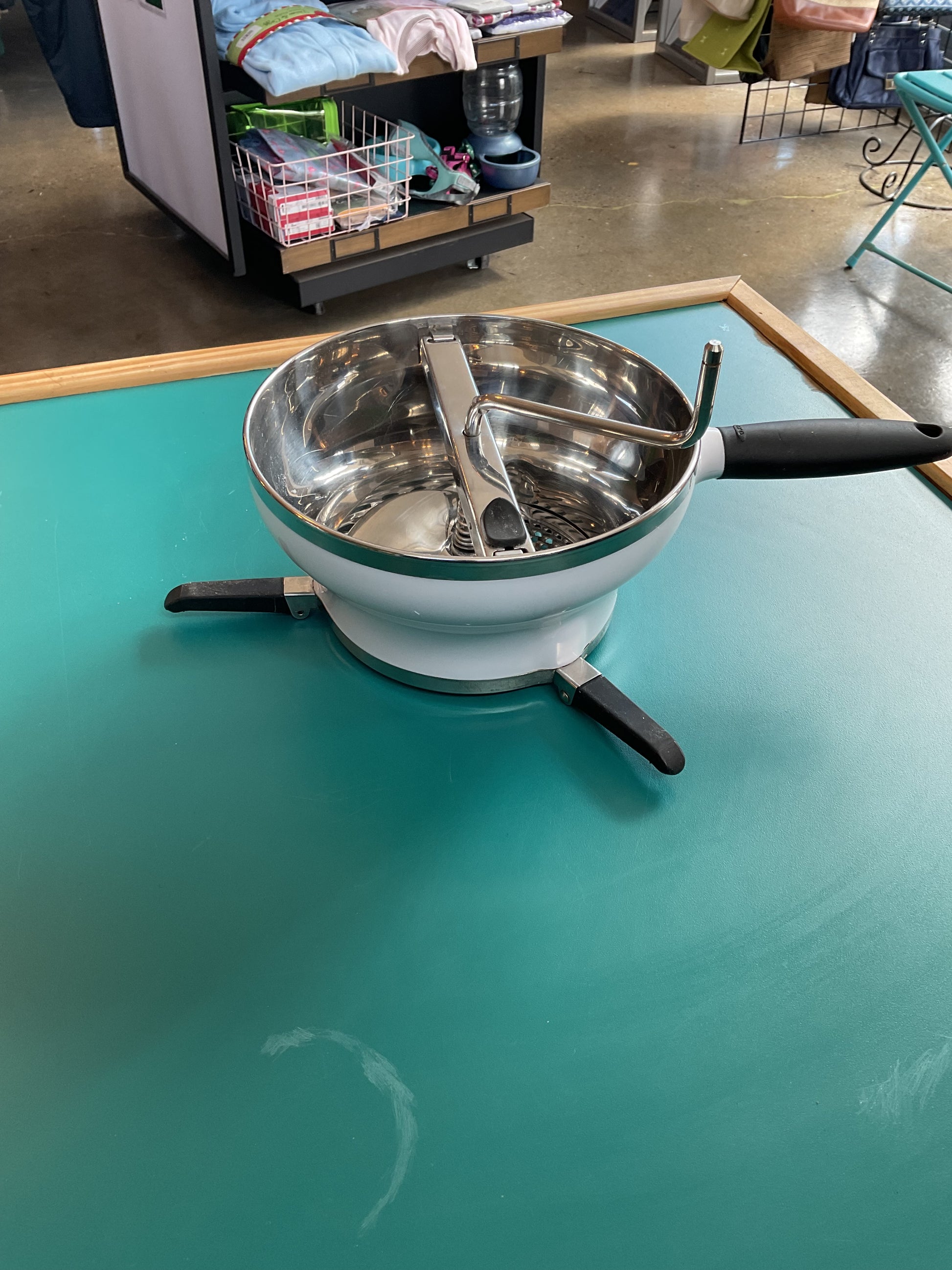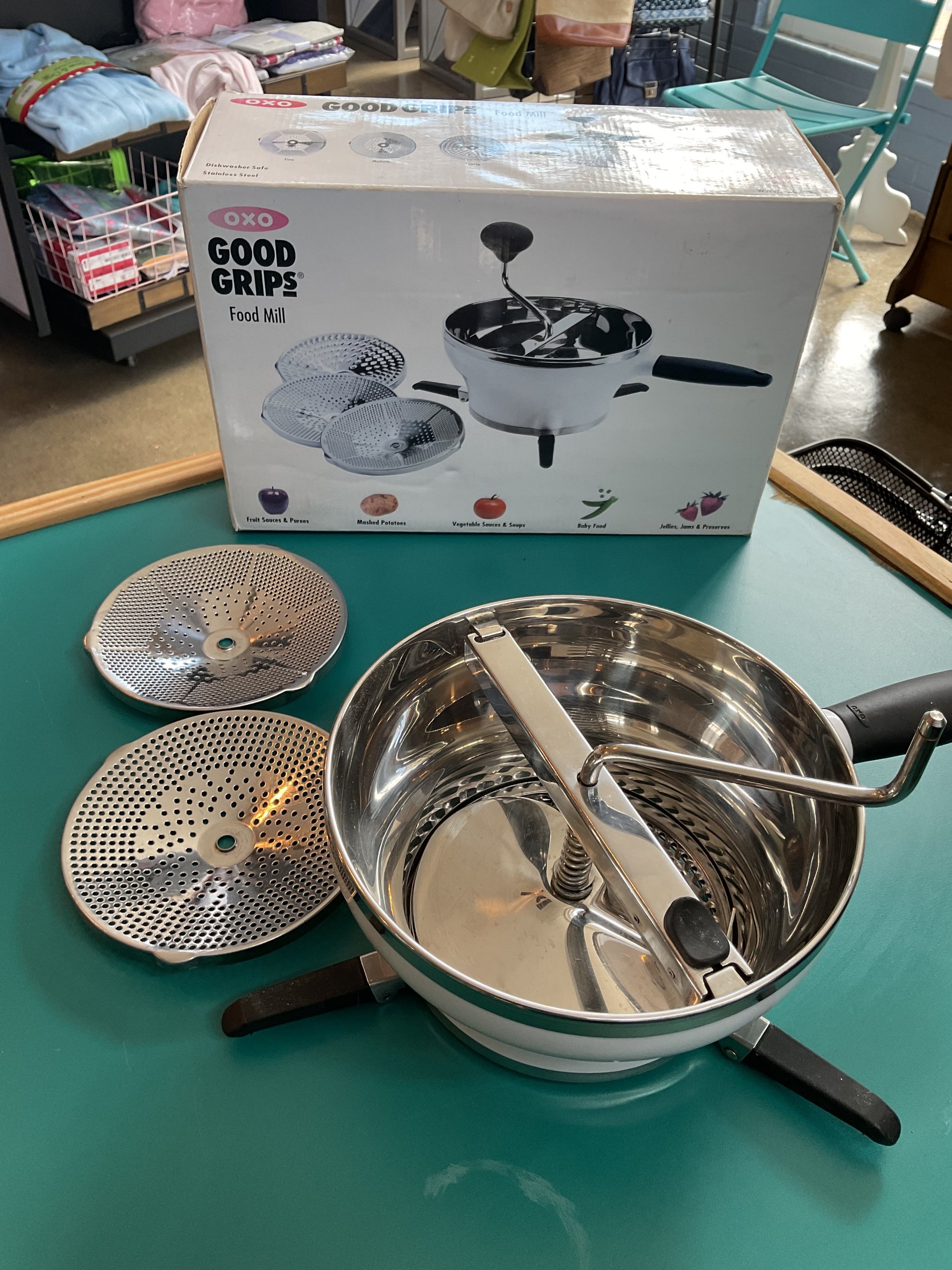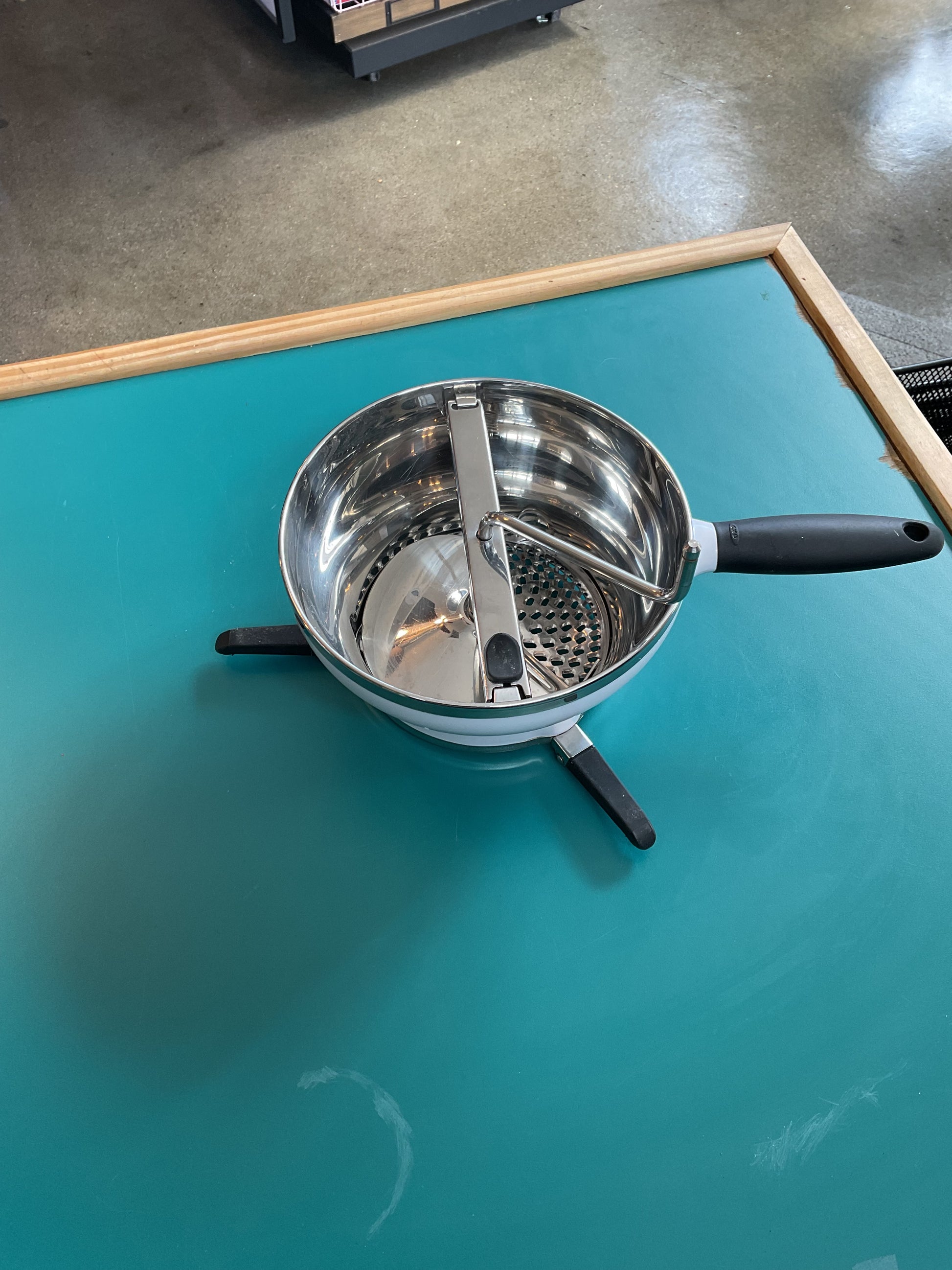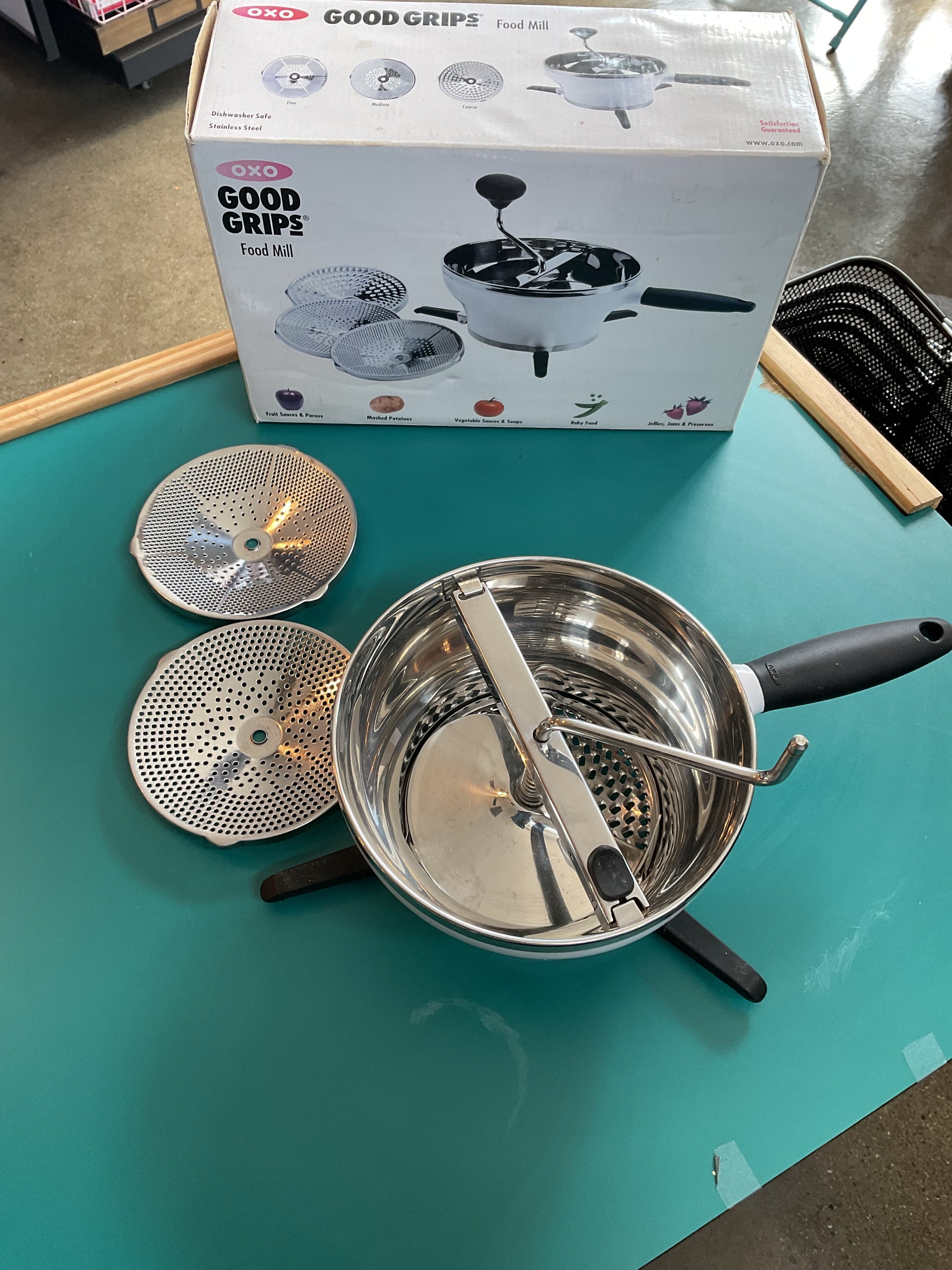 This food mill can be used to prep for sauces, purées, mashed potatoes, soups, jellies, baby food, and more. It is a great piece of versatile equipment. It is missing the top knob, but you can easily turn from the shaft itself. Get yours now.