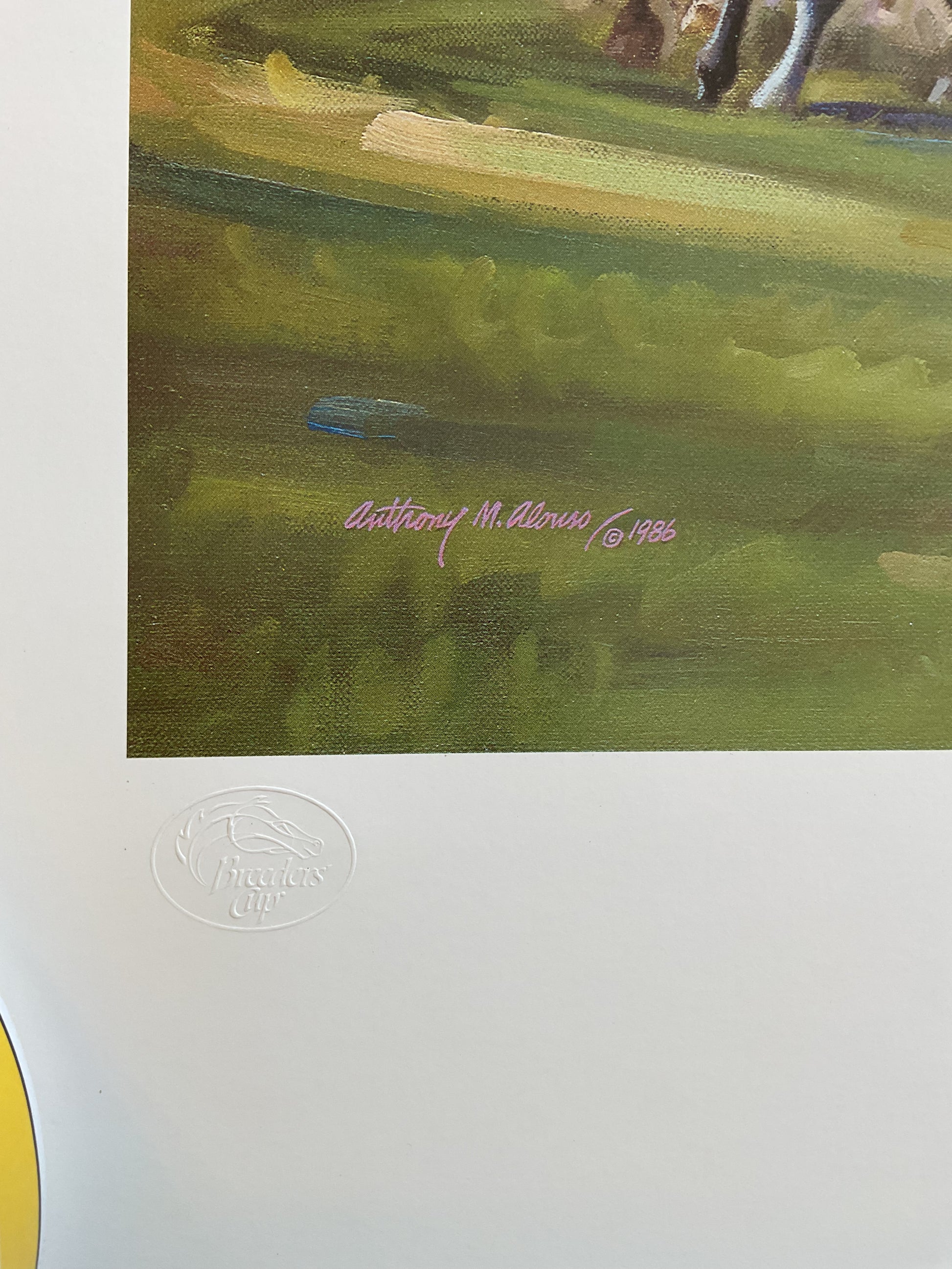 This print by Anthony Alonzo was made to commemorate the 1986 Breeders Cup. Measures 18.5” wide by 16” tall. Beautiful piece for the horse racing fan. Good condition, may have small creases in corners.