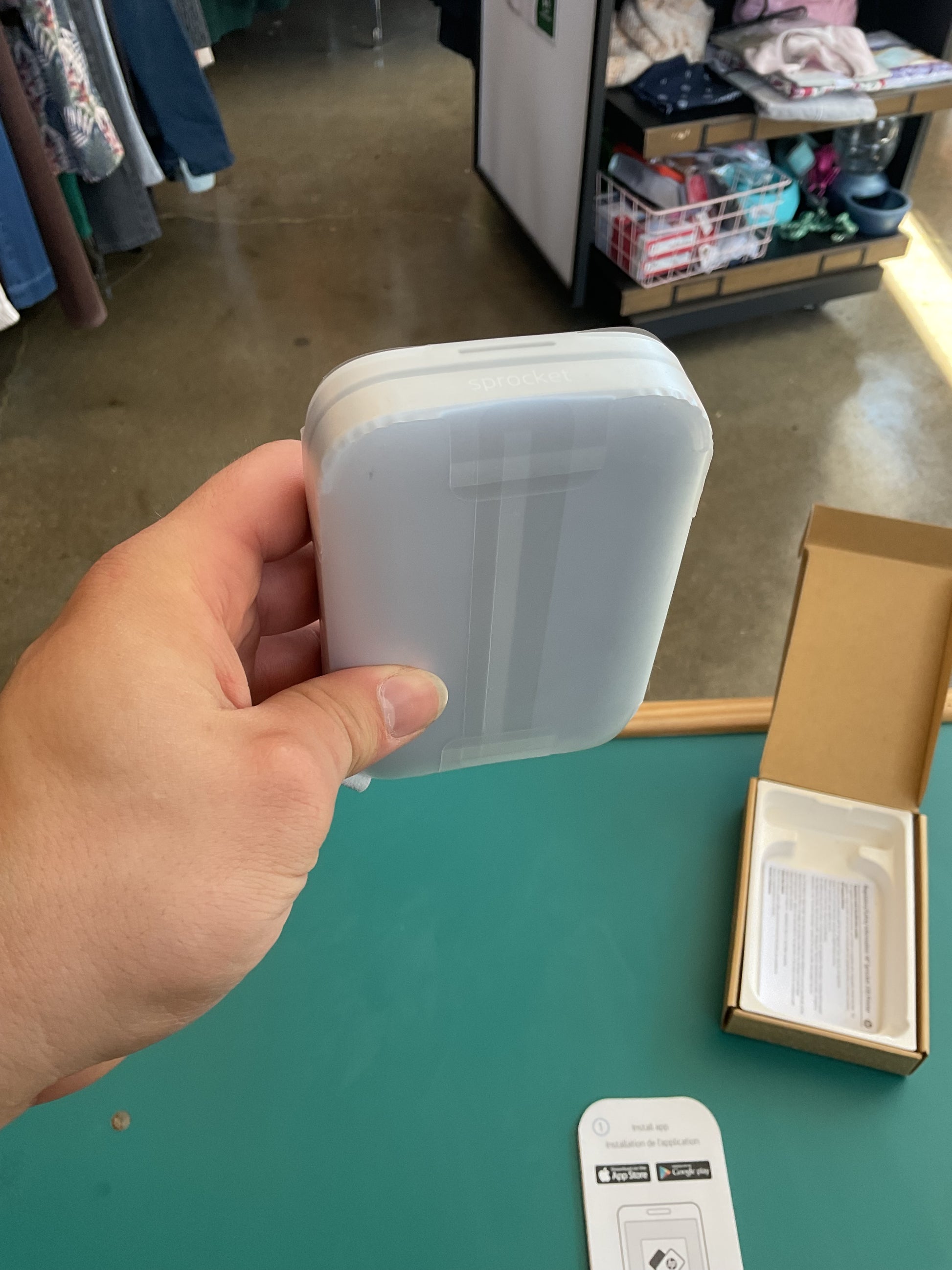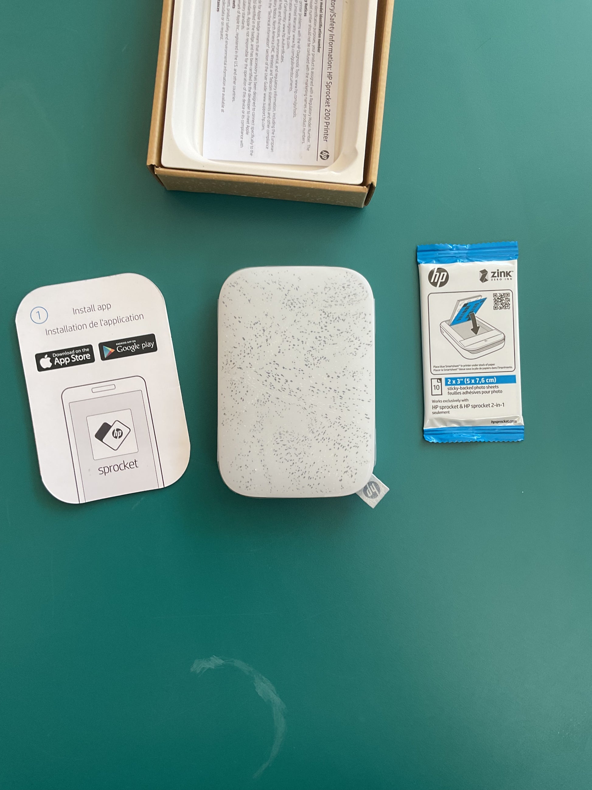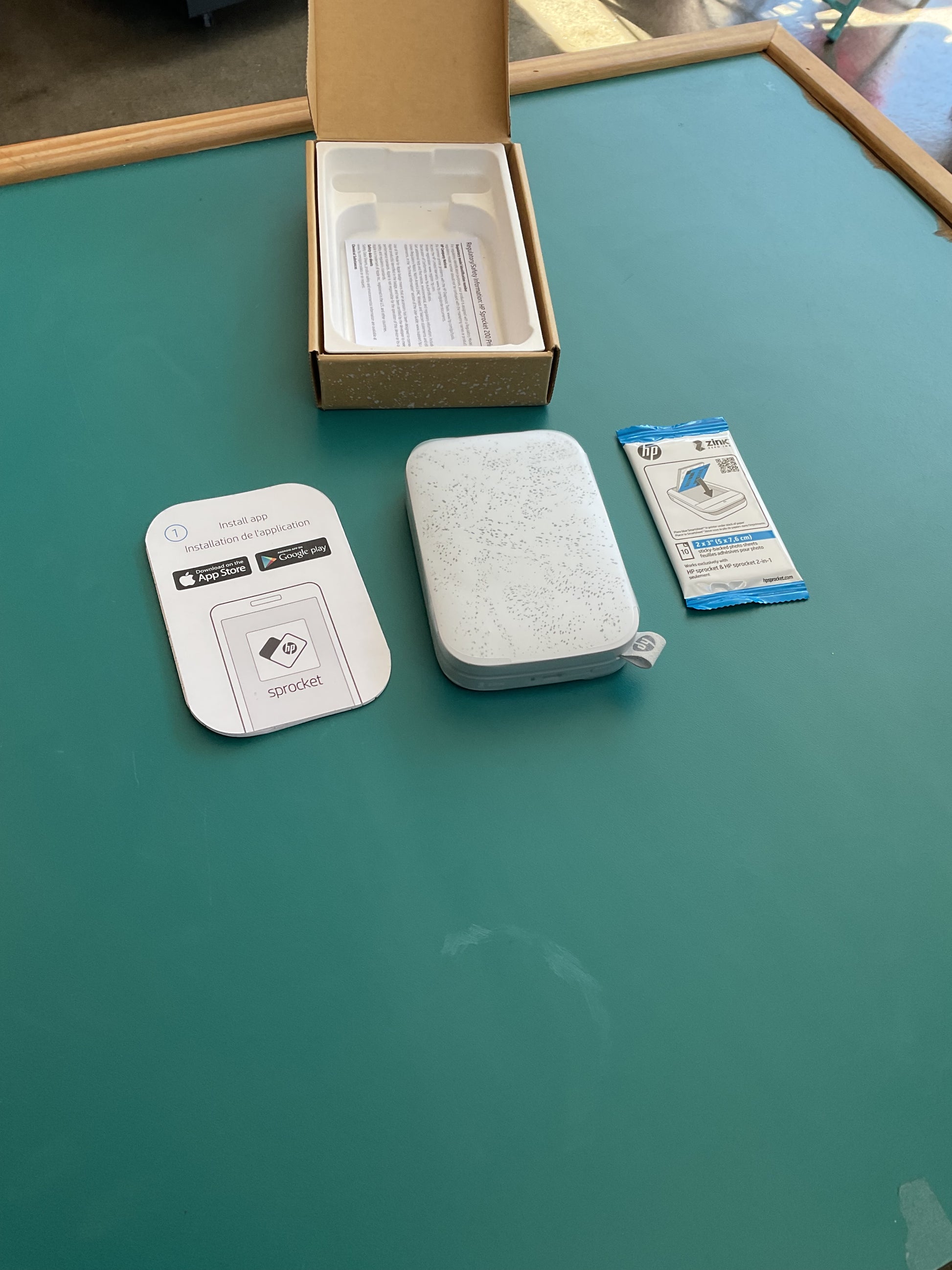 An unused Sprocket Printer. I do not have the charging cable but it has not been used before, original packaging still on. Instructions and a pack of 10 sticky backed photo paper are included.