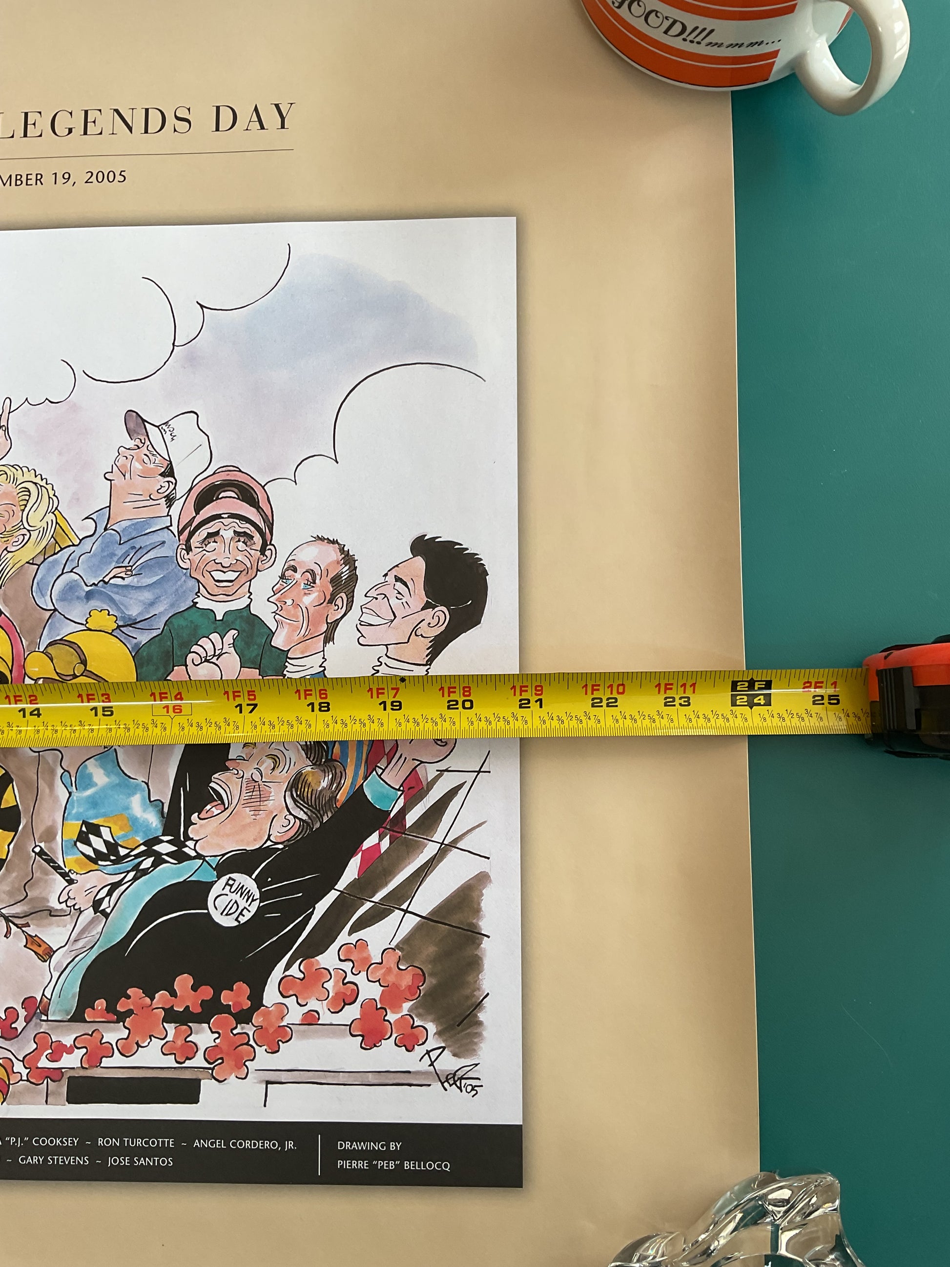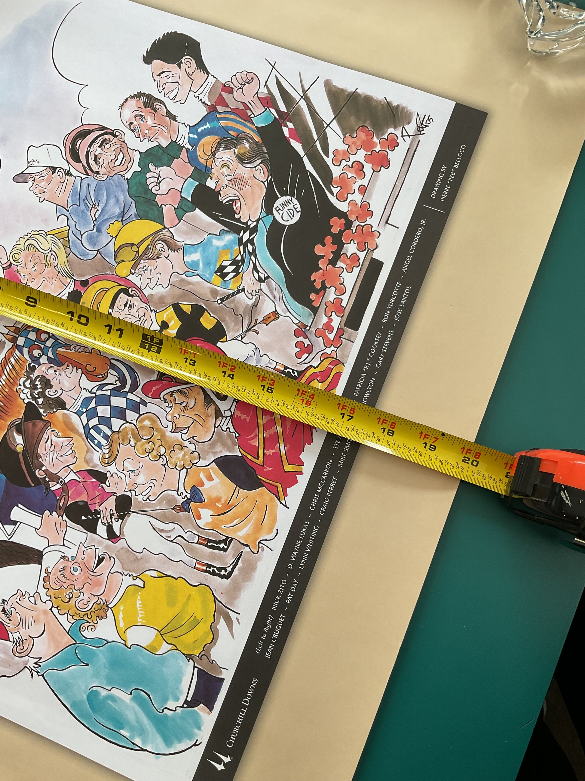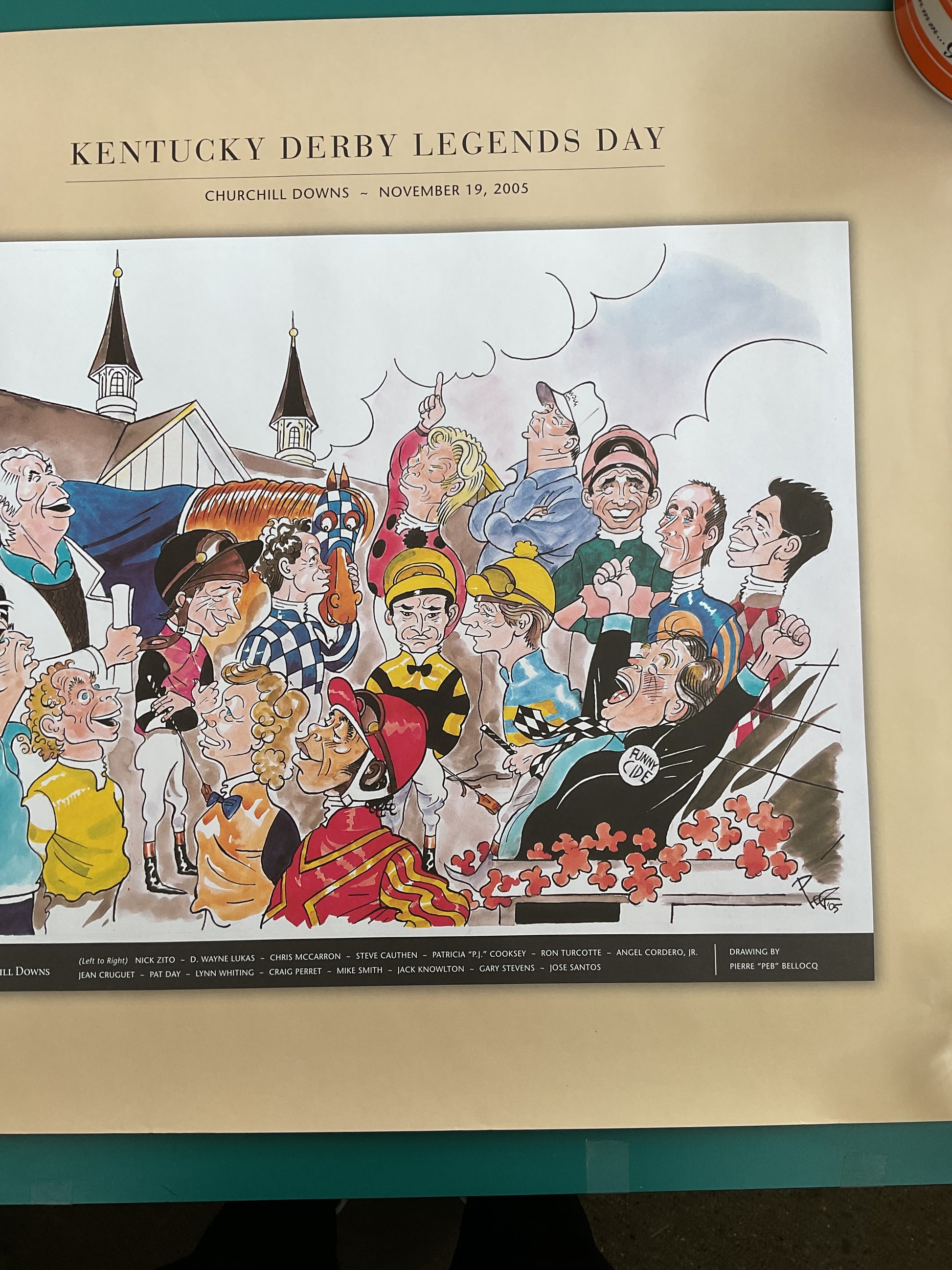 This poster was made to commemorate the 2005 Kentucky Derby Legends Day. It was made designed by famous French-American Artist Pierre “Peb” Bellocq. It is done in Pebs signature cartoonish style and features famous jockeys such as Ron Turcotte and Angel Cordero. It measures 24” wide by 20” tall. Get yours now!