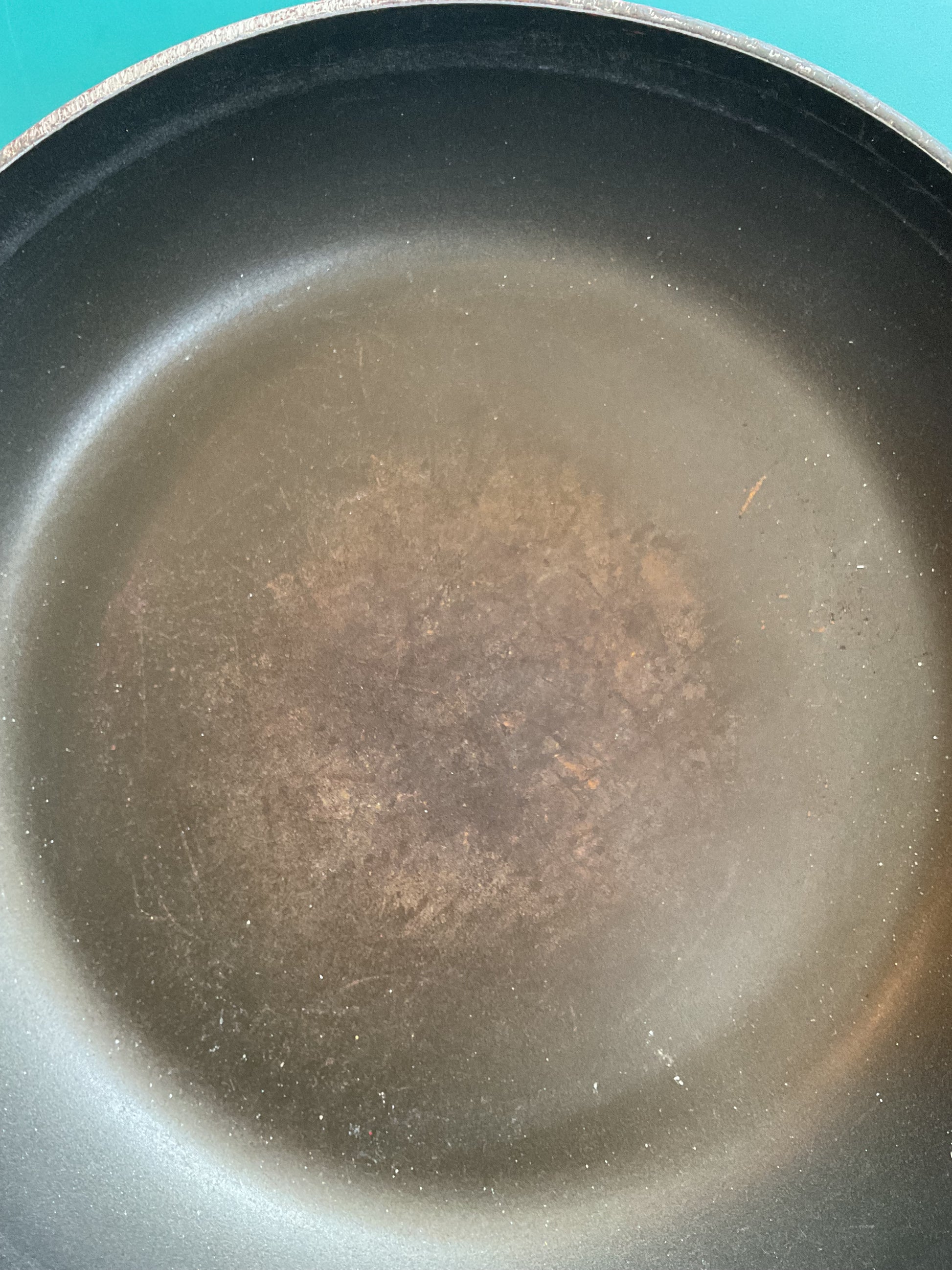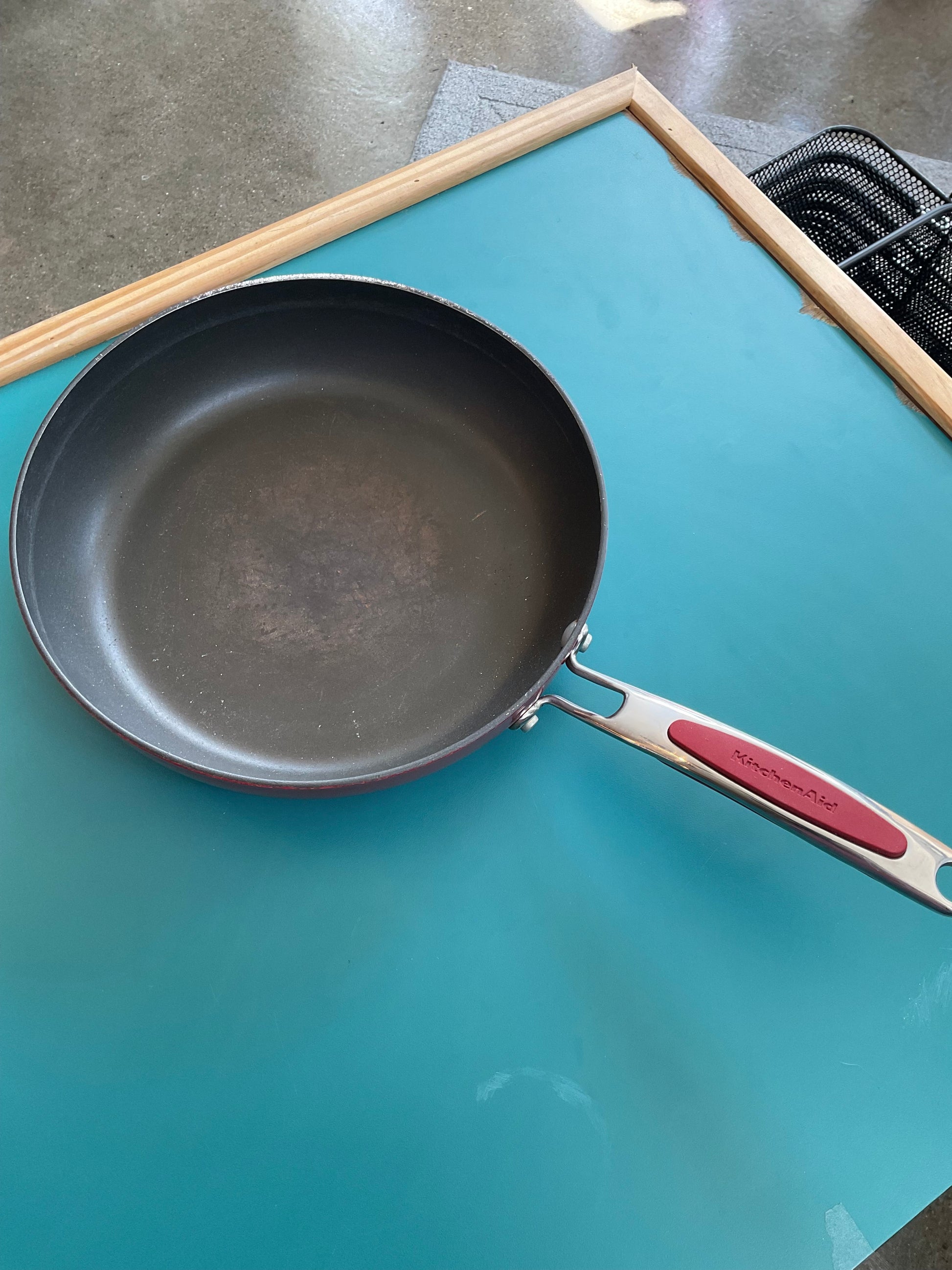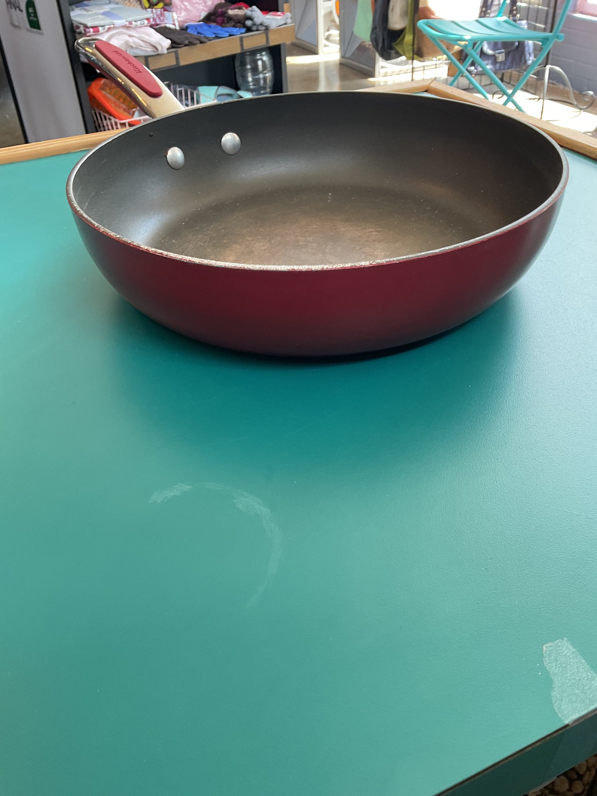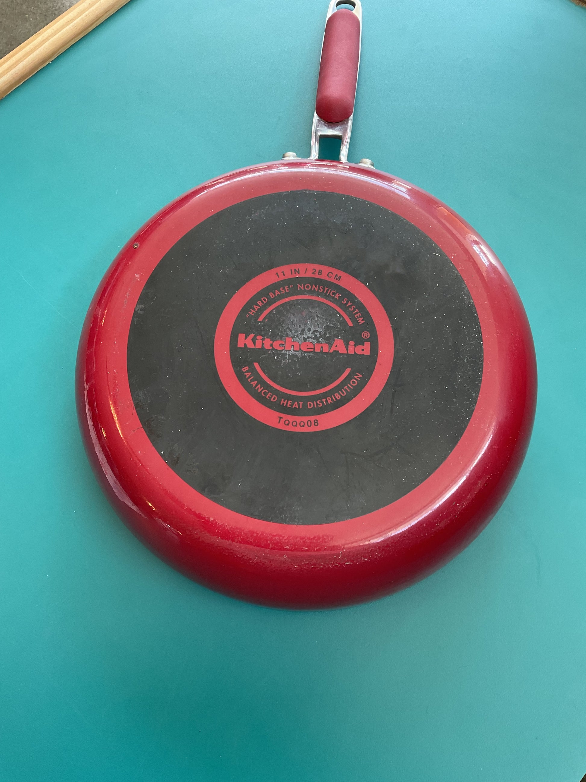This nonstick pan by Kitchen Aid is the perfect piece to add to your cookware. The perfect size to be a multifunctional workhorse in your kitchen. The bottom inside has some signs of wear but it is in otherwise good condition. The bright red makes sure it pops in kitchen as well.