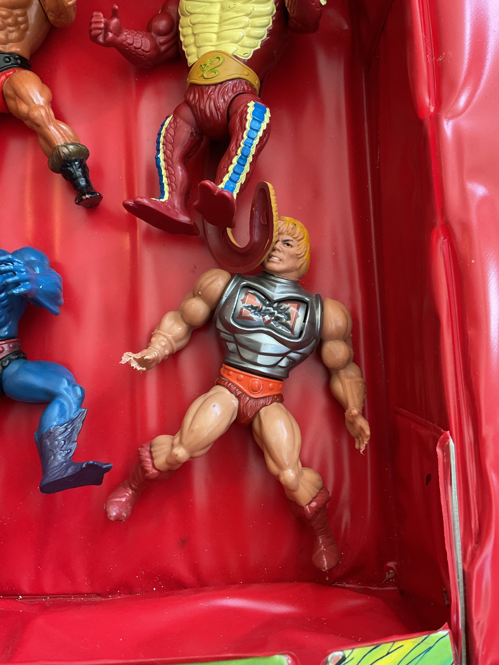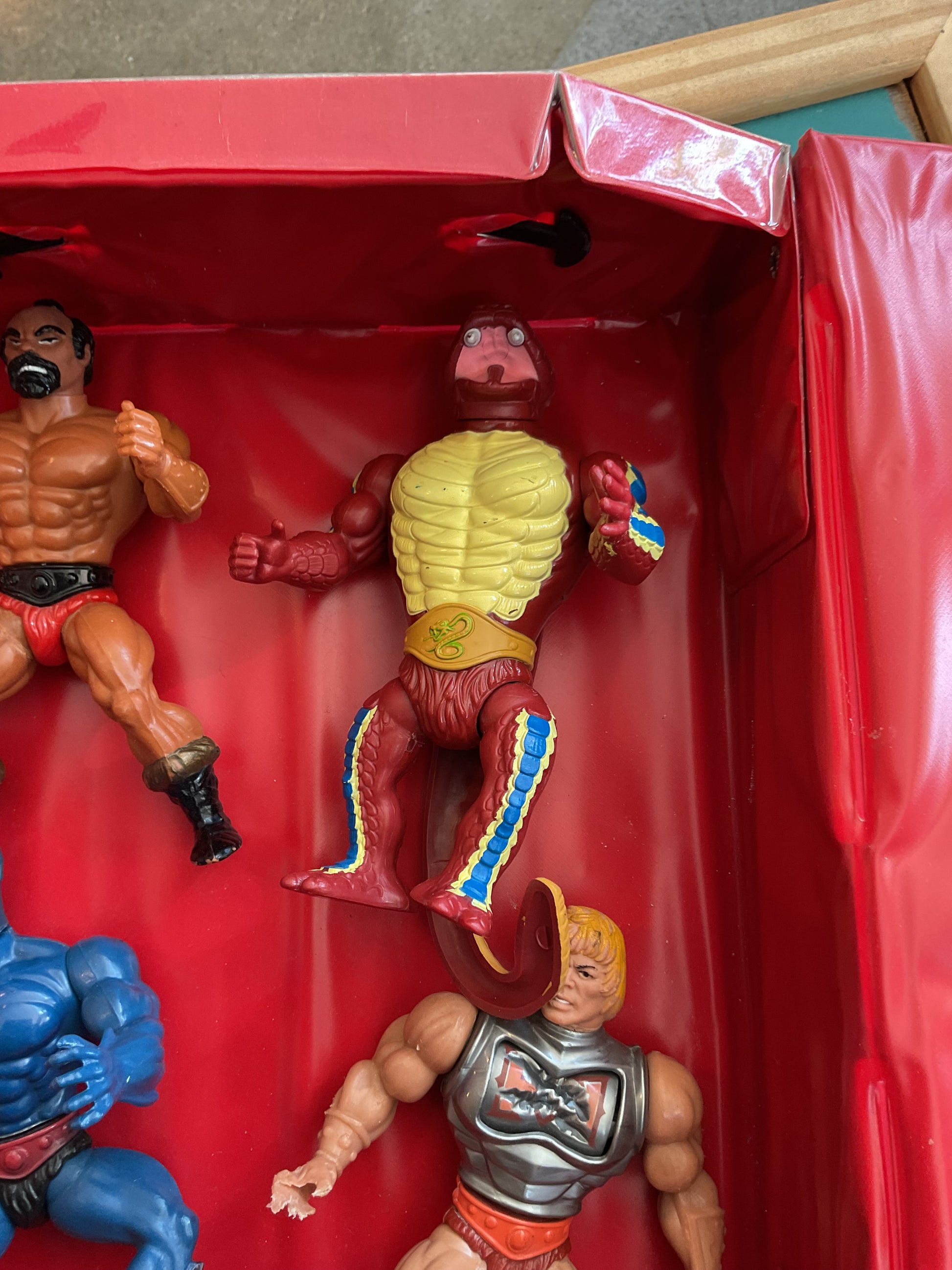 From the Masters of the Universe Series this collection of vintage toys includes: Clawful, Snout Spout, Two-Bad Action, Man-E-Faces, Eternia Webster, He-Man, Rattler, and Jitsu Action Figures with Collectors Case. Various conditions of figures, no accessories included.
