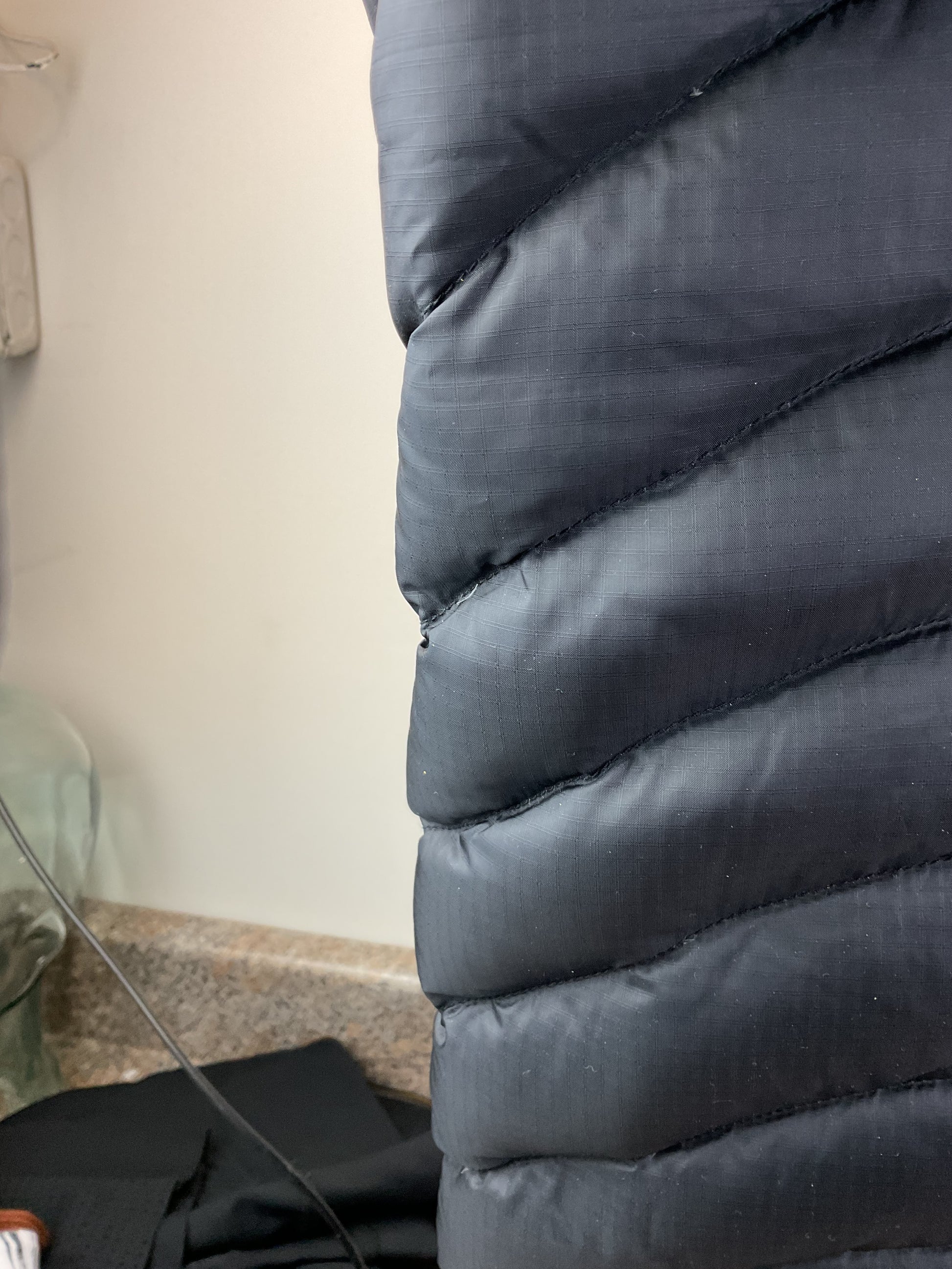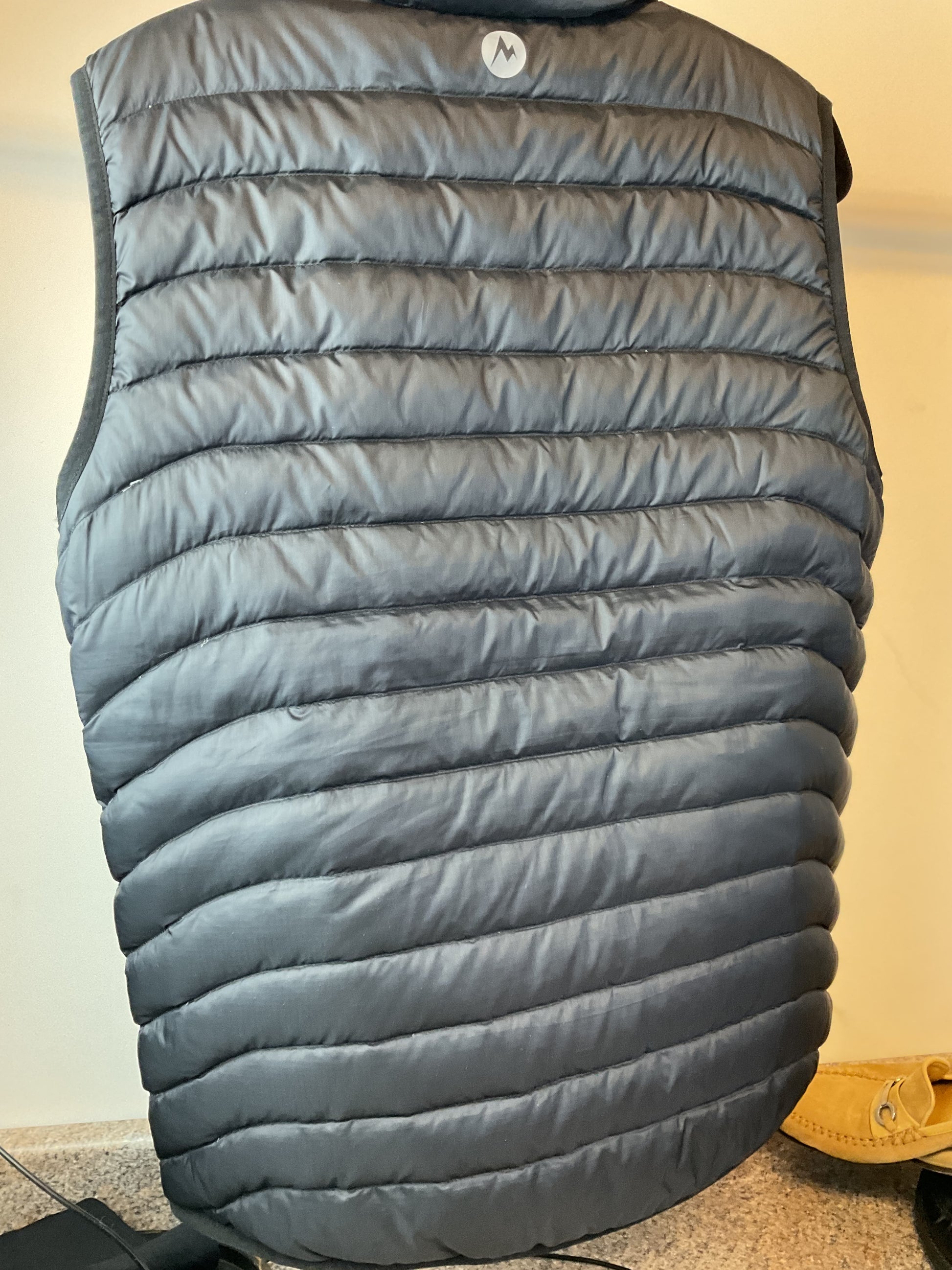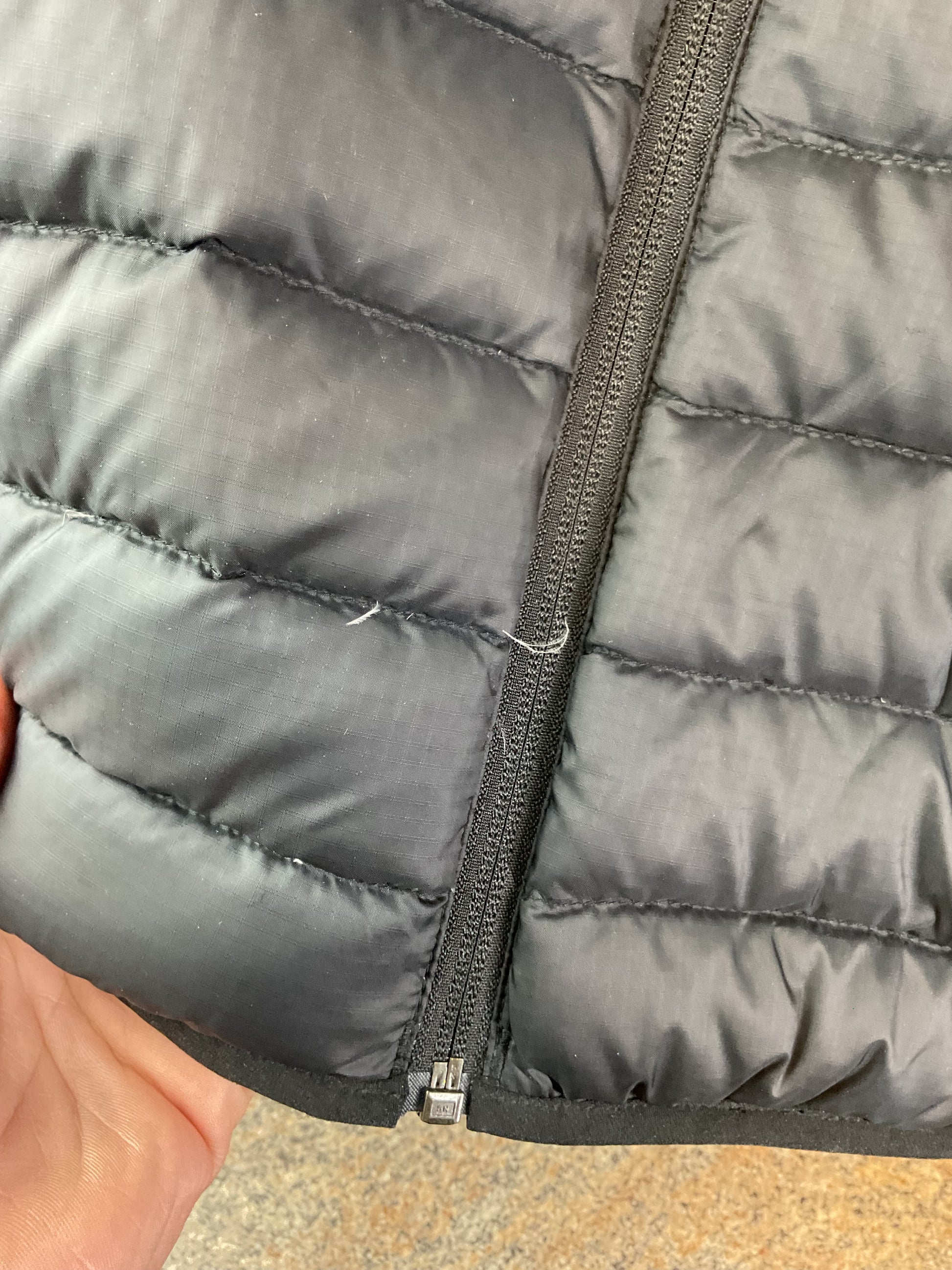 This Marmot vest is sure to keep you warm and looking good. The black color makes it easy to pair with any outfit. Whether attending a football game or going to the pumpkin patch, this vest is a perfect addition to your wardrobe this Autumn. It has a few stray strands poking out, all pictured.