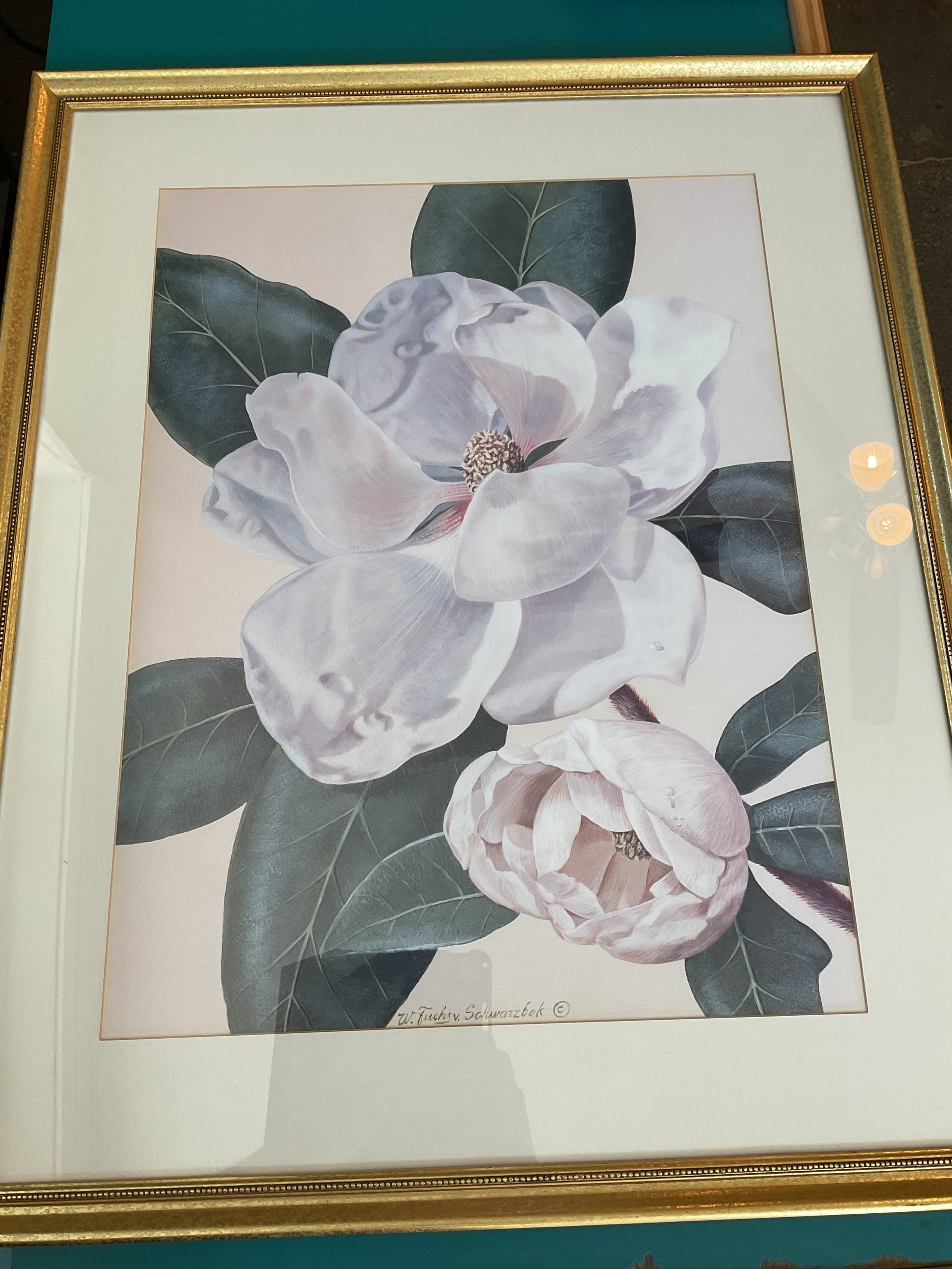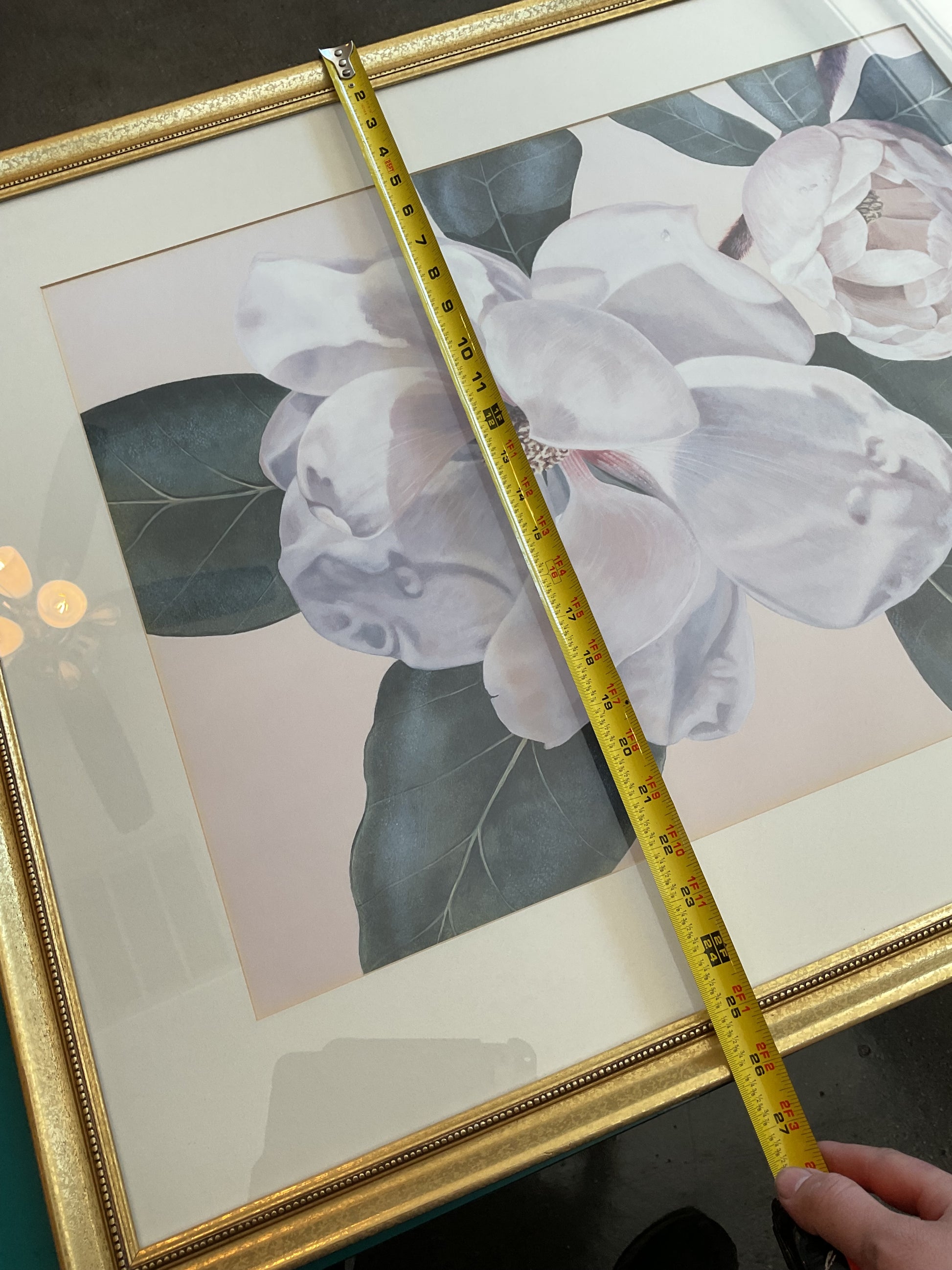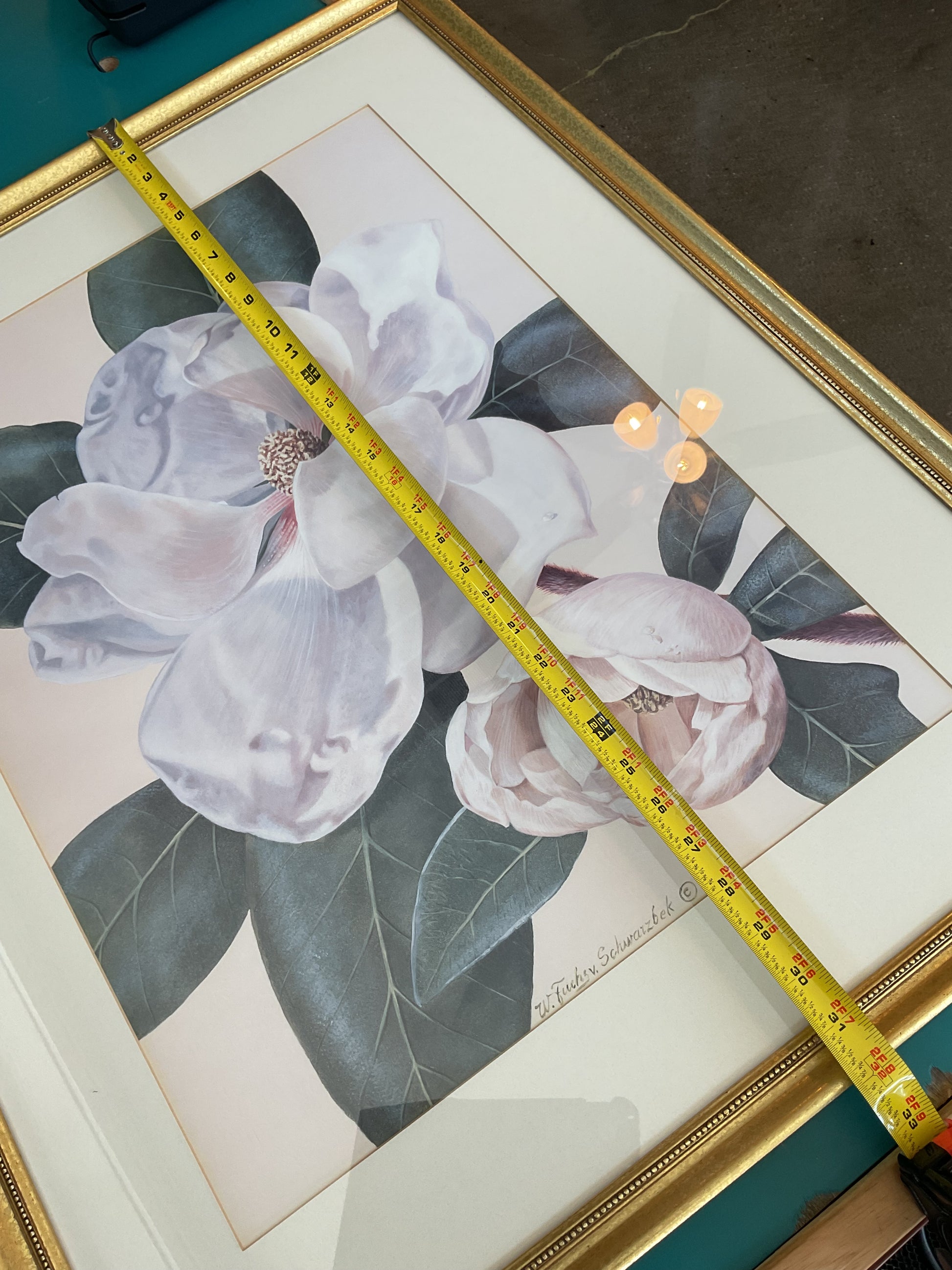 This piece depicts the subtle beauty of a magnolia bloom in the morning. It is framed and is ready to hang. It measures 32” x 26”. Add to your collection now to give any room a light, floral pop.
