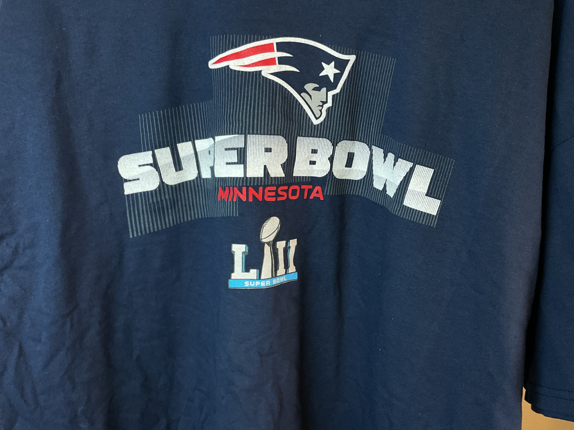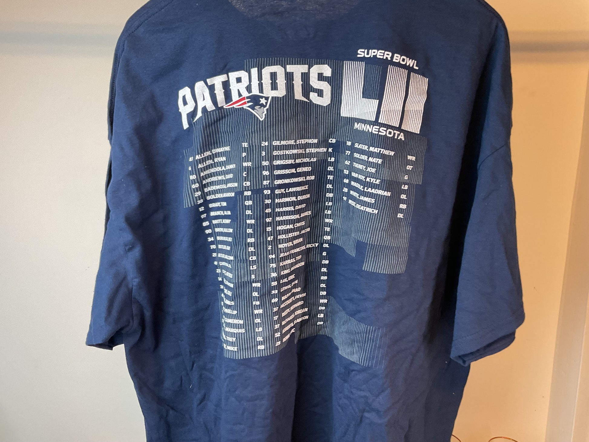 This shirt is from Super Bowl 52. The game was played in Minnesota between the Patriots and Eagles in 2018. The Eagles came out on top marking Jason Kelce's only Super Bowl Win. This shirt has the Patriot's lineup on the back. Shirt001