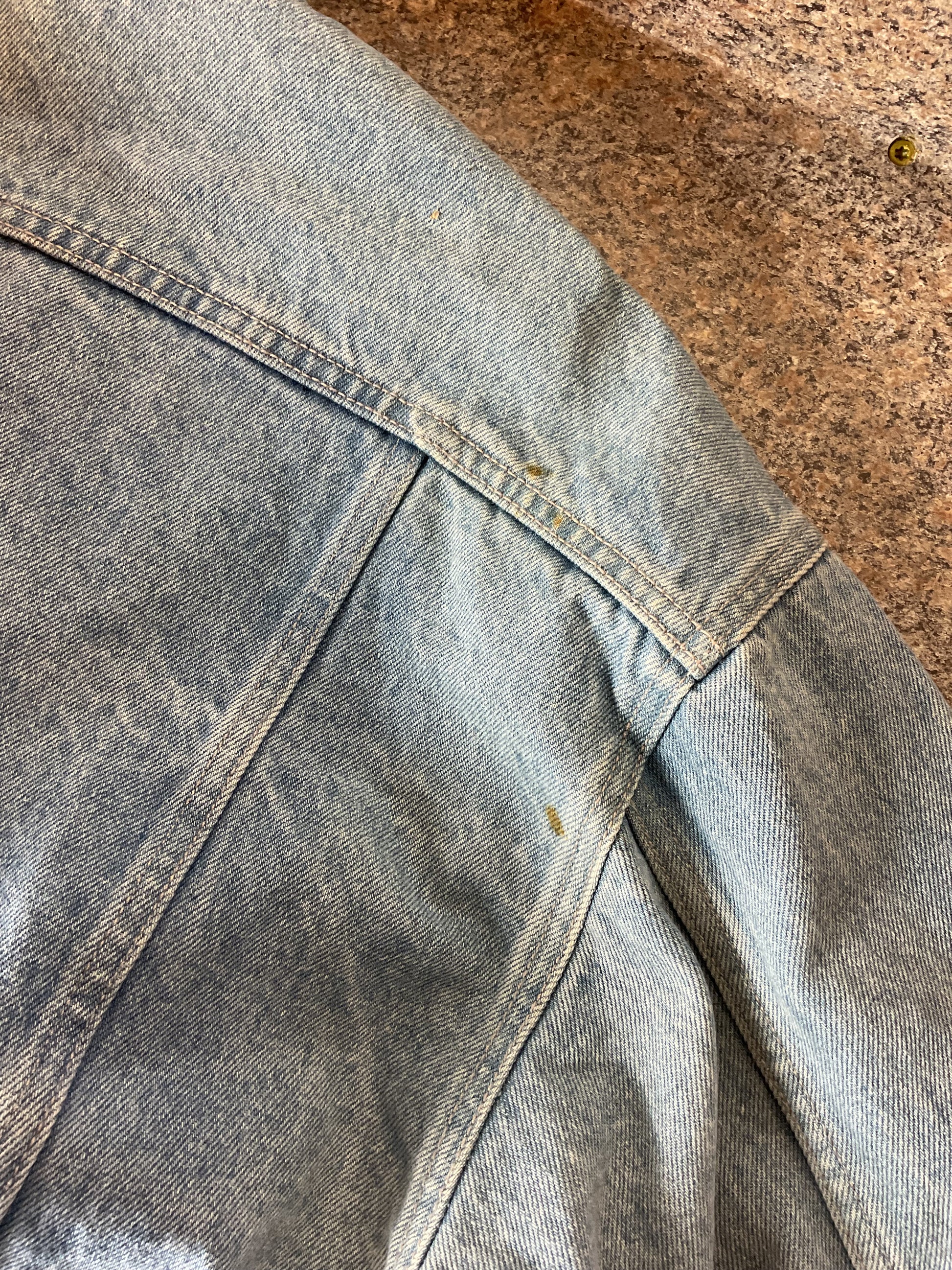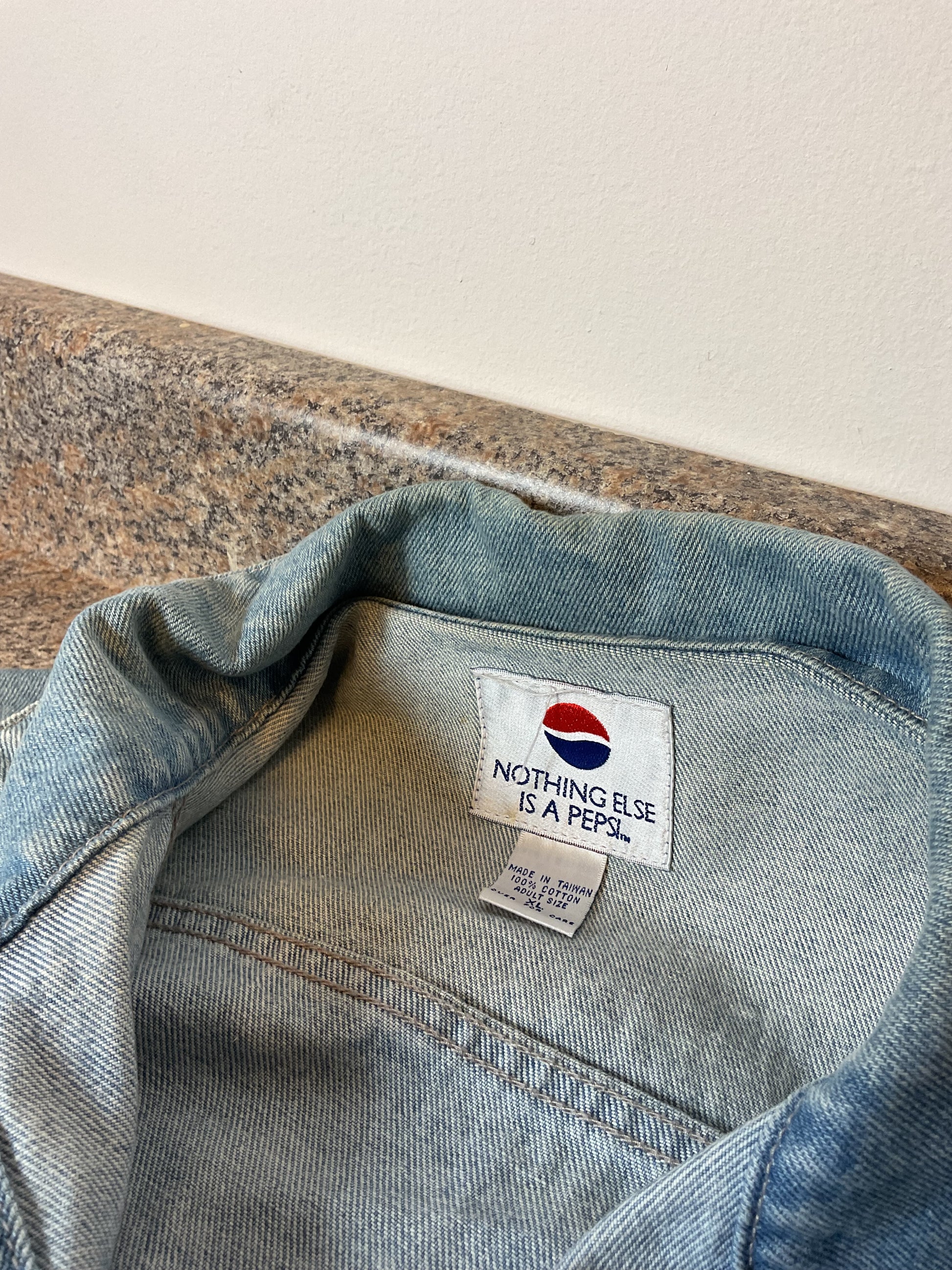 This Vintage Denim Jacket from Pepsi could be yours. Size is XL. There is one small stain on back that is shown in images.