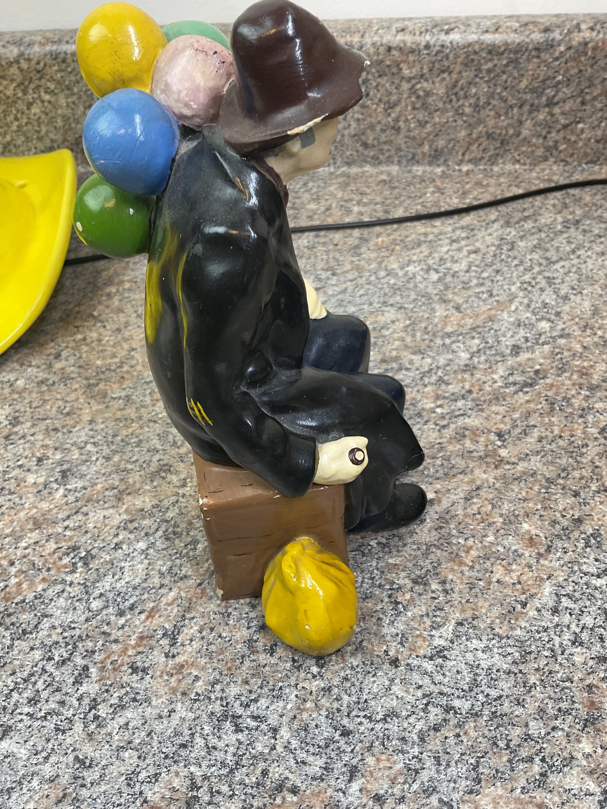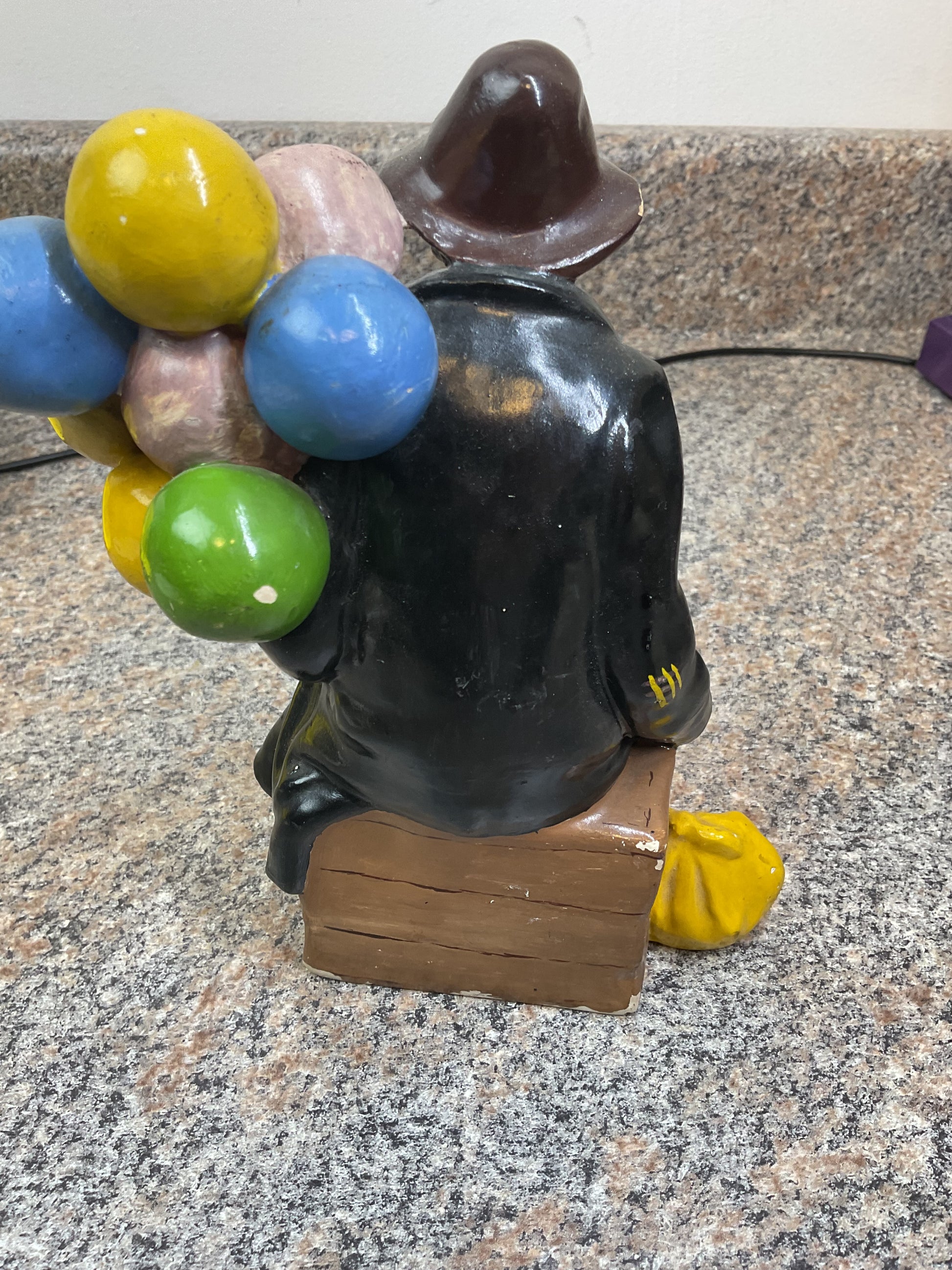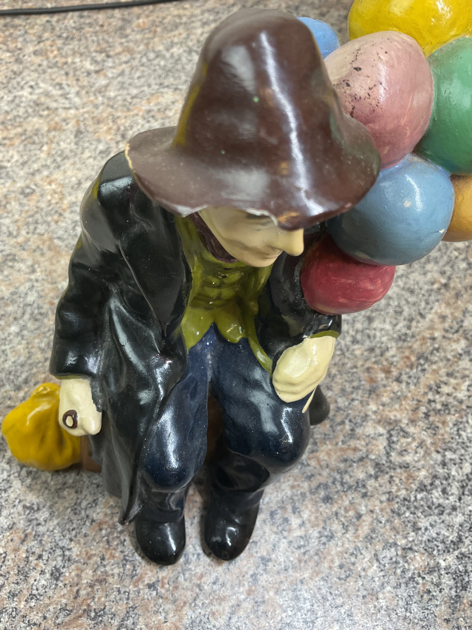 This classic balloon piece is a fun piece to liven up any space. This piece has a chip out of the front brim of the hat. And scratches around. Heavily discounted due to condition, get this deal now and enjoy the fun that the balloon man can bring to your room.