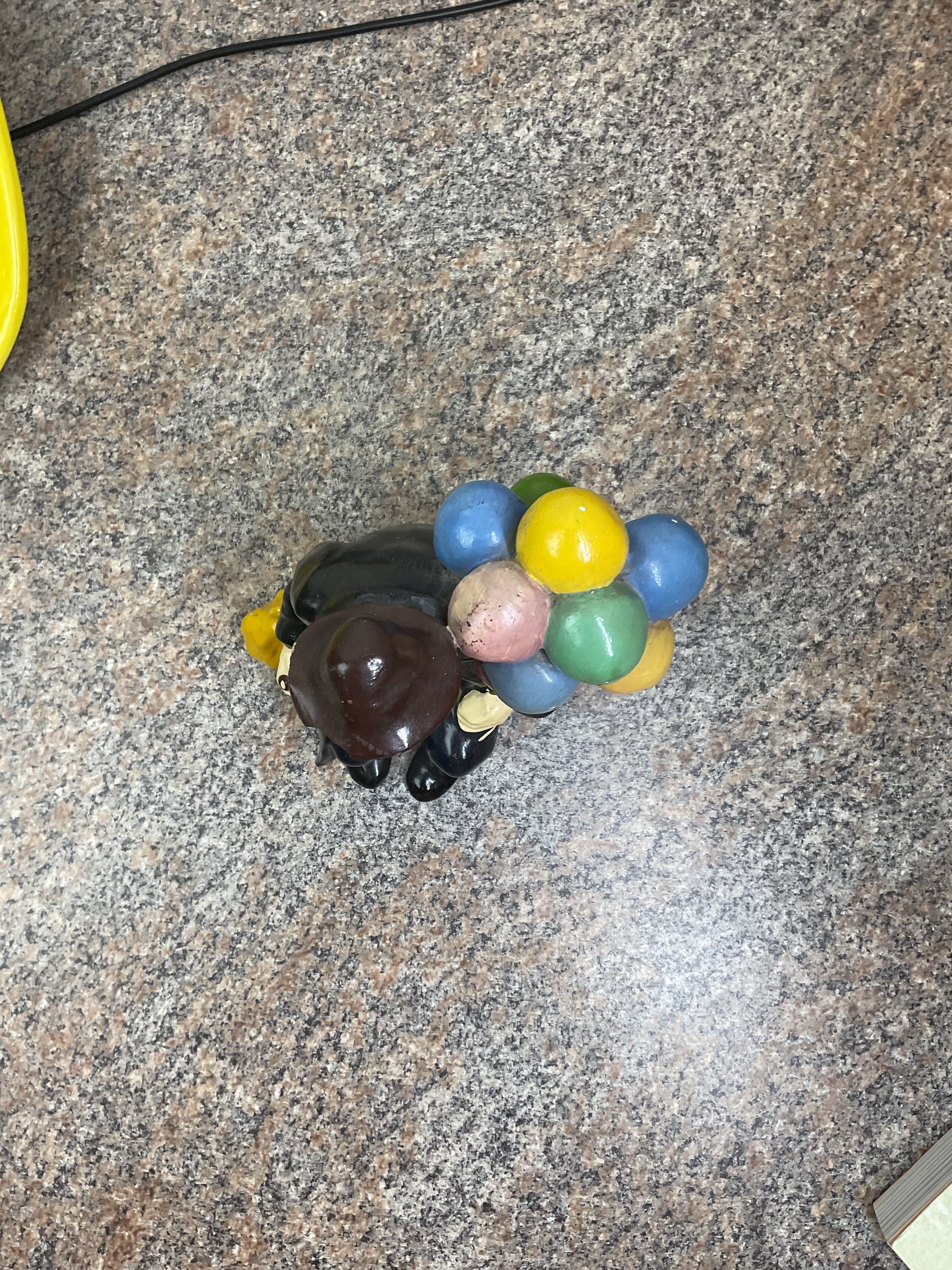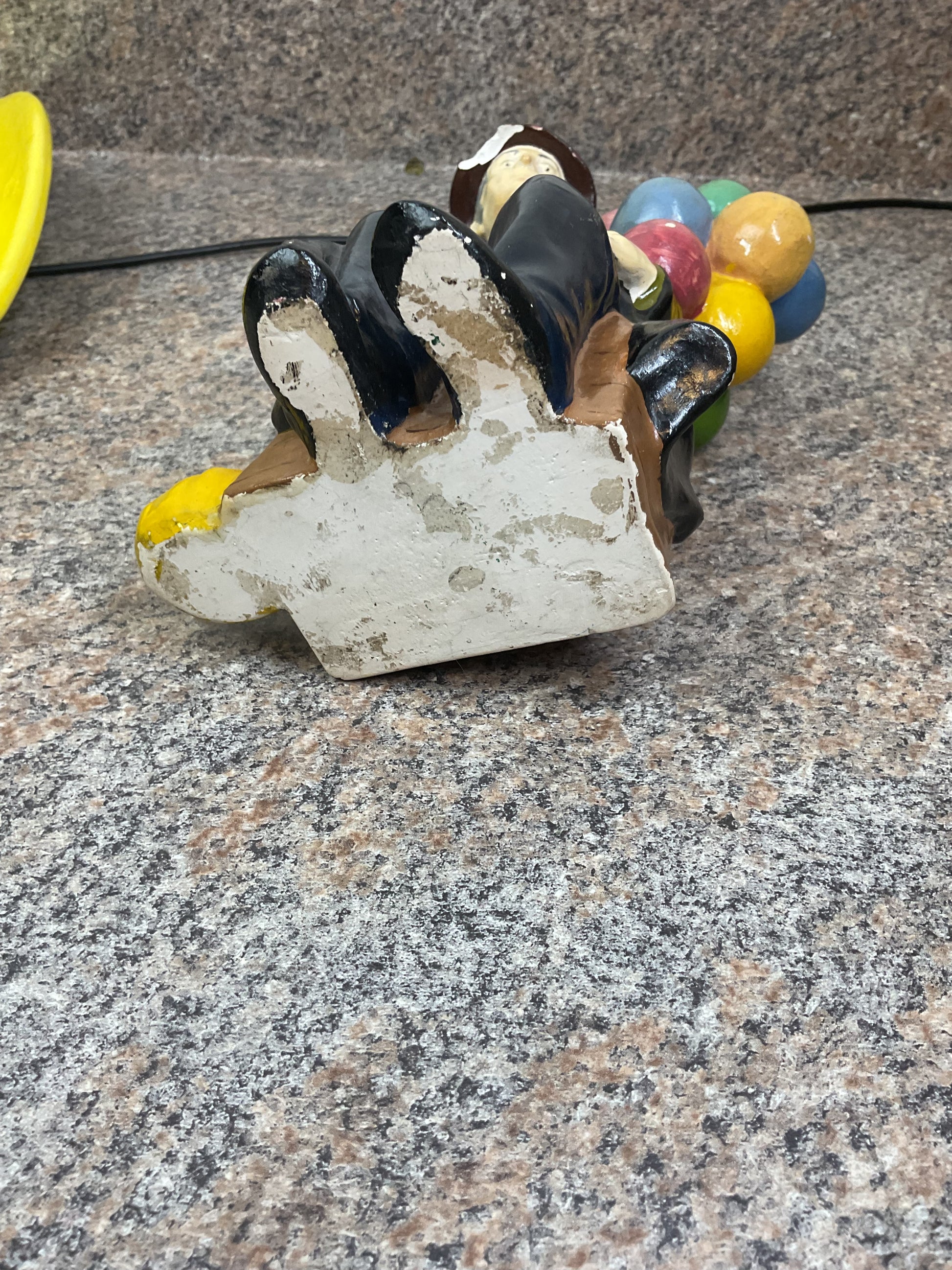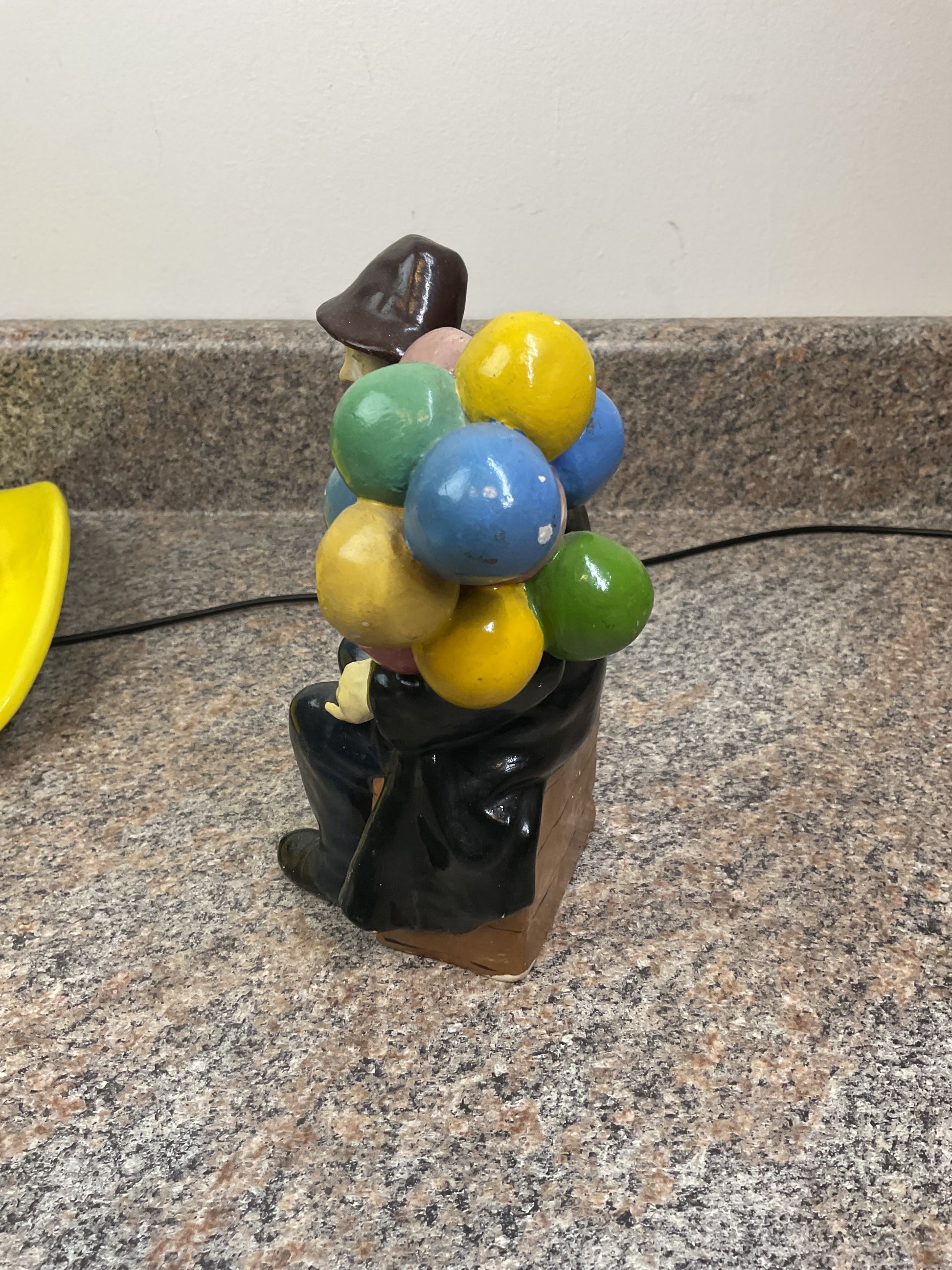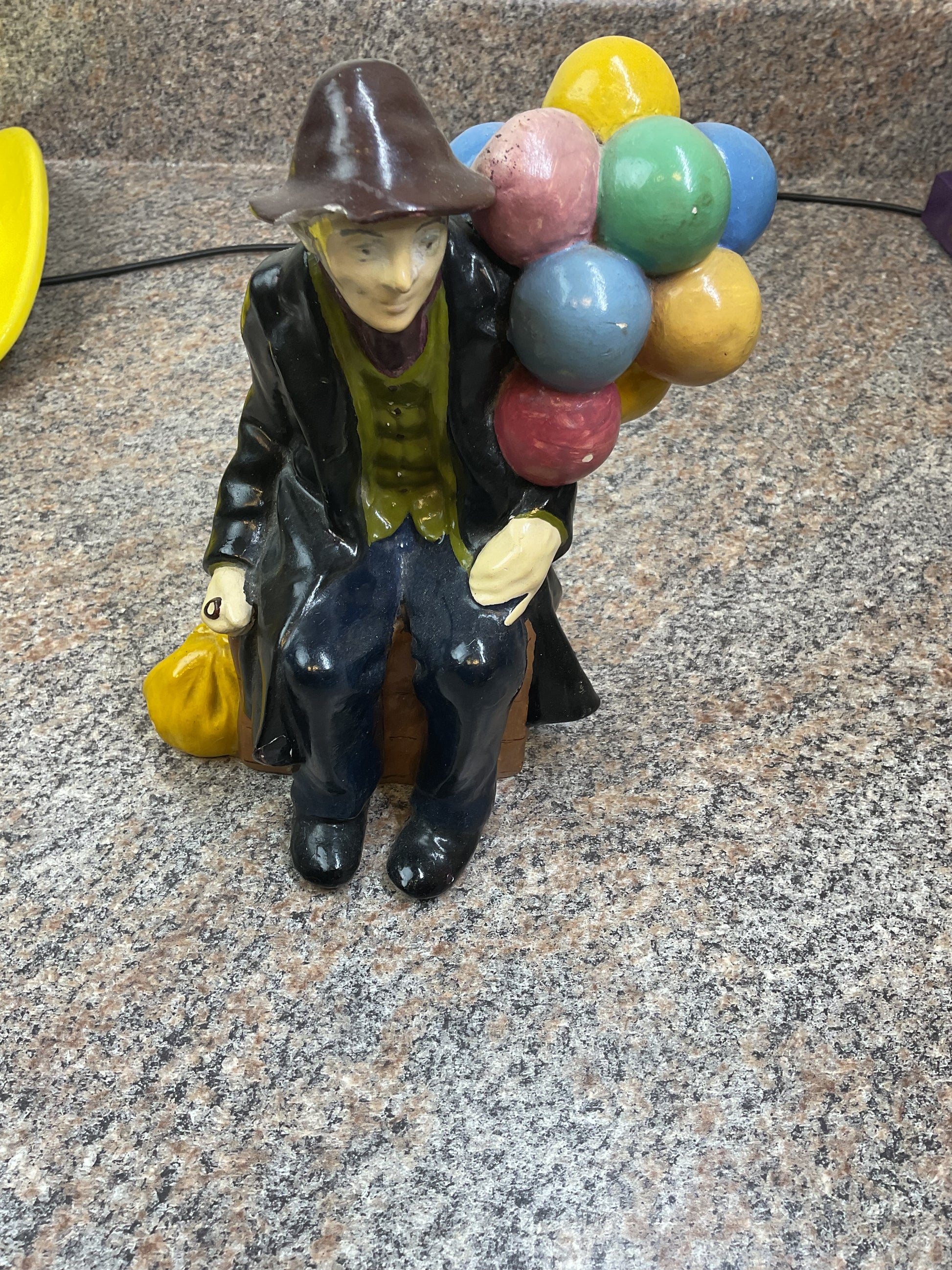 This classic balloon piece is a fun piece to liven up any space. This piece has a chip out of the front brim of the hat. And scratches around. Heavily discounted due to condition, get this deal now and enjoy the fun that the balloon man can bring to your room.