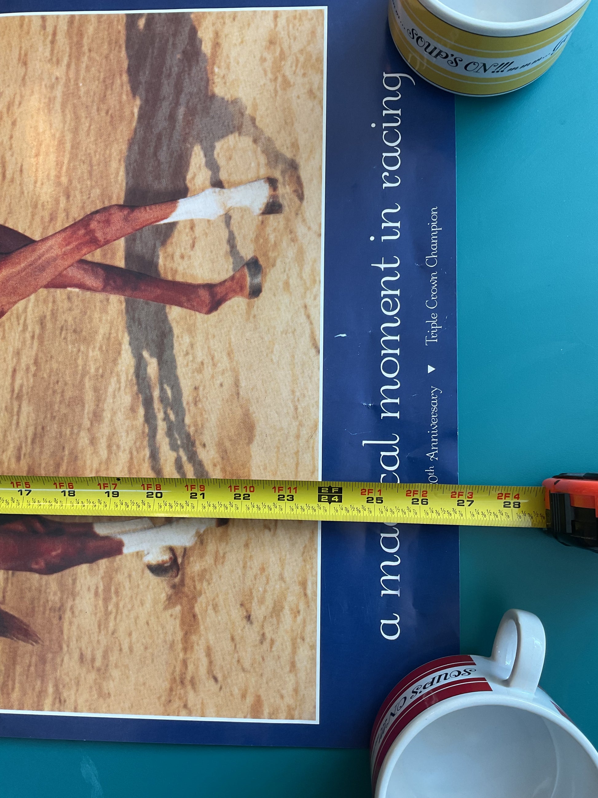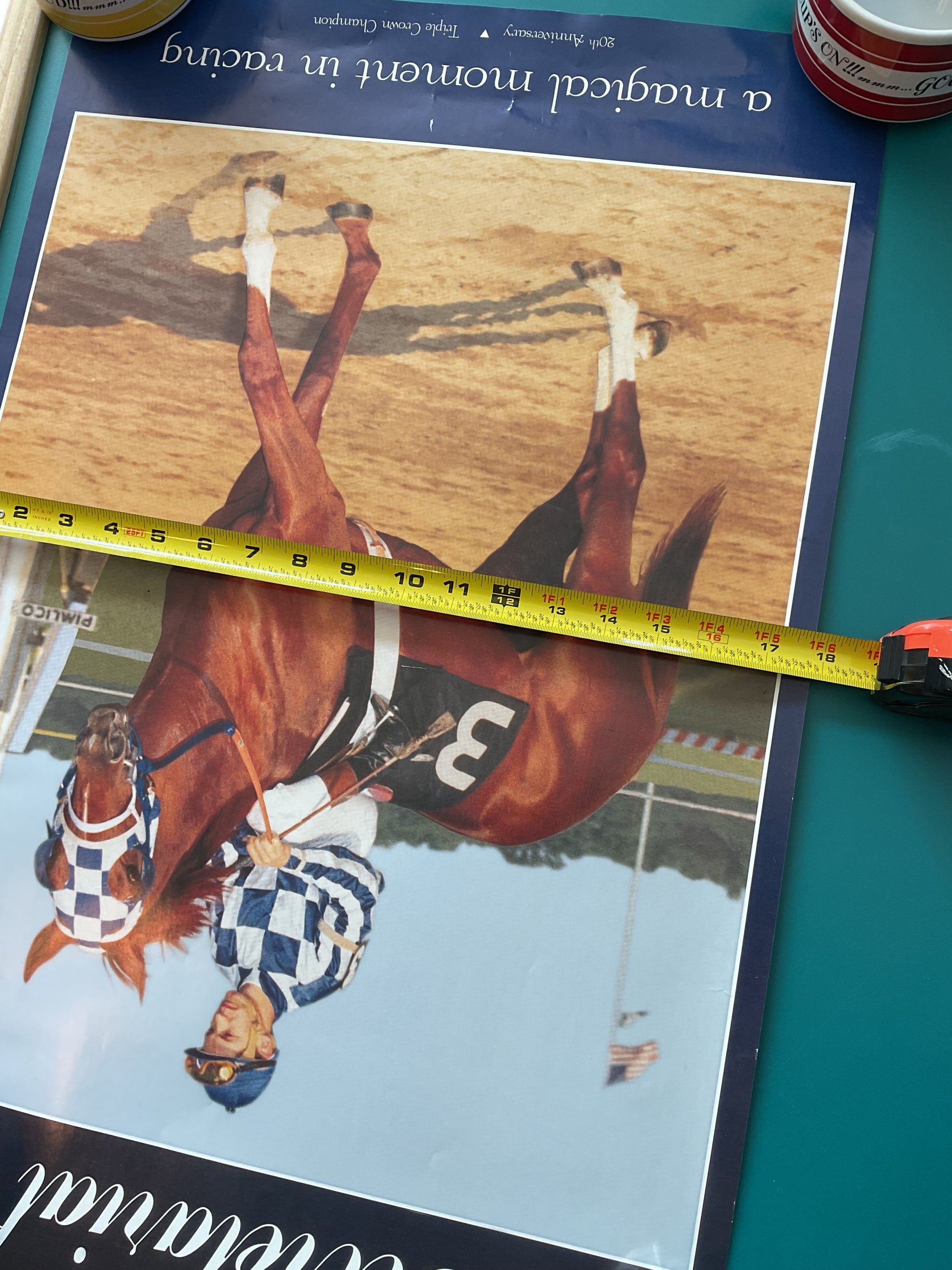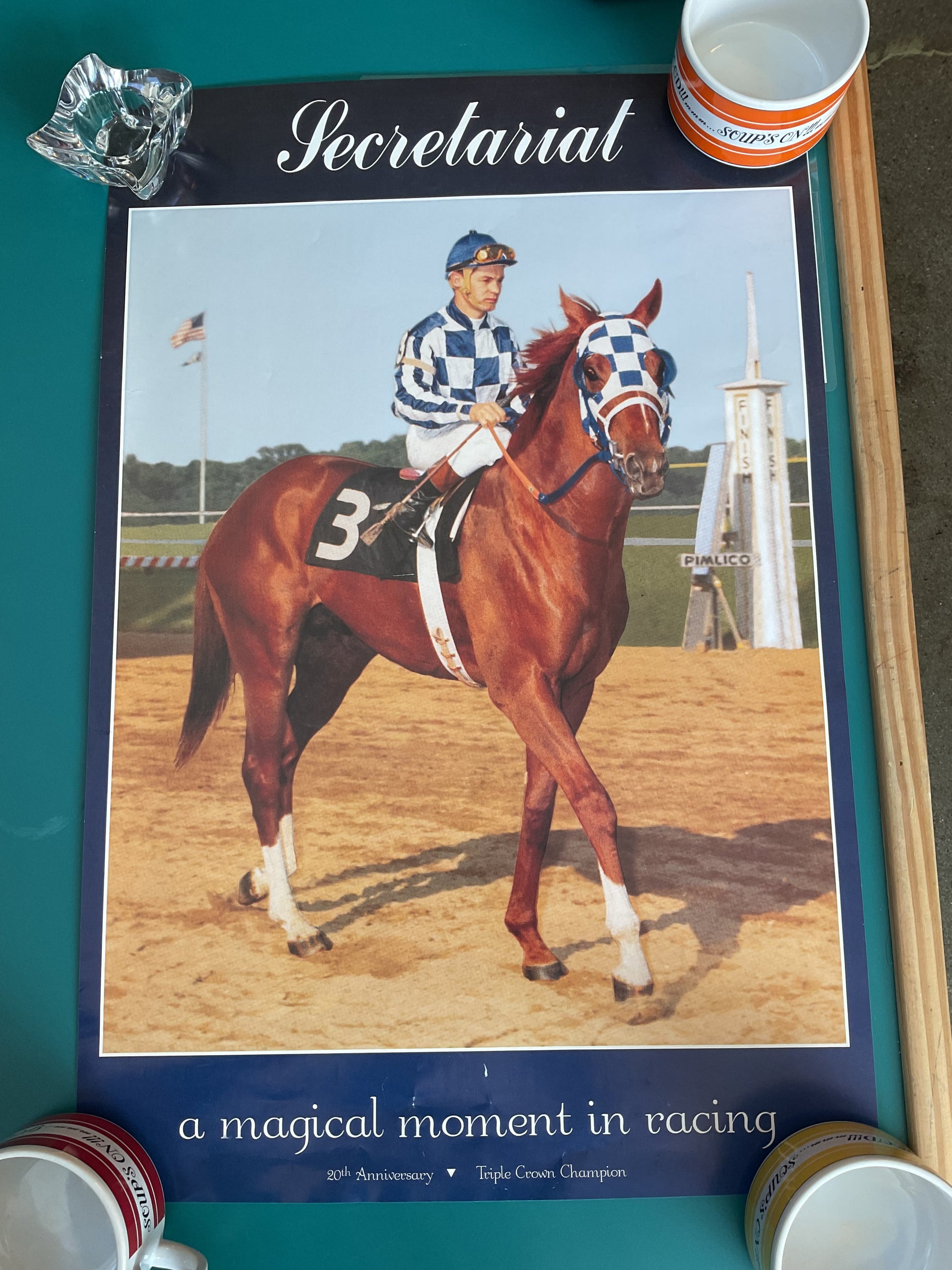 This Secretariat Poster was made to commemorate the 20th Anniversary of the legendary racehorse’s Triple Crown victory. Measures 27” tall by 18” wide. A few small scratches and creases that you can see in photos.
