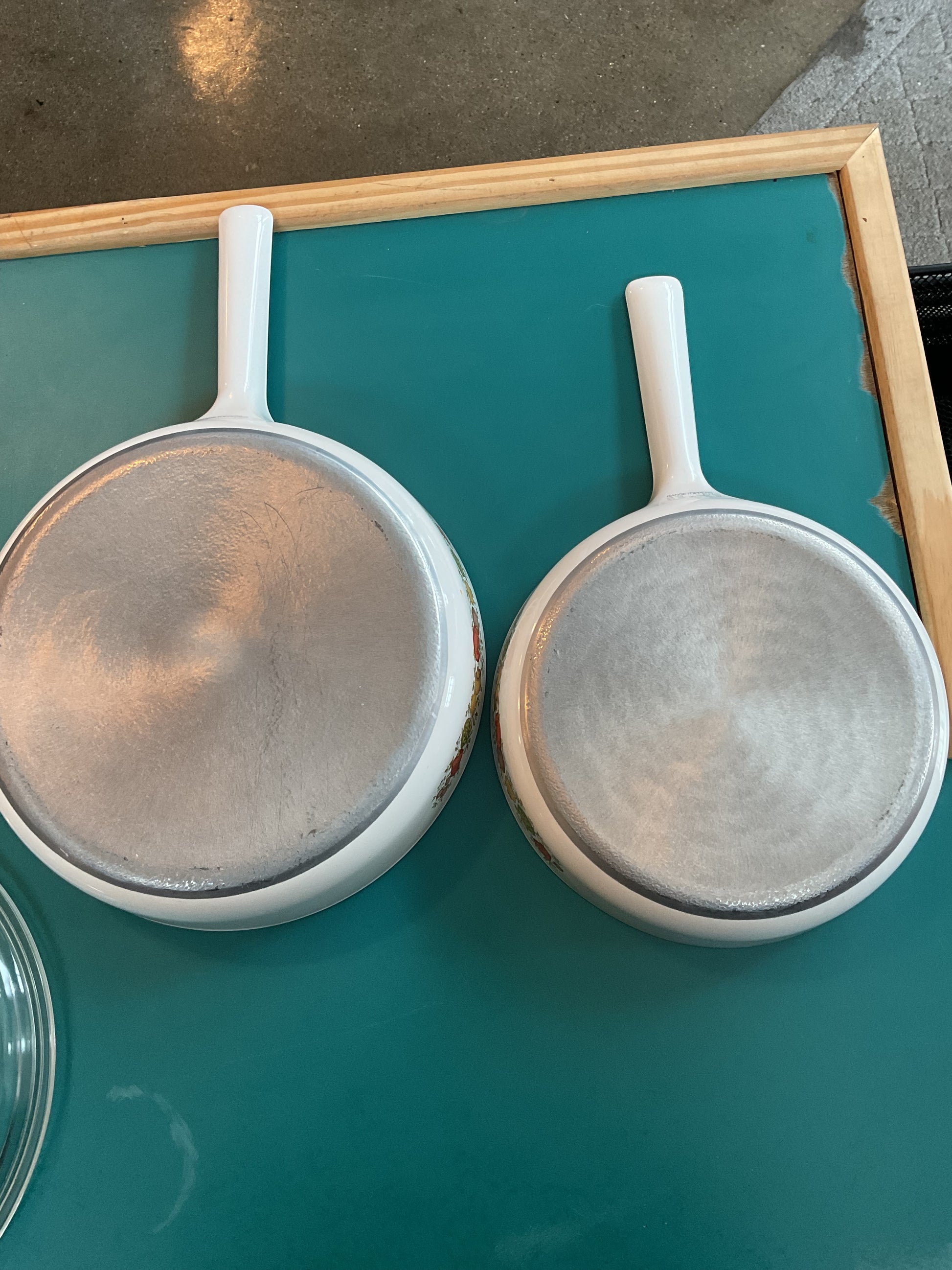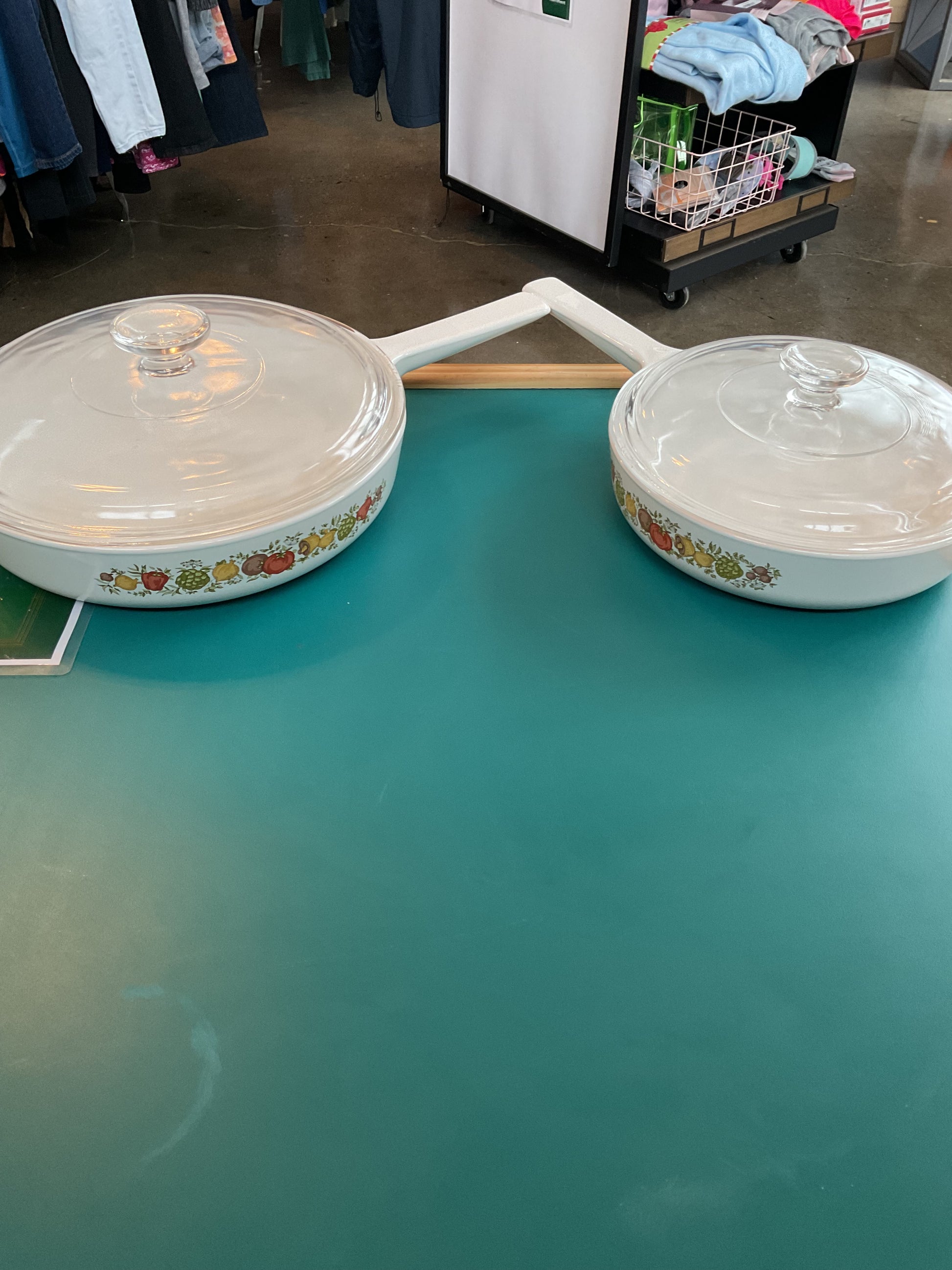 This set of two Rangetoppers pyroceram pans are made in the USA in Corning, NY. There condition is a testament to the quality of these pans. They are decorated with a beautiful, traditional style of various fruits and vegetables. These pans are perfect for displaying or cooking. The 10” pan has some very small scratches on the bottom (pictured), but otherwise in perfect shape. Get yours now!