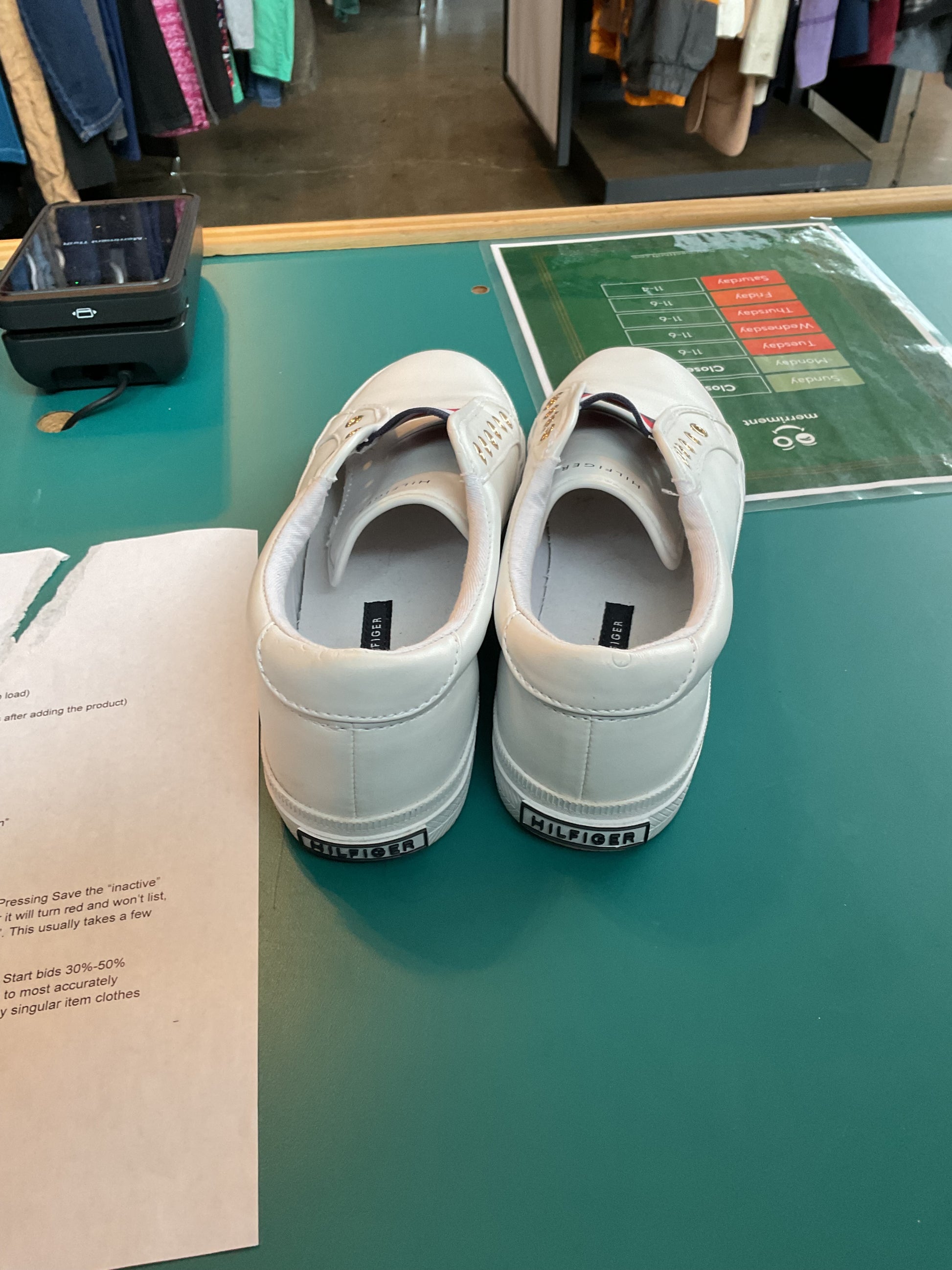 Tommy Hilfiger Size 8 Women’s Slip On Shoes. A minimalist design with a white base and the signature Tommy Hilfiger Stripes, these shoes will go with any outfit you have. Add them to your closet now.