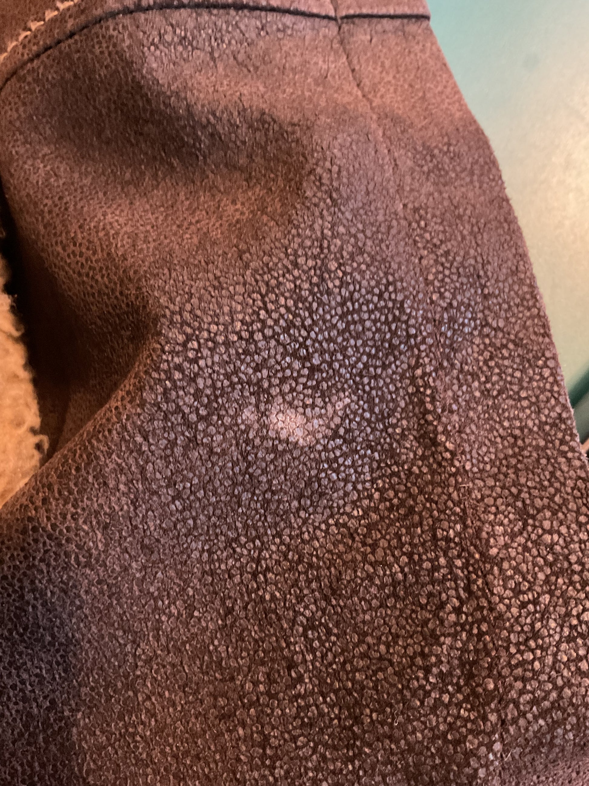 Bernardo Leather Shearling Jacket Coat Suede Size Large Oversized Parka. The jacket is in really nice pre-owned condition. The jacket closure zips and/or buttons up. The sleeves can be rolled up to reveal the faux fur lining or rolled down for a simpler look. There are two full size pockets, there is a very small stain on the back at the bottom (included in pictures)
