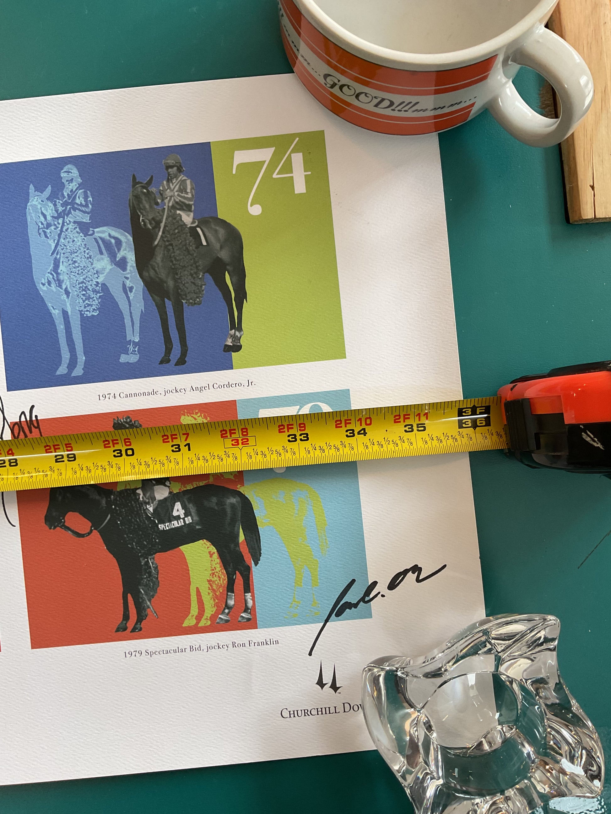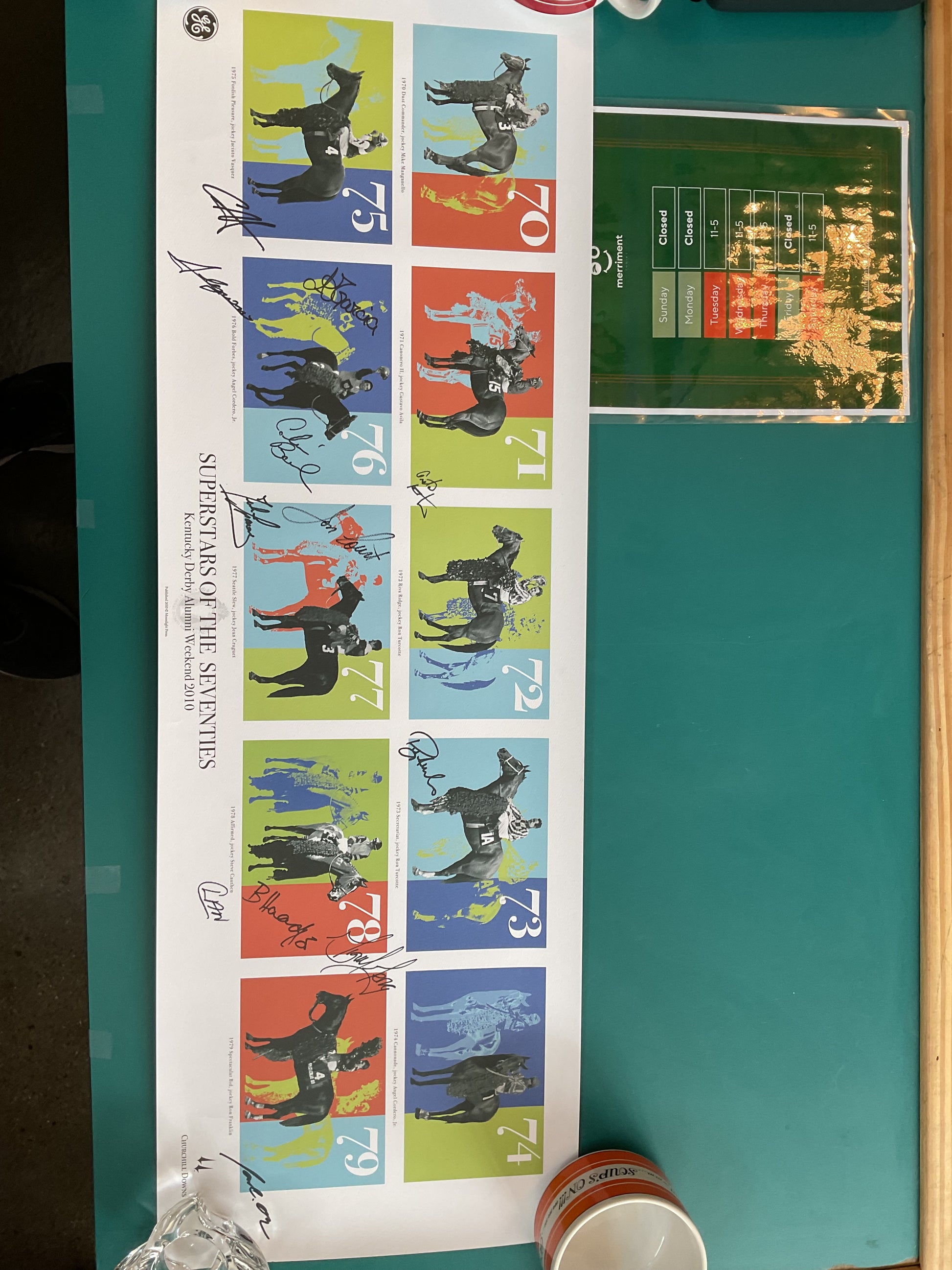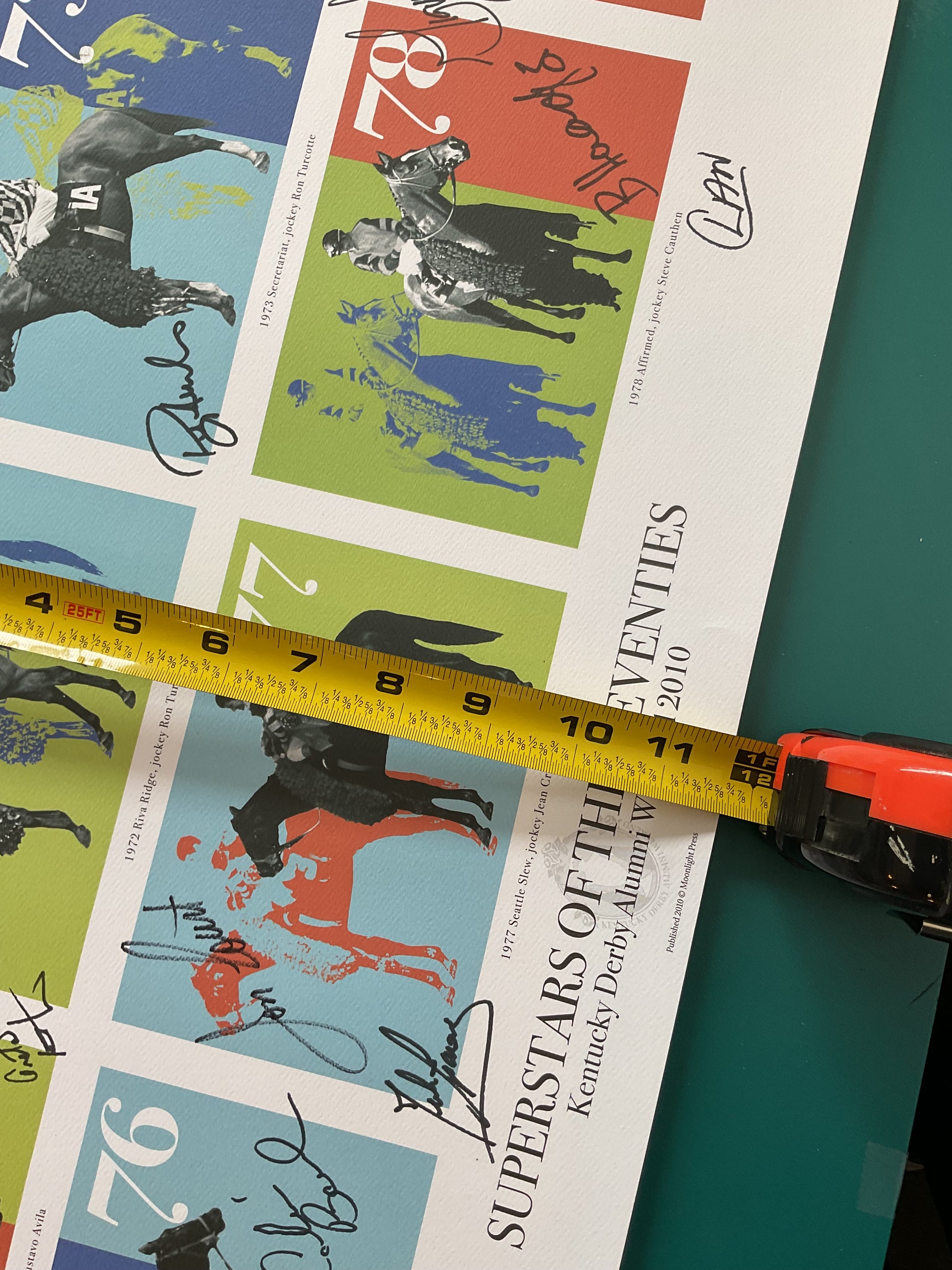 This poster was created to honor the ten horses and Jockeys who won the Kentucky Derby in the Seventies. It is signed as well. It measures 36” wide by 11.75” tall. A really cool design.