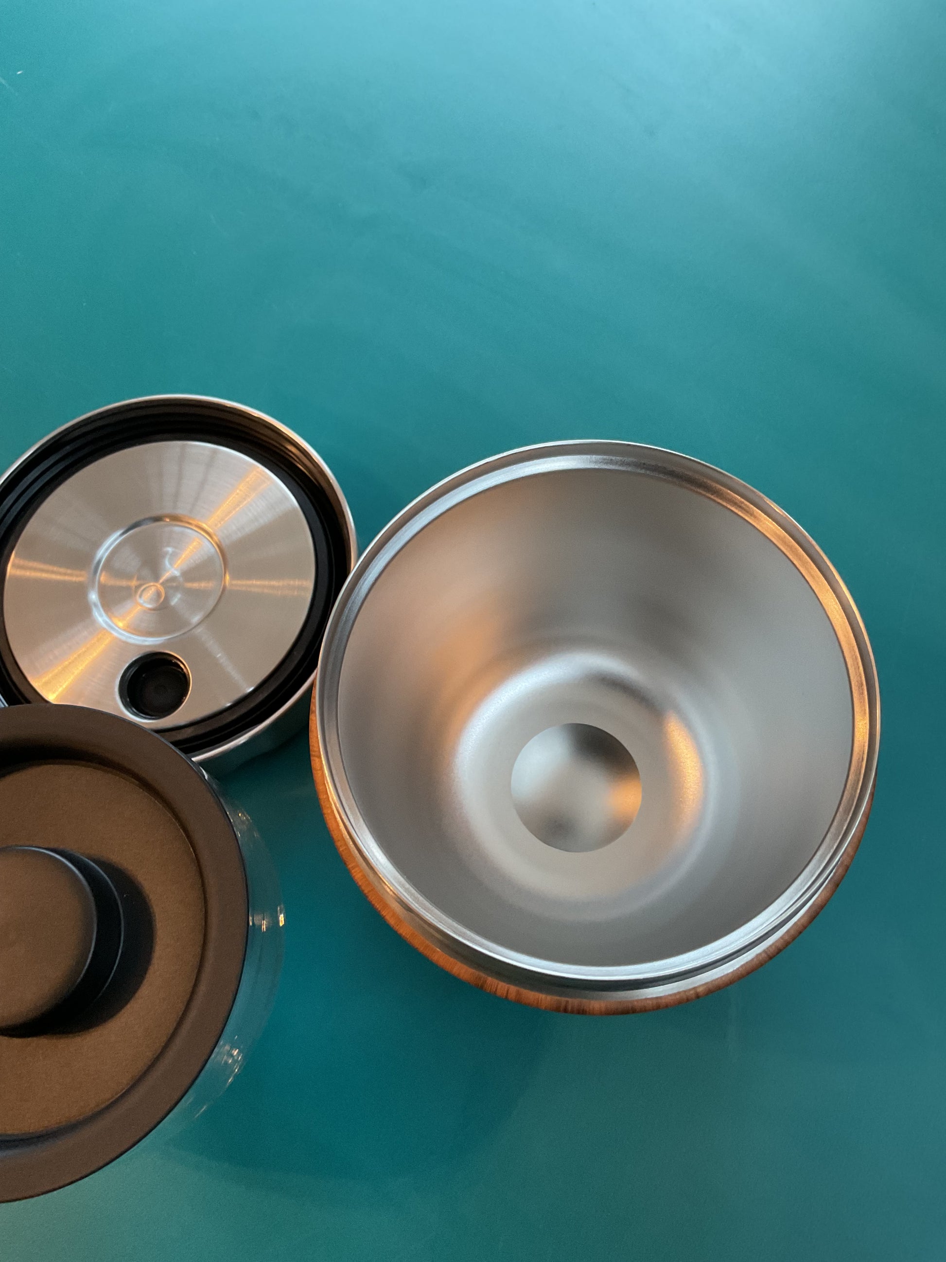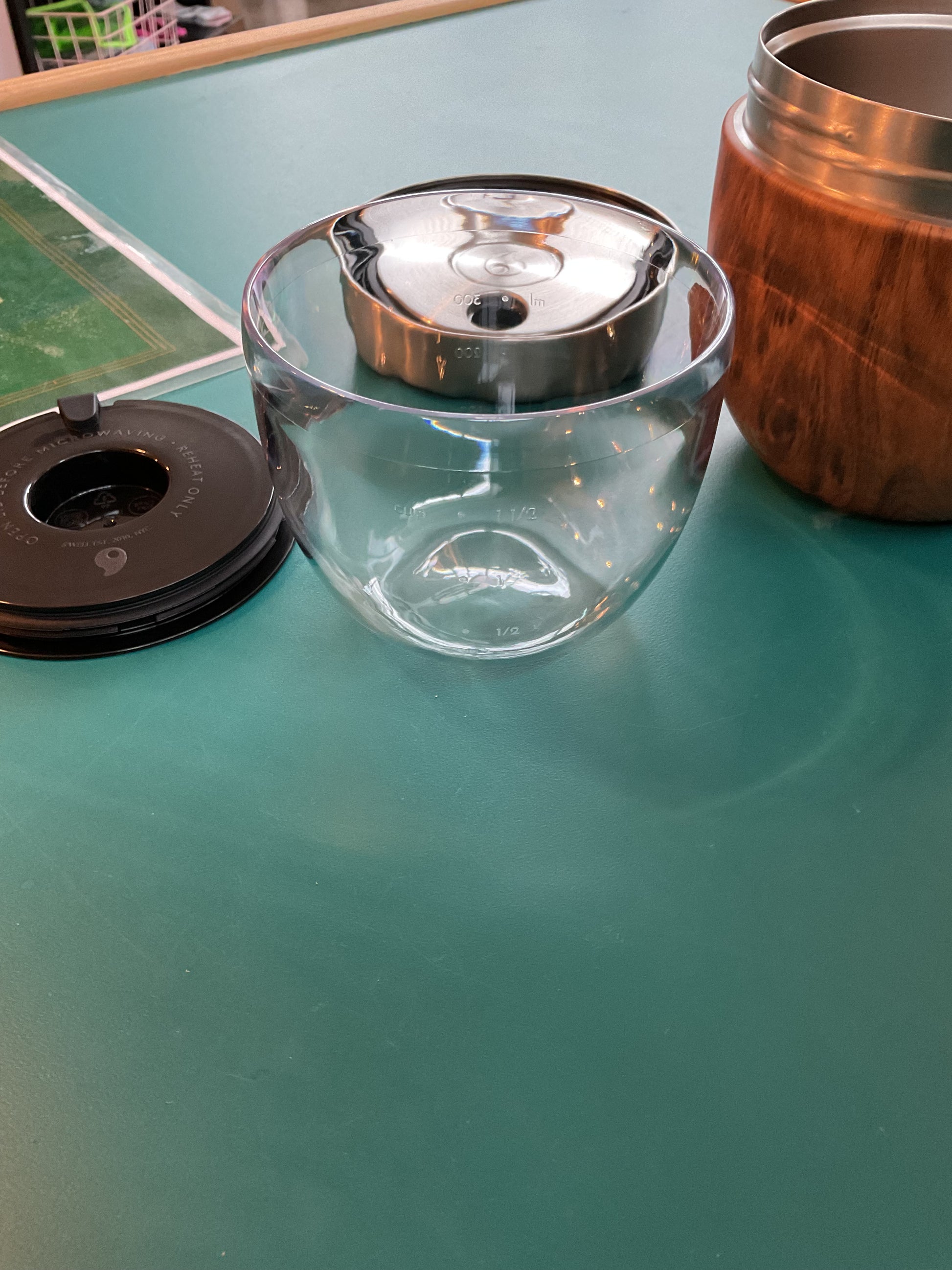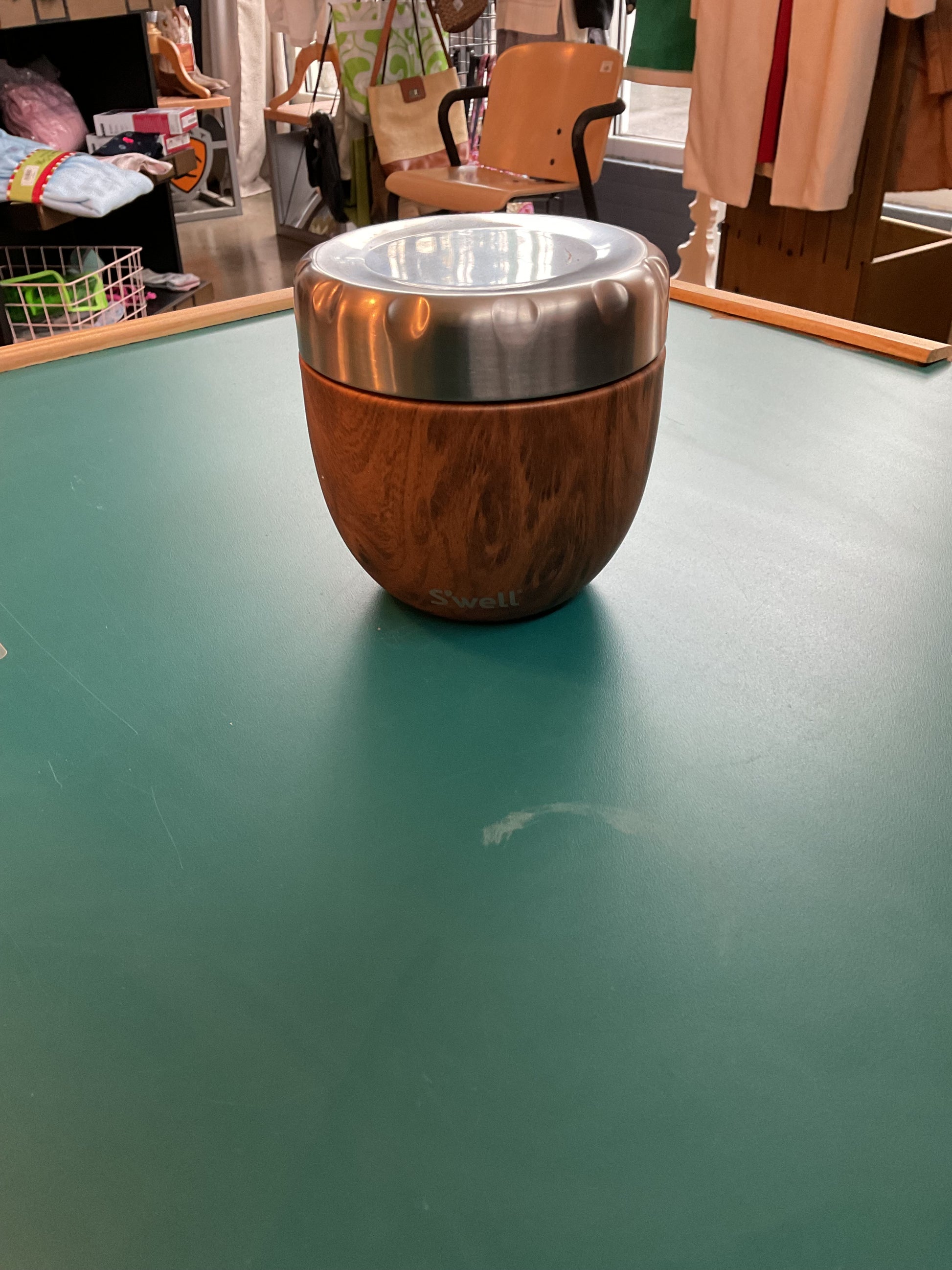 Perfect for on the go, can keep food cold or hot. Interior bowl is perfect for prep with its included measurements. Nice aesthetic with the wood grain finish with stainless top. It is 21.5 ounce size and measures 5” tall with a 4.5” diameter.
