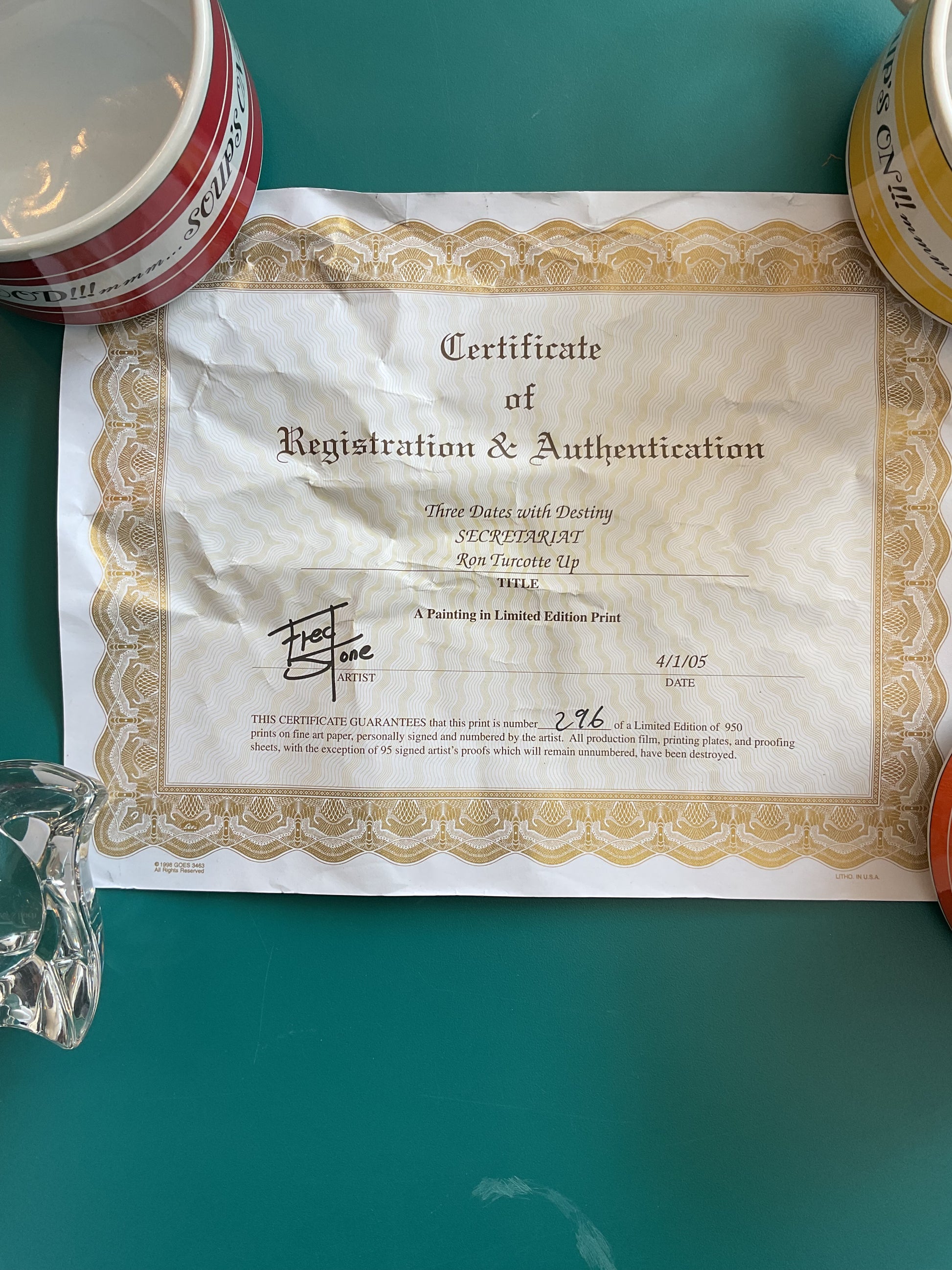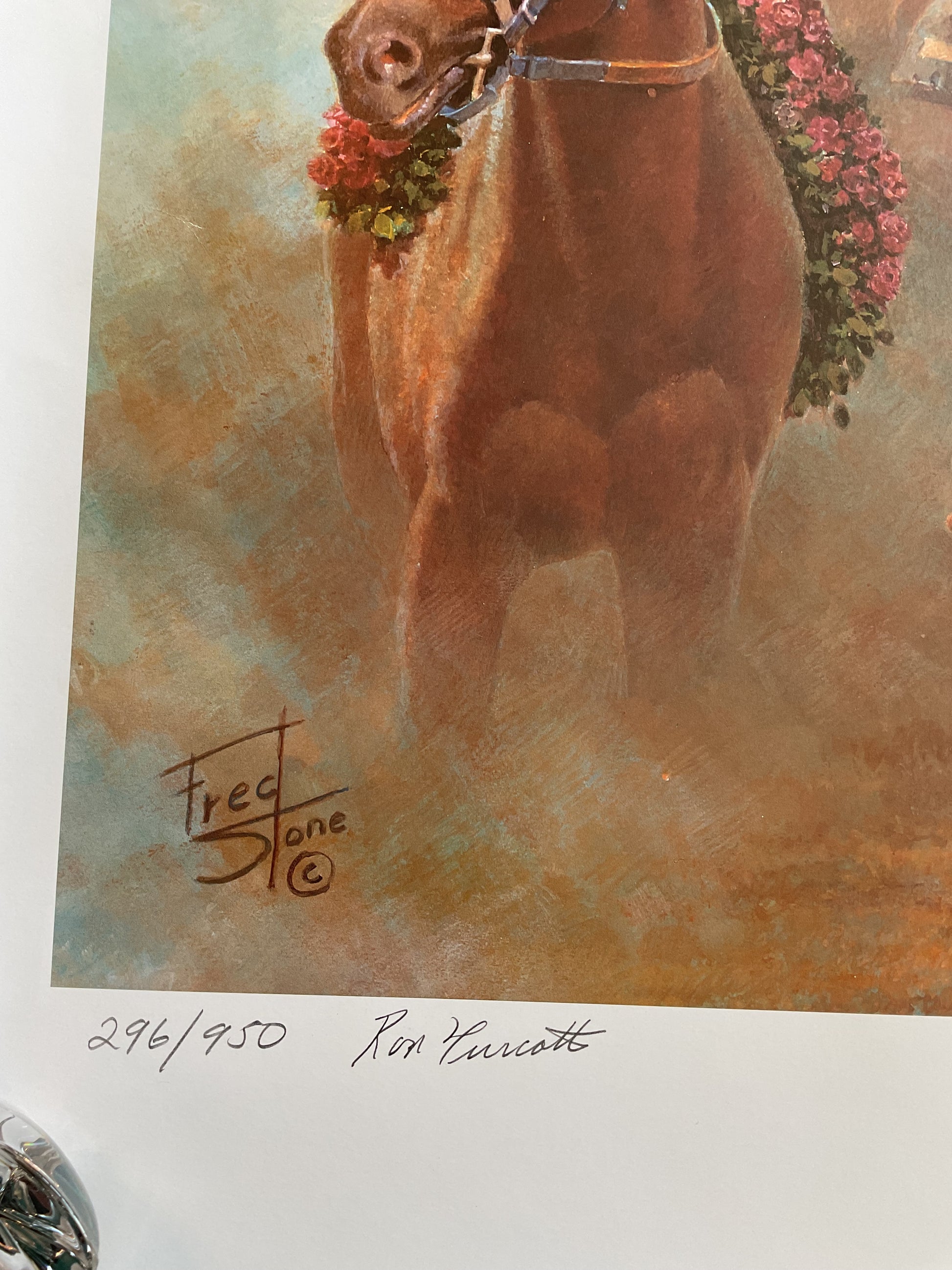 This print by Fred Stone is a limited edition print commemorating the Triple Crown ran by Secretariat. Fred Stone hand signed and has a letter of authentication with it. It was made in 2005 and is #296 or 950. It measures 32.5” wide by 21” tall