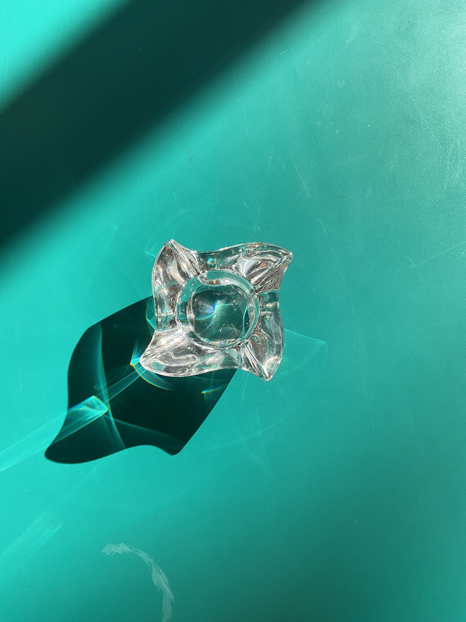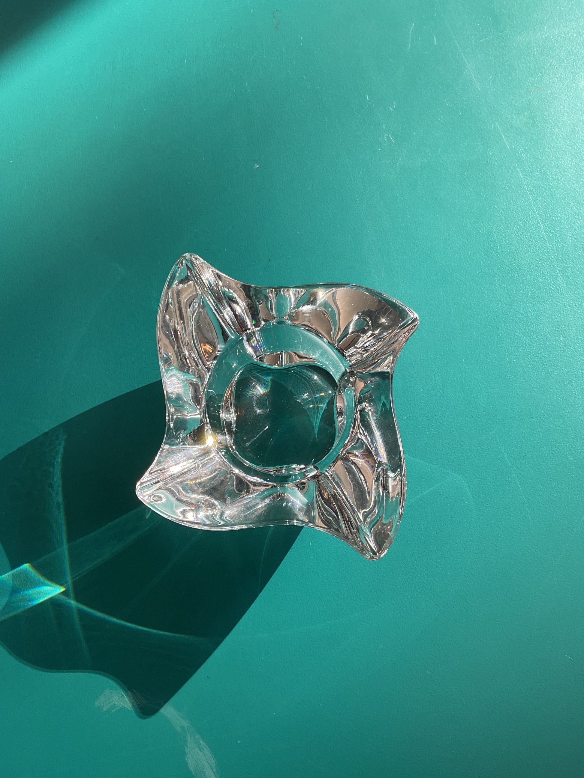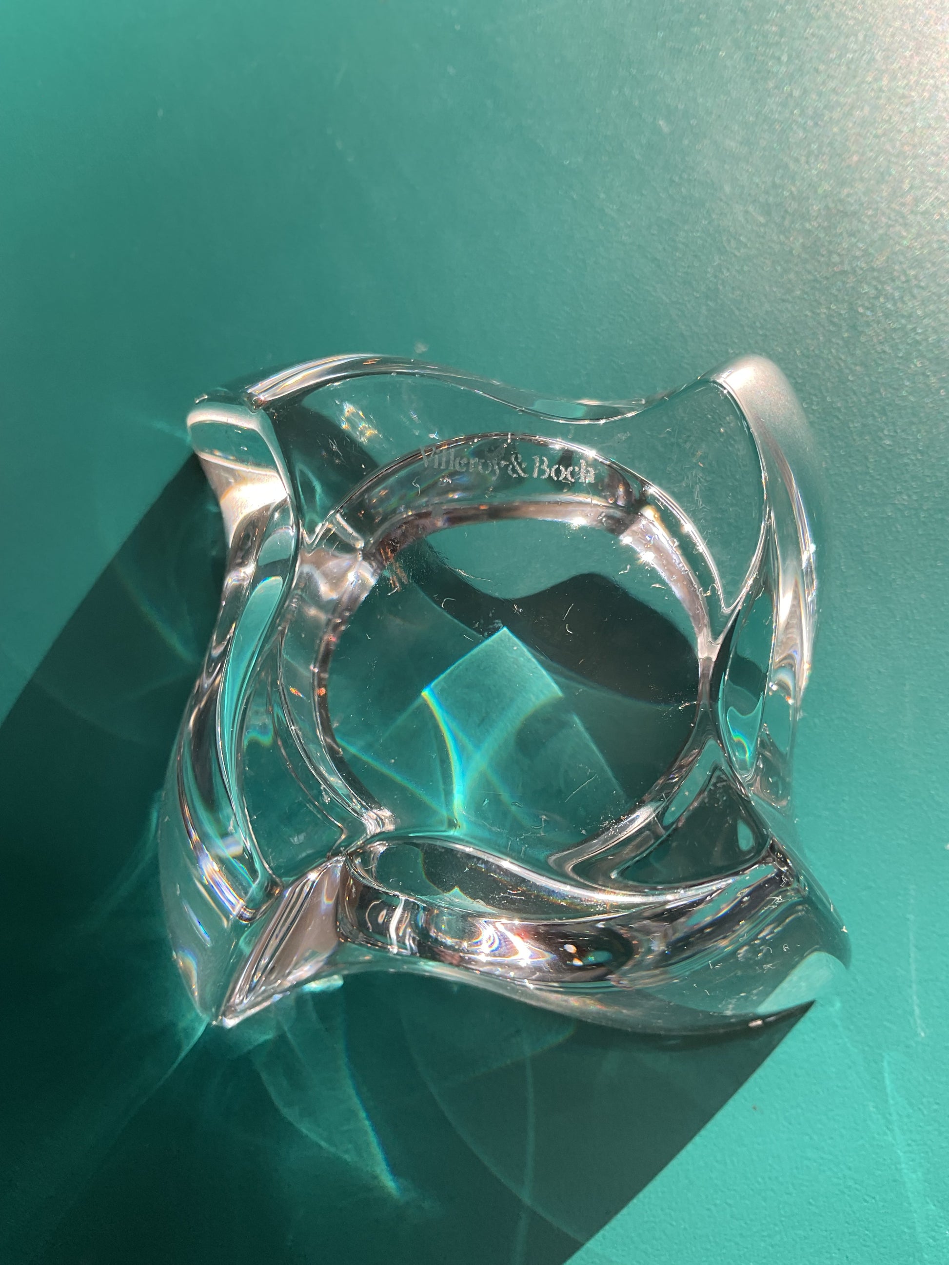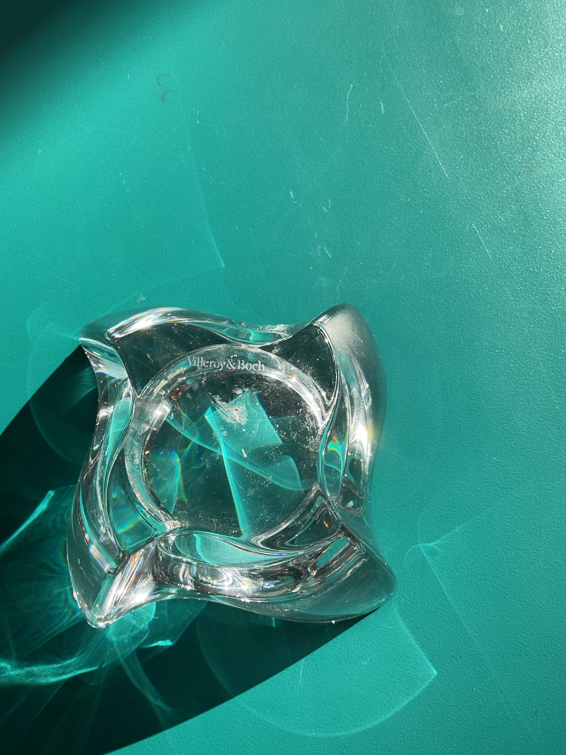 This Villeroy & Boch is a beautiful design with a slight twist between the 4 corners. Two of the corners rise higher than the others. This piece’s beauty is highlighted when hit by sunlight. Perfect in a front living or entryway that receives a lot of natural light. Diagonal is 4” long and diameter of candle holder is 1.5”. Get yours now!!!!