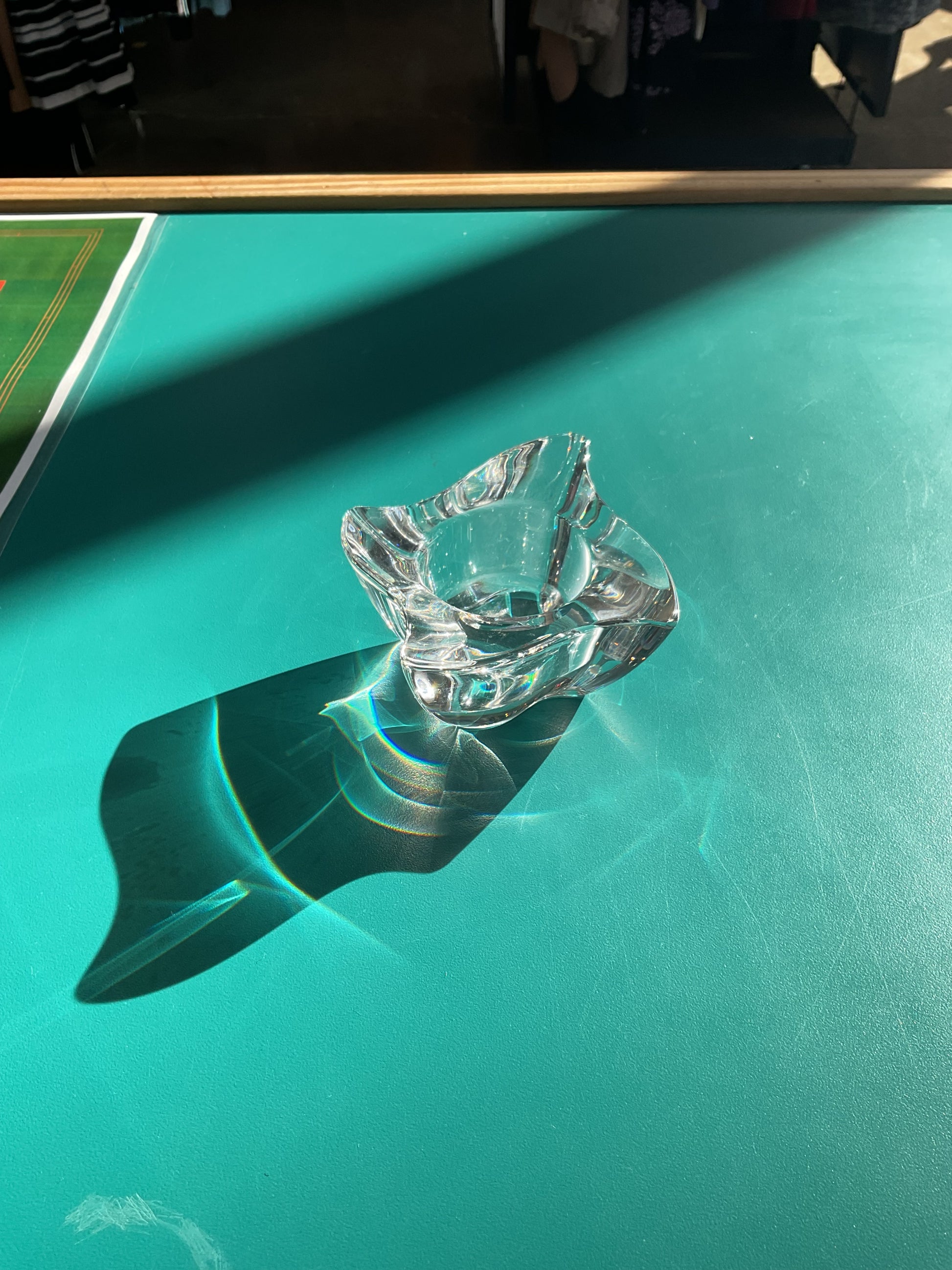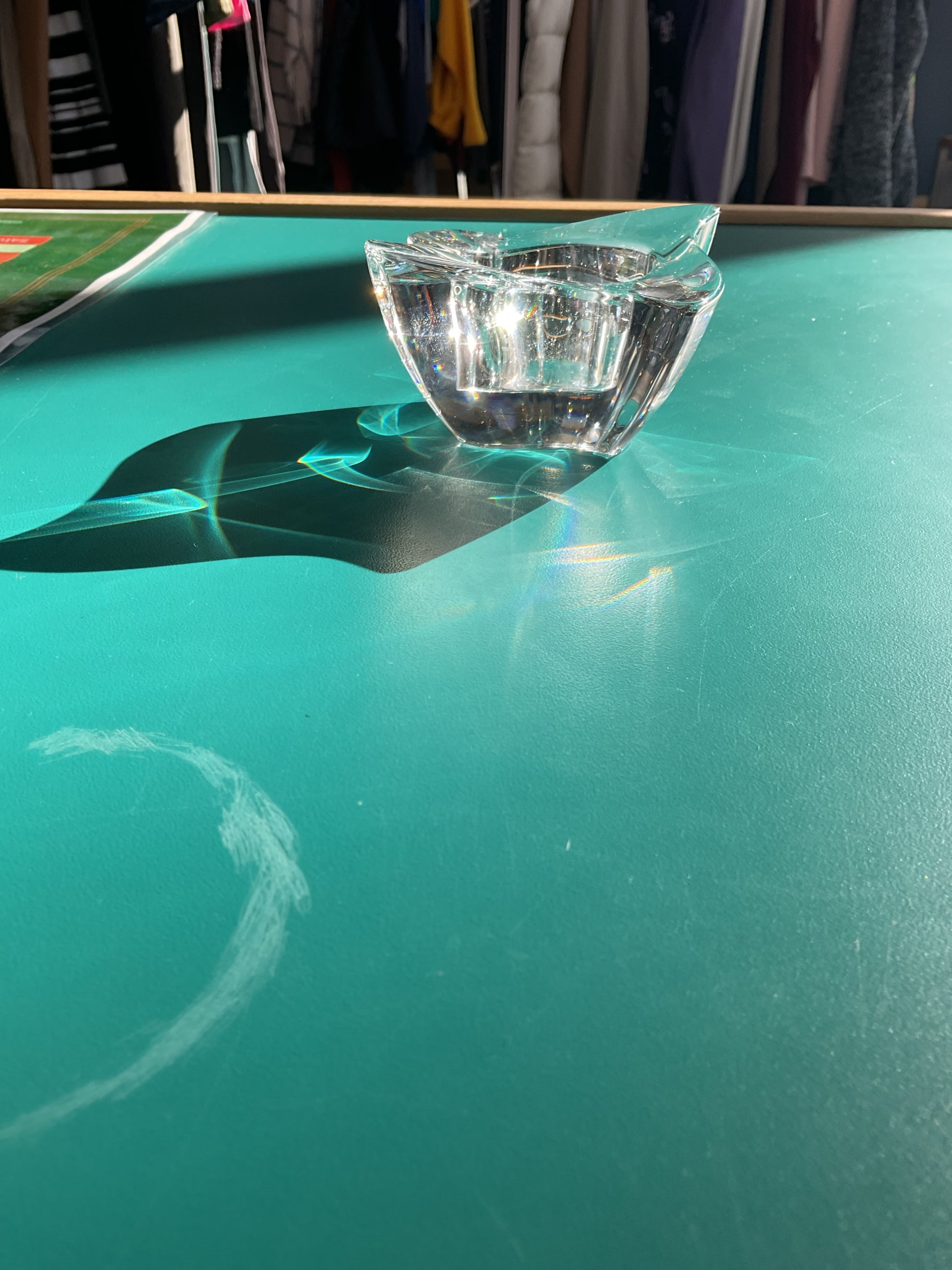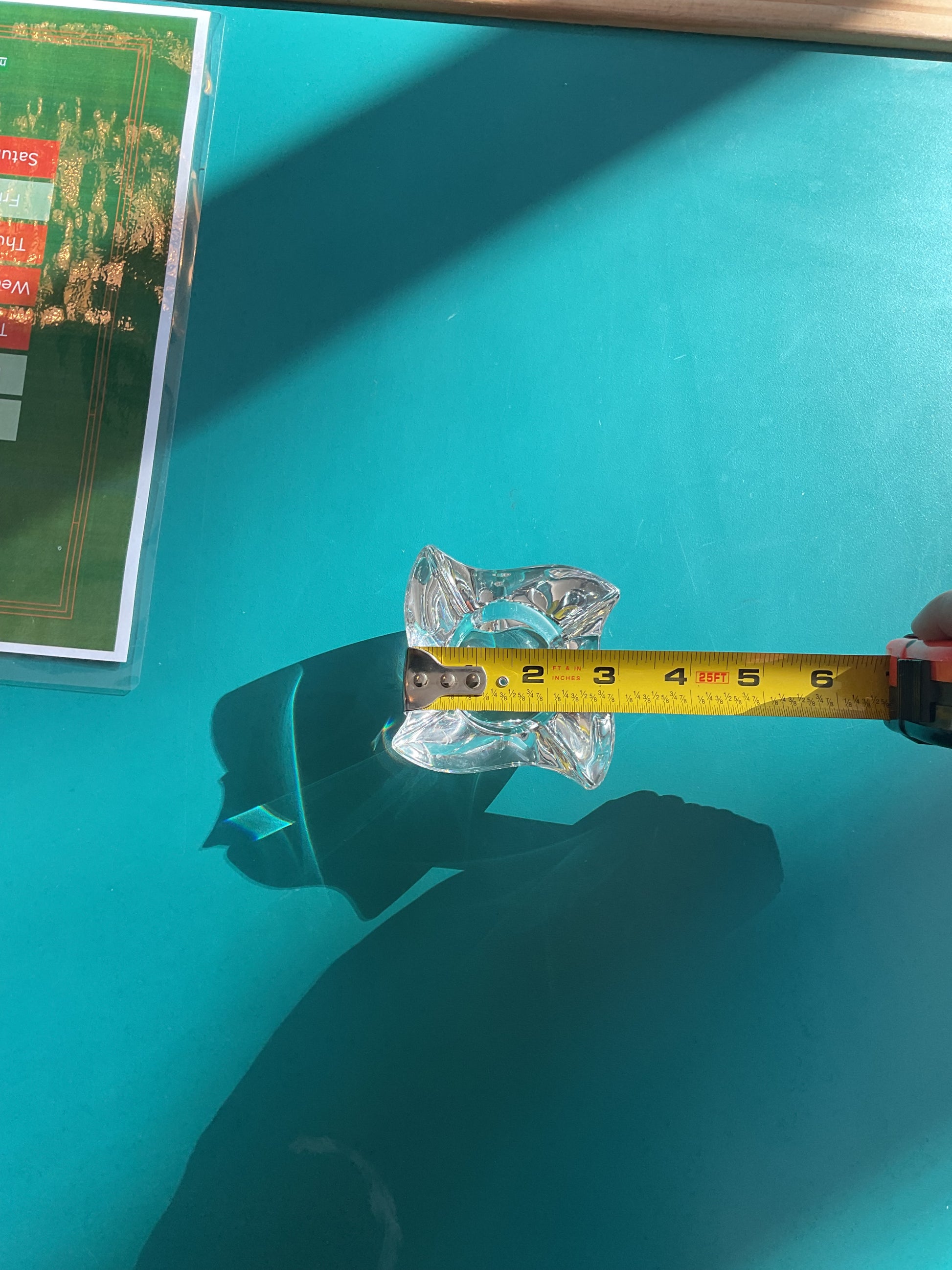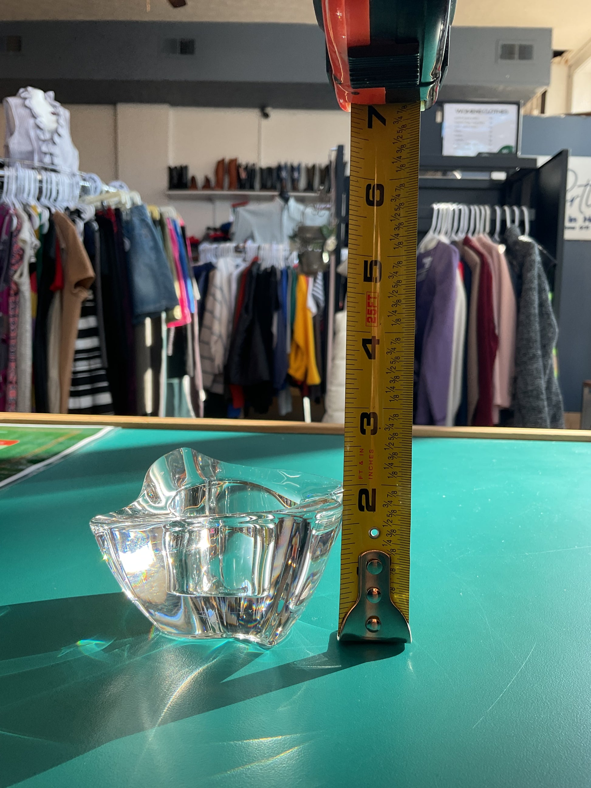 This Villeroy & Boch is a beautiful design with a slight twist between the 4 corners. Two of the corners rise higher than the others. This piece’s beauty is highlighted when hit by sunlight. Perfect in a front living or entryway that receives a lot of natural light. Diagonal is 4” long and diameter of candle holder is 1.5”. Get yours now!!!!