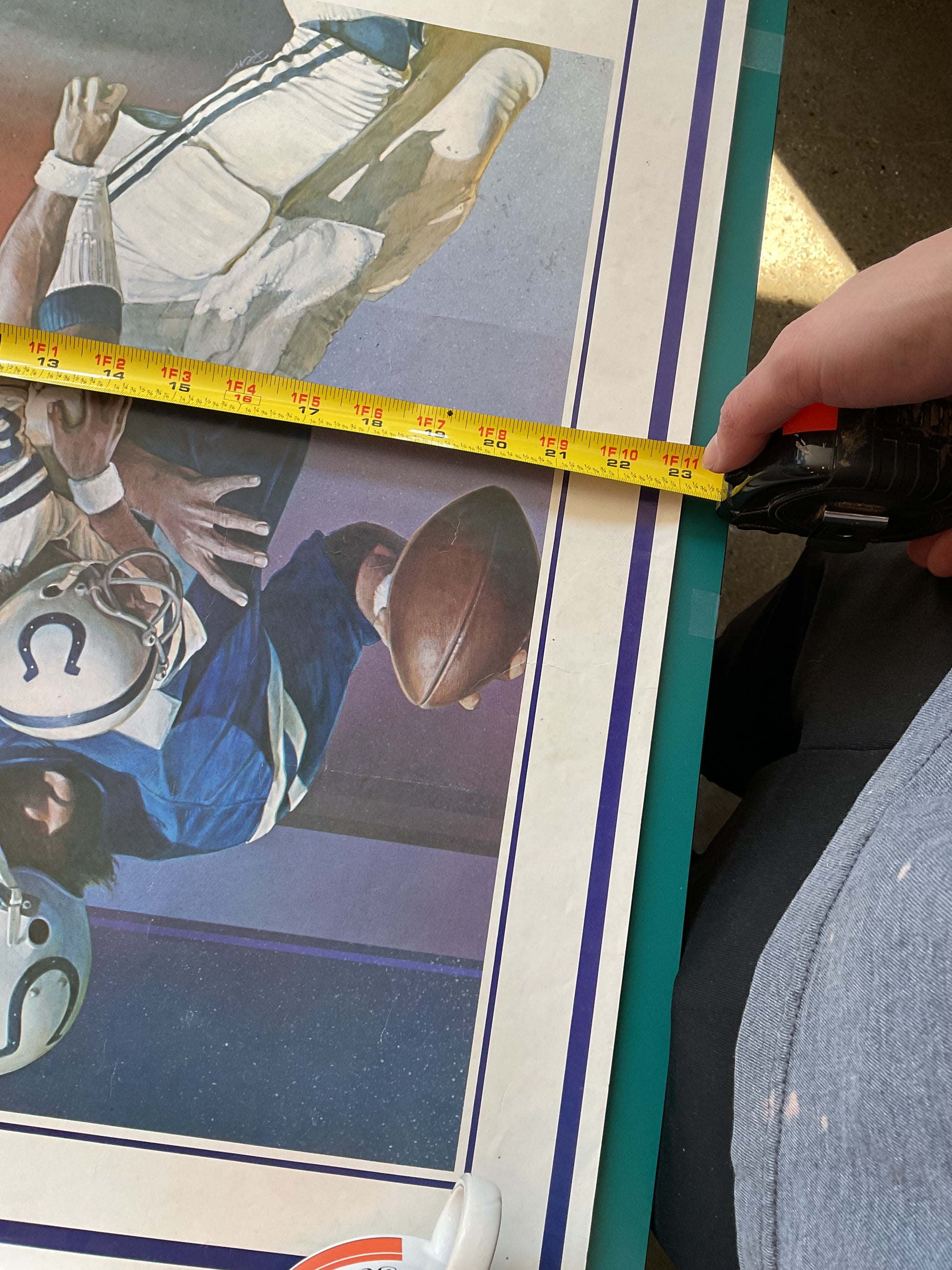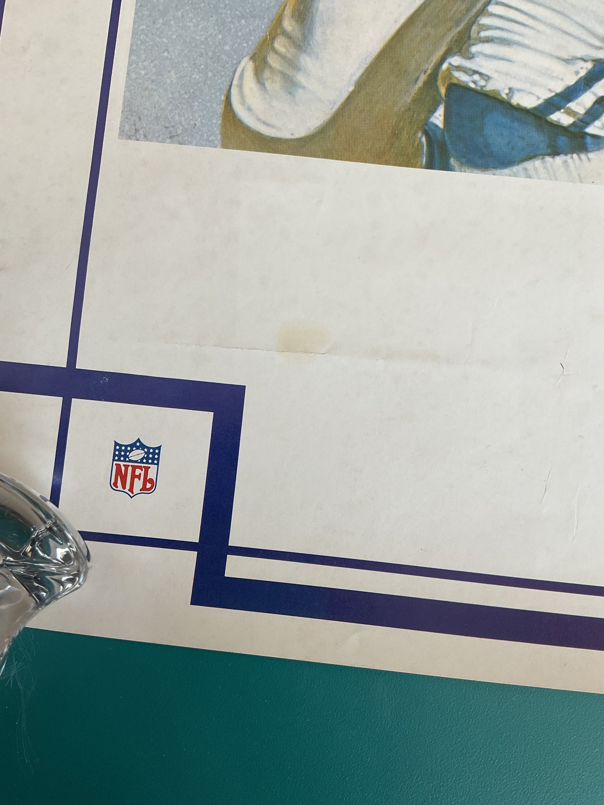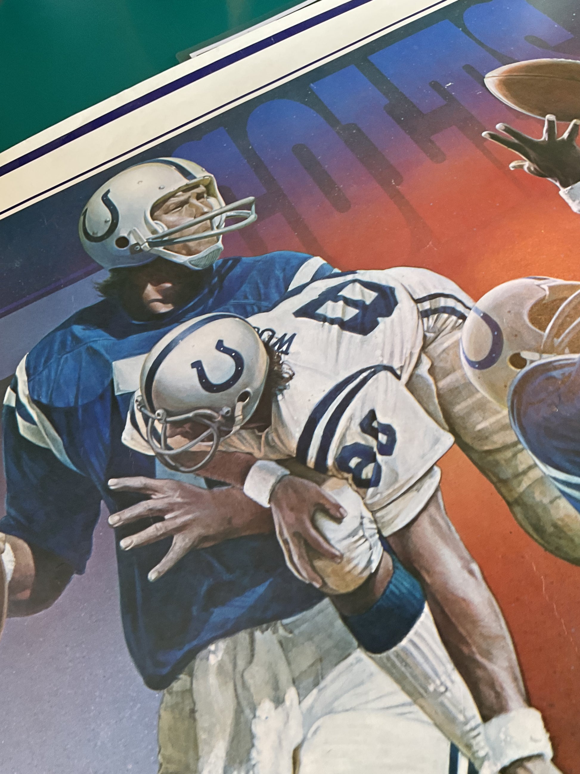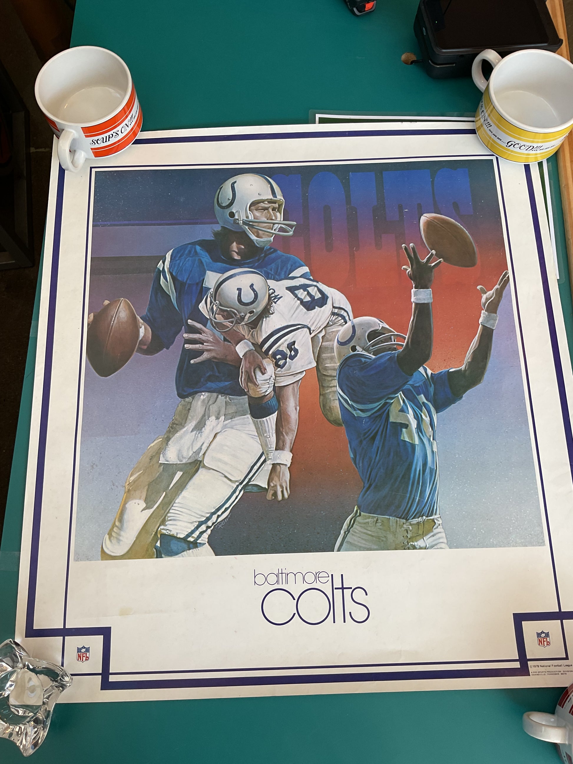 This poster is perfect for the collector of NFL memorabilia, Baltimore, or Indianapolis Colts fans. It does have pinhole needles in all corners from being hung up and has some natural coloring over it.