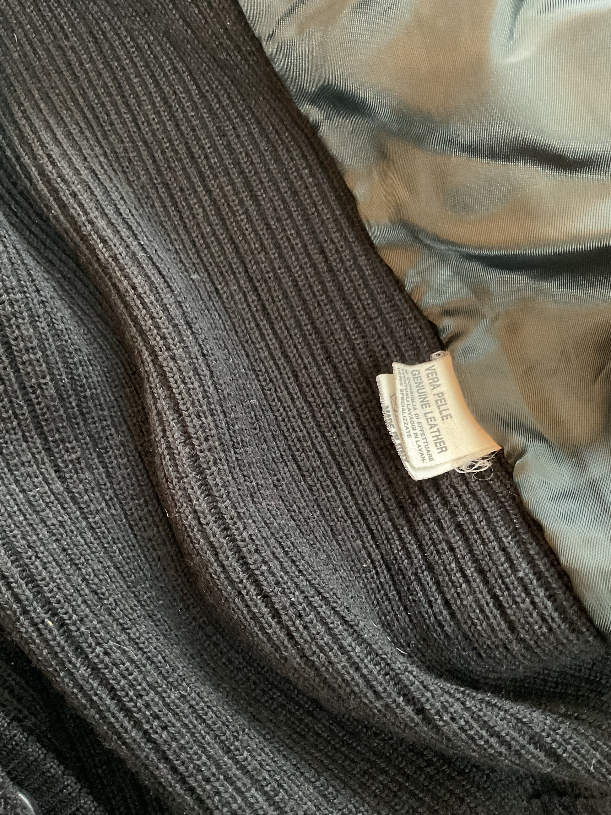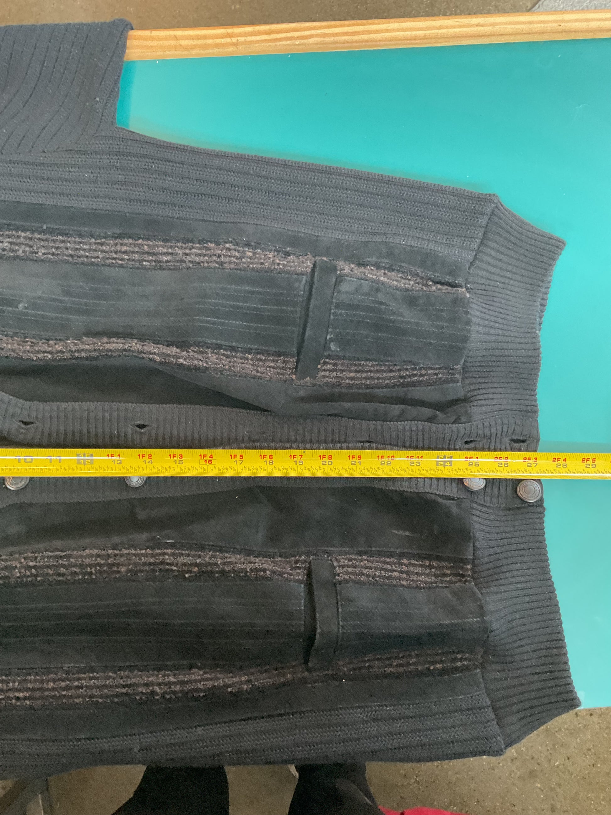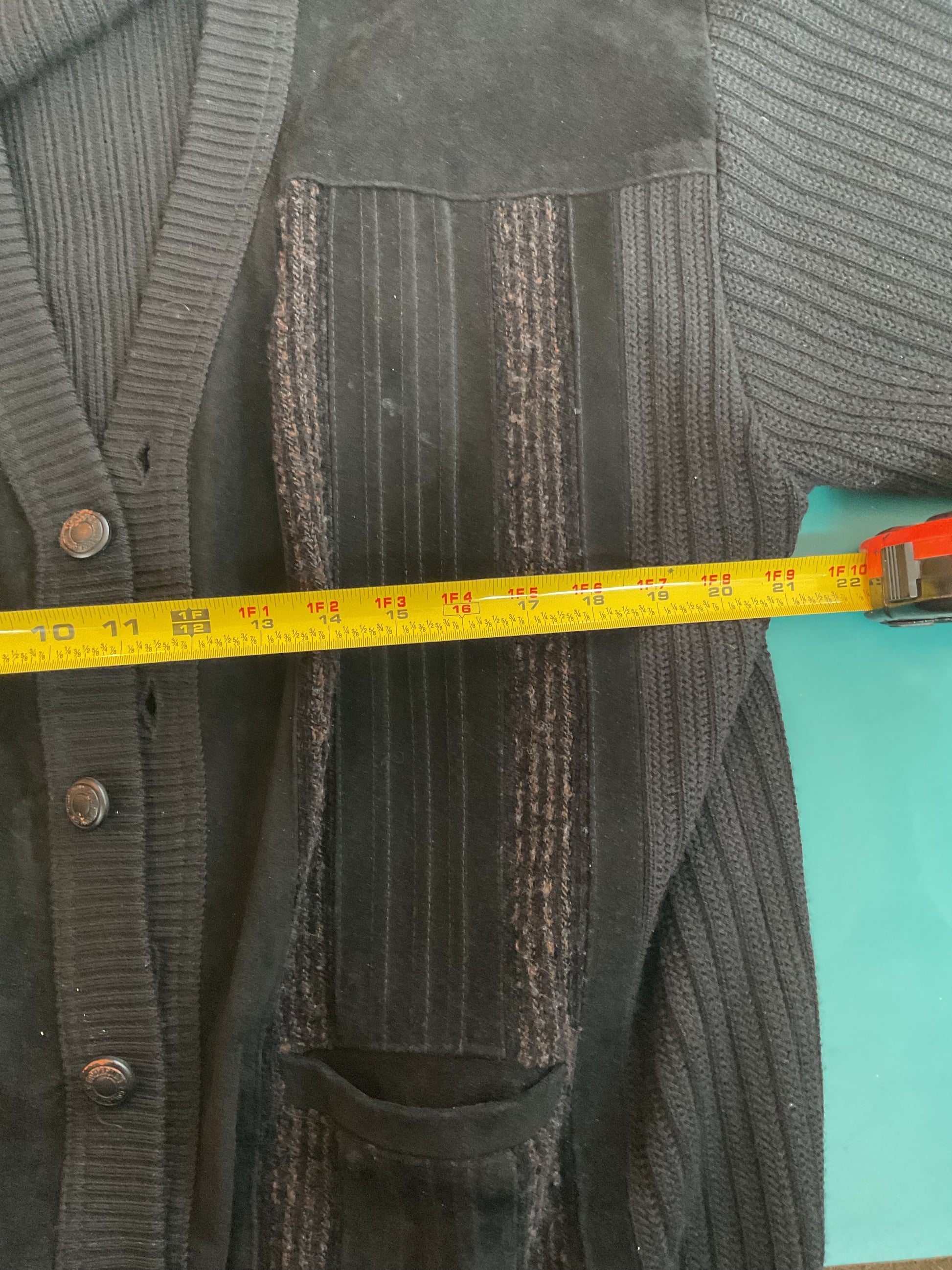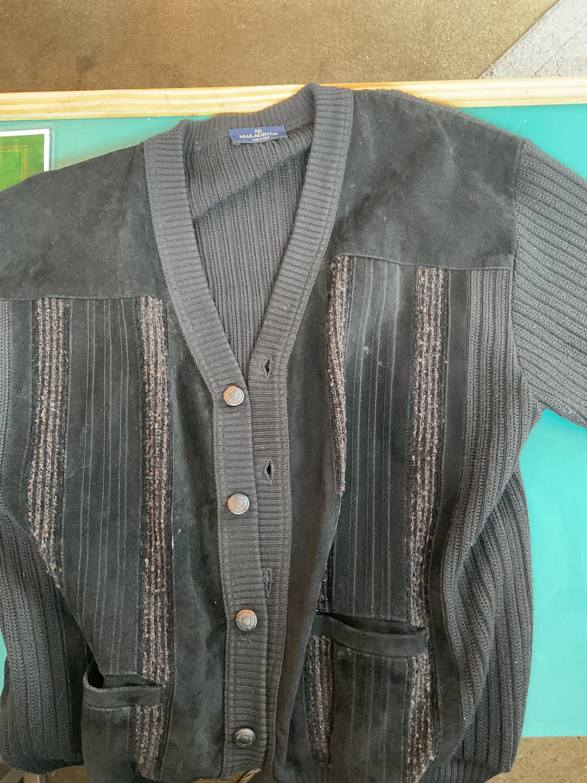 Get this vintage knit cardigan from Malagrida to stay cozy in style. Whether you are lounging around the house or going out with friends, this cardigan will help keep you looking good and feeling comfy. It is made from 50/50 cotton and fiber mix, with accents made from real leather. Measurements included in pictures.