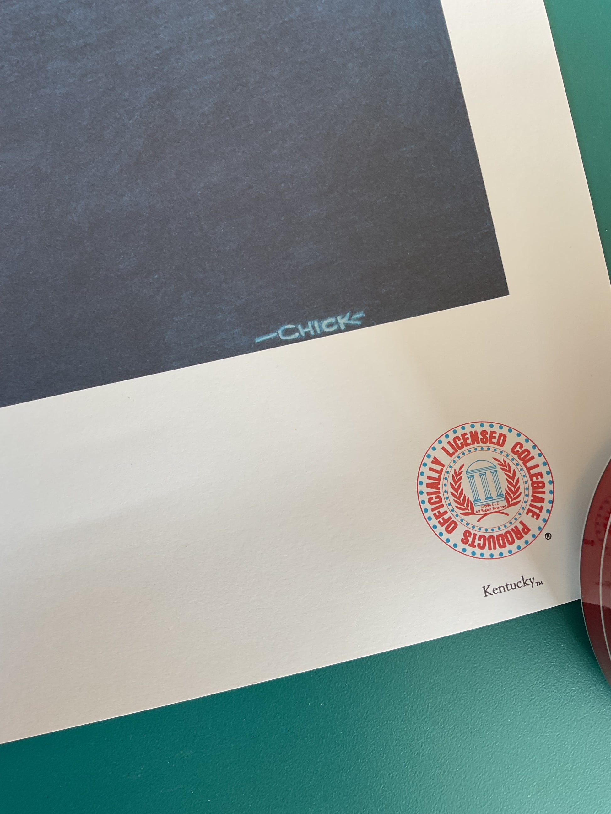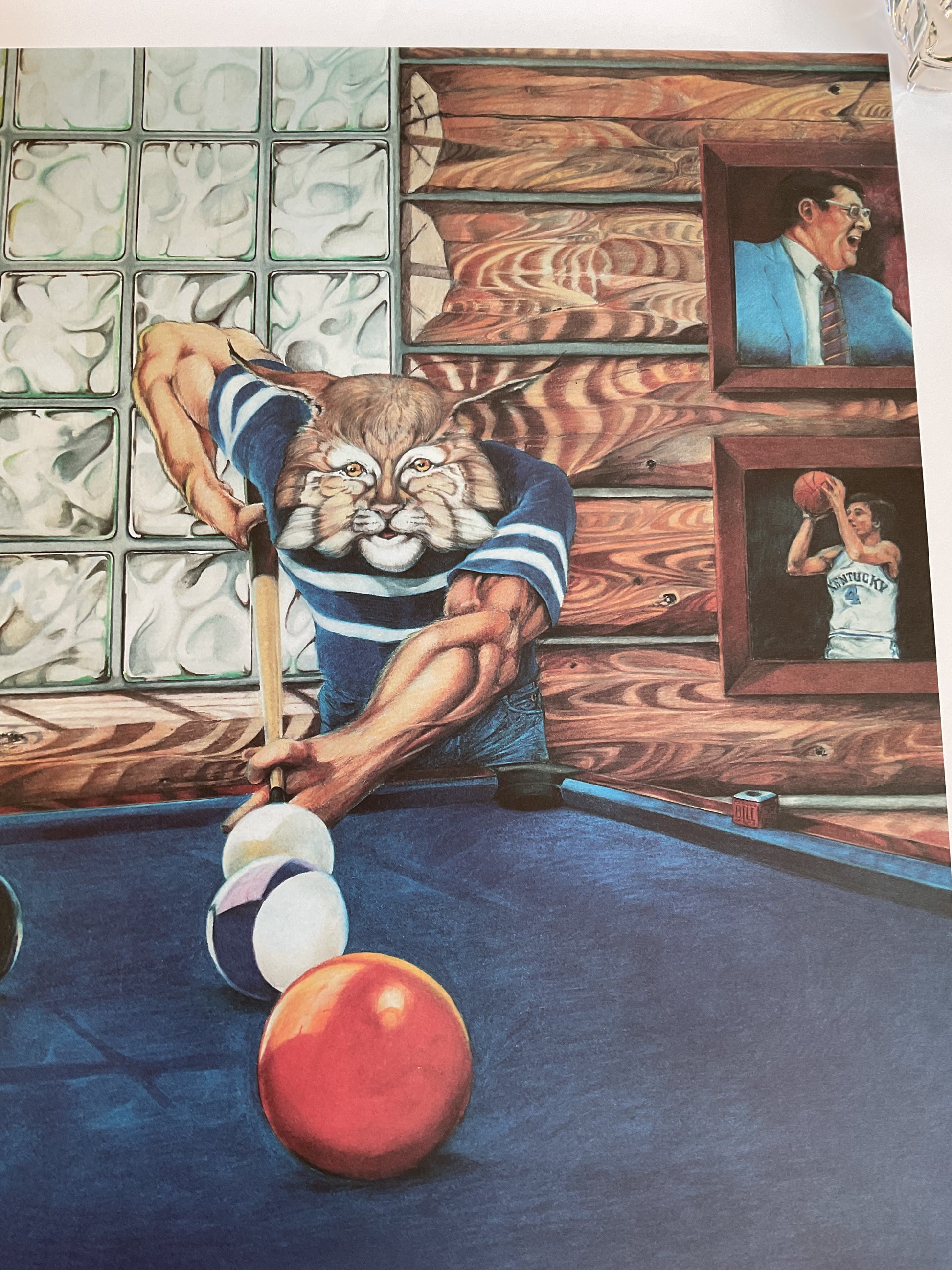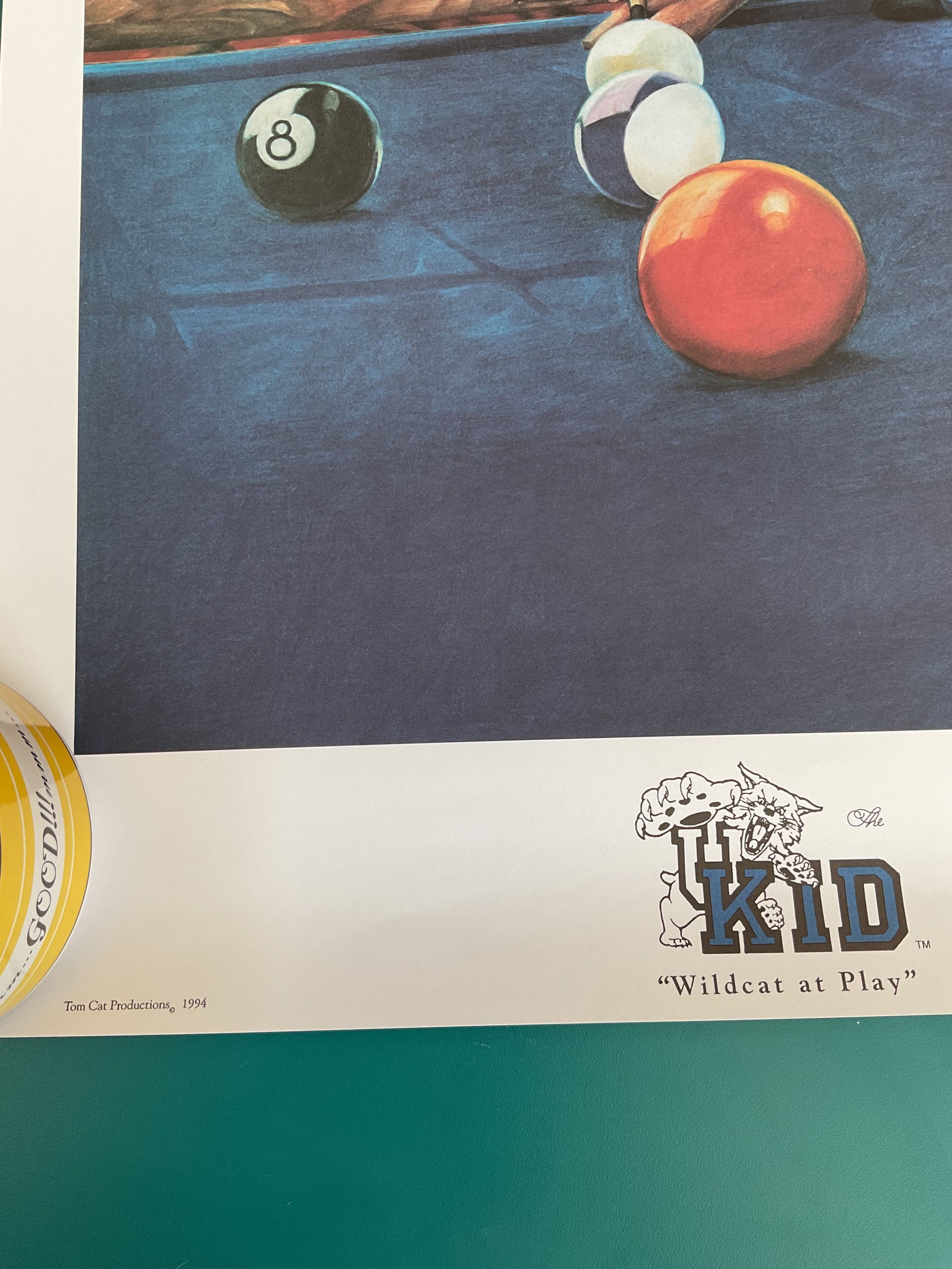These vintage University of Kentucky Posters are the perfect thing to decorate for the U of K fans. It measures 24” x 18”. It depicts a Wildcat playing pool.