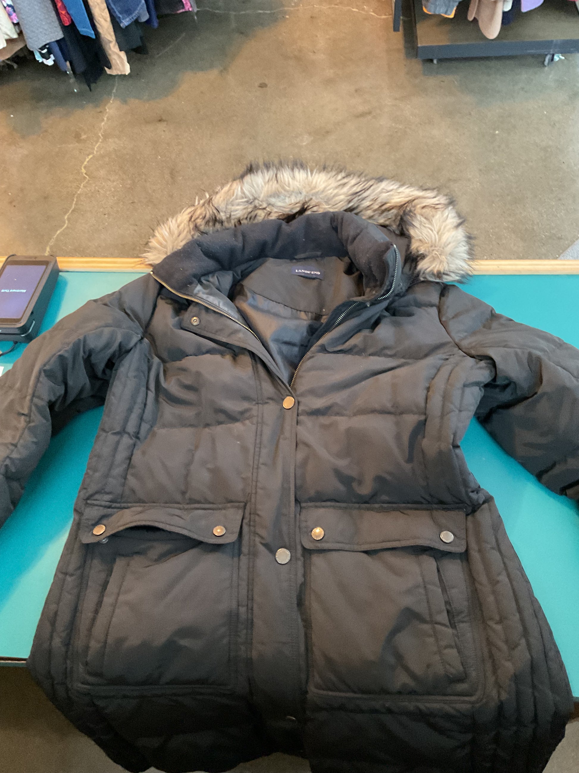Fully insulated and fleece lined winter coat with fur trim, adjustable belt, pockets, and cuff snaps. A couple little stains (included in pictures).